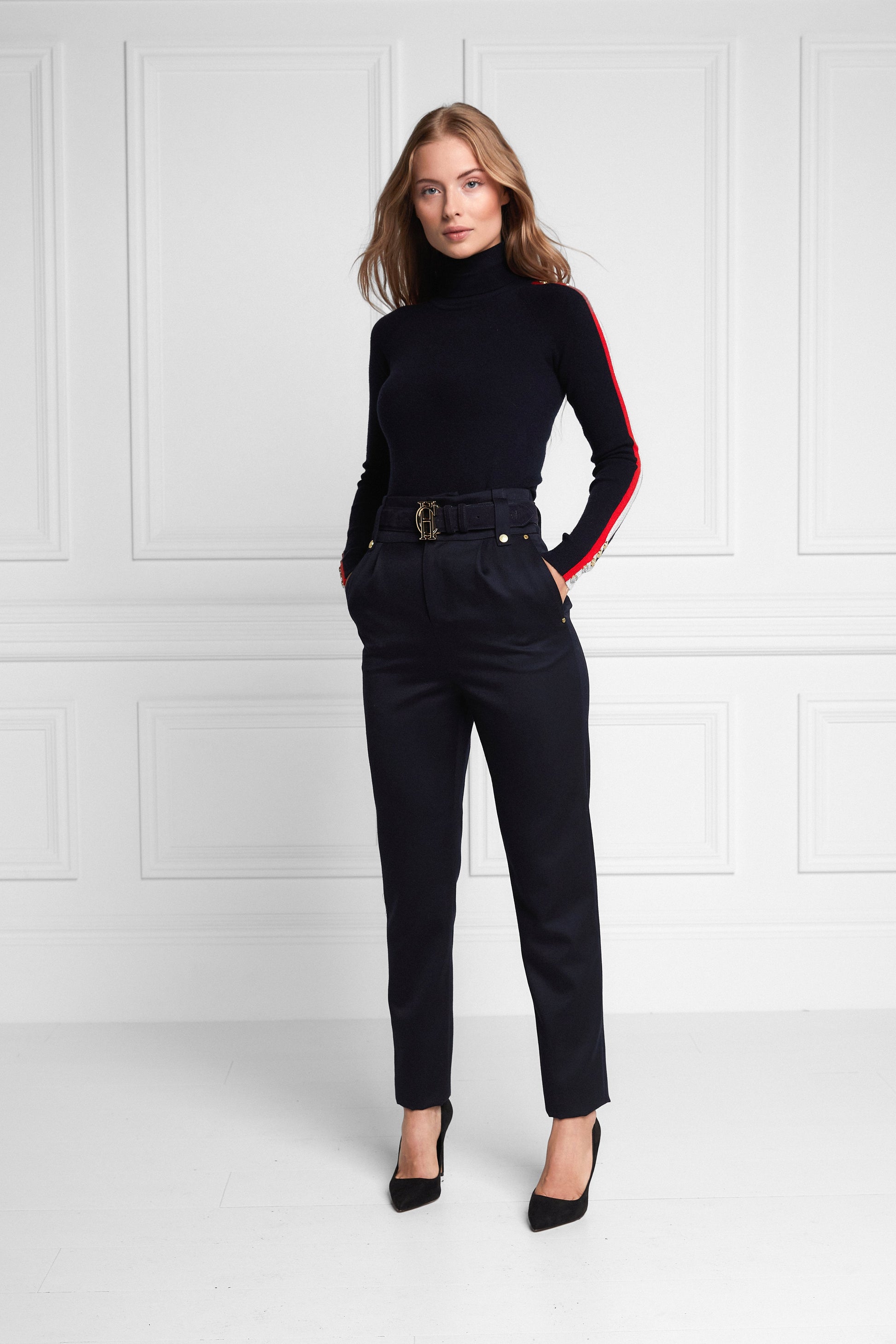 Make a statement this season in our meticulously tailored Peg Trousers for a polished. contemporary look that will effortlessly transition you from day to night. This high-waisted design has two single knife pleats implemented at the front of the trousers and are half lined for added comfort. Adorned with Holland Cooper's signature gold rivets for an added touch of prestige and luxury.