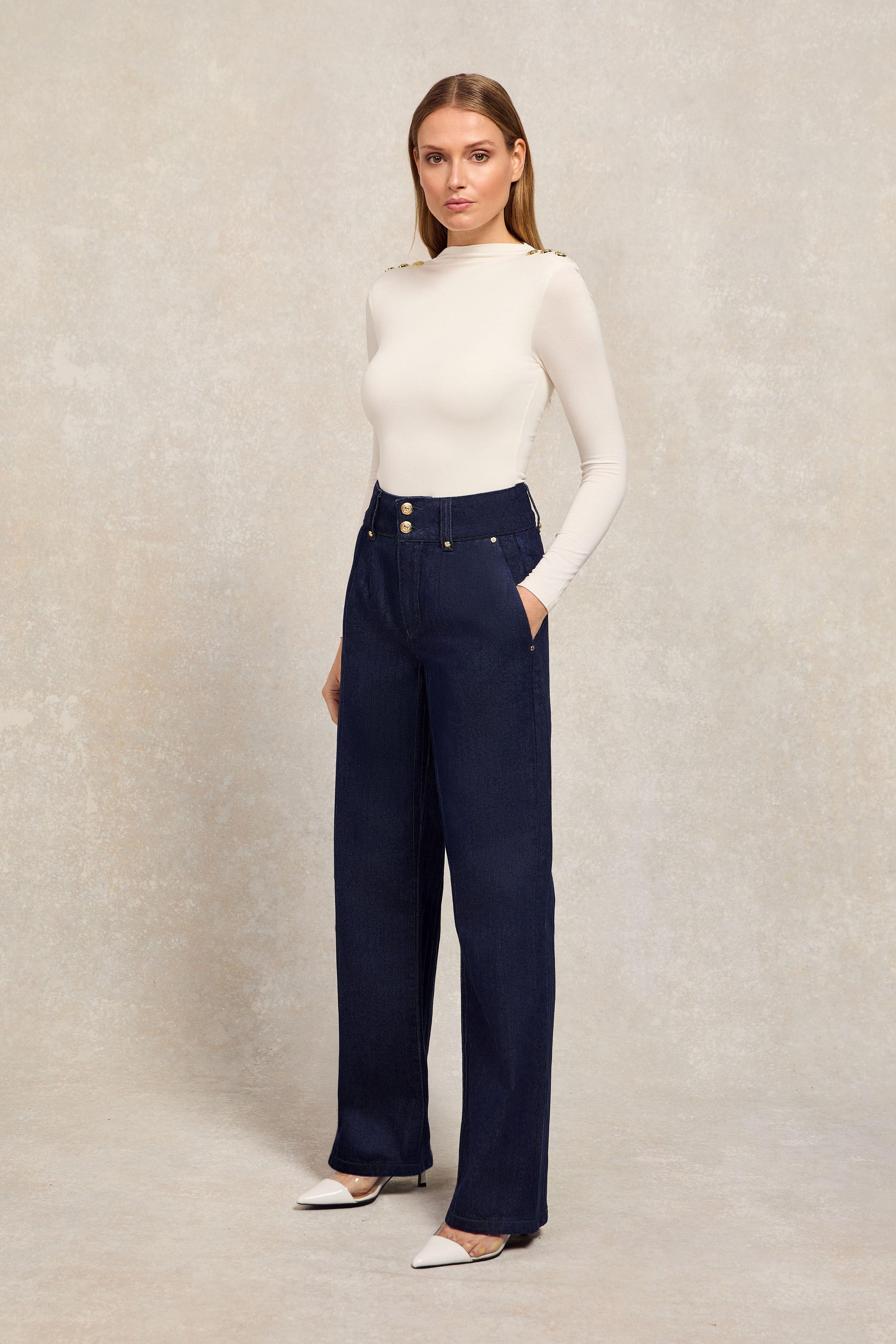 Simple and refined. these wide-leg jeans have been cut with the same silhouette as our iconic tailored trousers. Cut from soft denim with a high rise waist. the pleated fronts have been designed to create an elegant drape over the leg. Elevated with classic jean pockets and accentuated with our signature gold hardware. these jeans are the perfect combination of smart and casual.