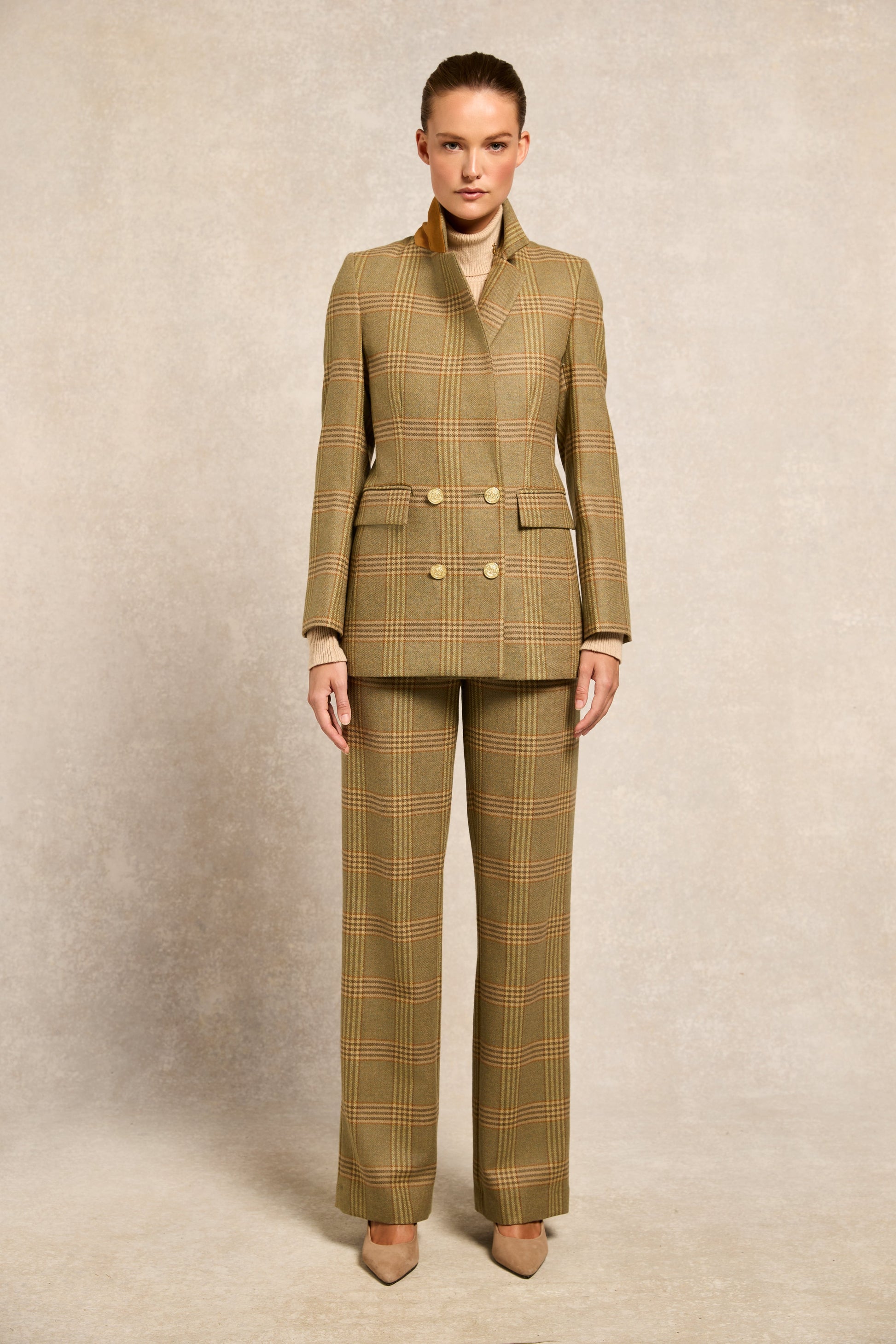 Simple and refined. these straight-leg trousers are the perfect balance of smart and casual that effortlessly take you from day to night. Made from a luxurious wool blend that's fully lined. these trousers sit high on the waist with a wide waistband to create a flattering silhouette that suits all body shapes. Featuring two large side pockets and adorned with our iconic gold hardware for an added touch of luxury. These trousers have been hand cut and made in England using wool woven in the UK.