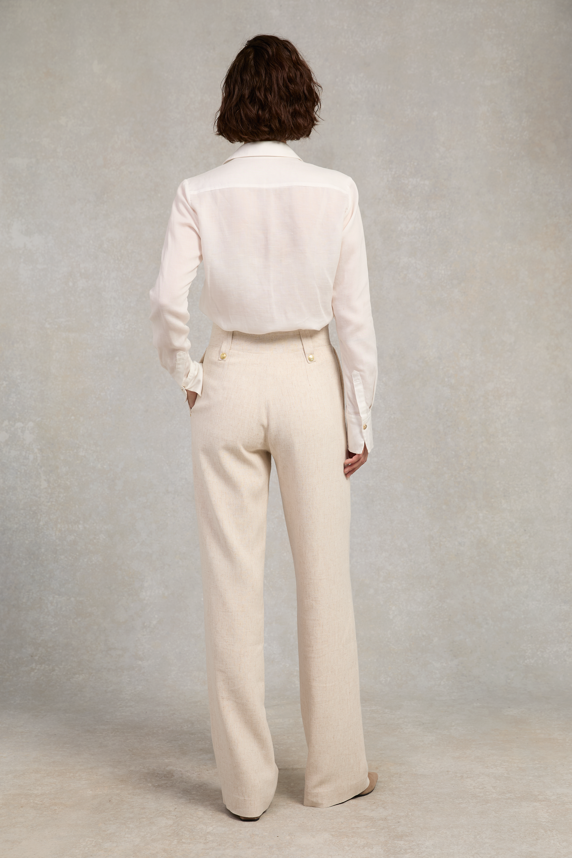 Effortlessly refined. these straight-leg trousers are a summer staple designed to bland ease with elegance. Crafted from a lightweight. crease-resistant linen blend. they offer breathability without compromising on structure. Sitting high on the waist with a wide waistband. the flattering silhouette is complemented by two side pockets and finished with our signature gold hardware for a subtle touch of luxury.