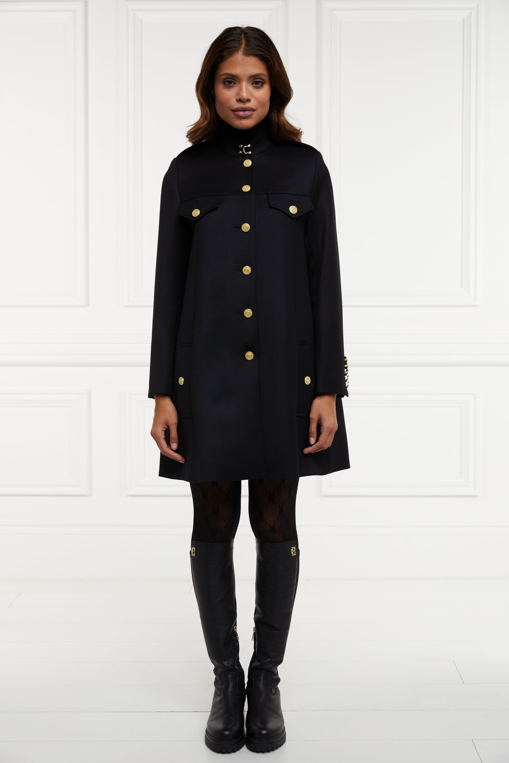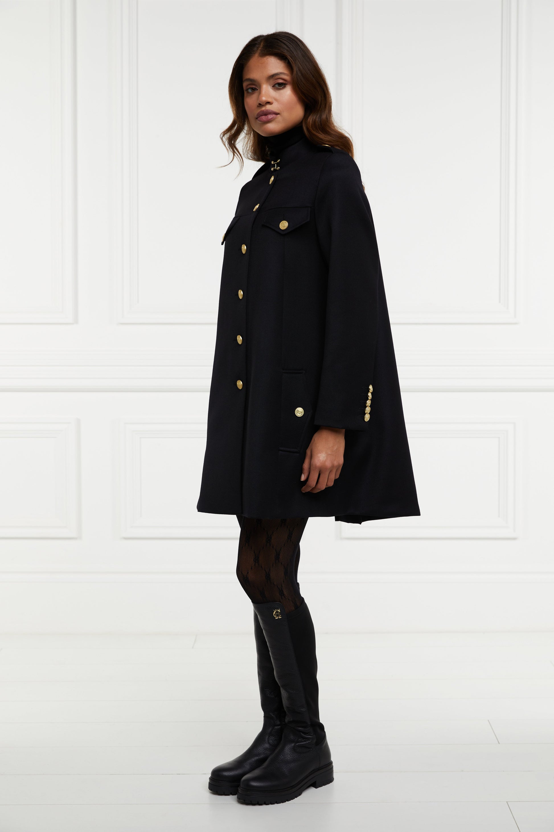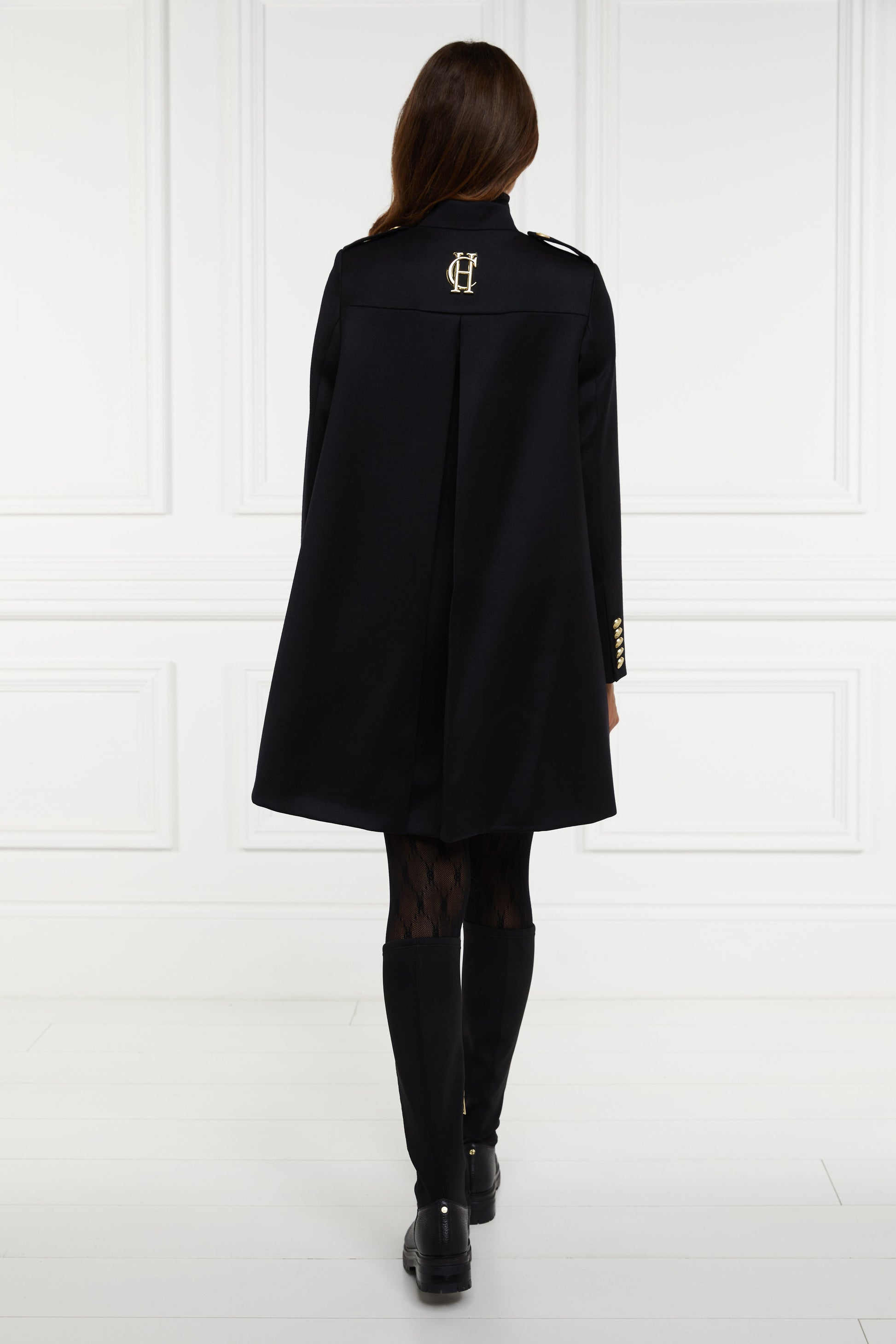 A hybrid between a cape and a jacket. the Highbury Cape has been entirely handmade in the UK. Designed to fit like a cape with an easy fit and elegant drape. the tailored sleeves create a sophisticated silhouette. With a wide inverted box pleat with side-entry pockets. the piece has been detailed with a high neck hook and eye closure. Style note: This piece is perfectly bump-friendly.