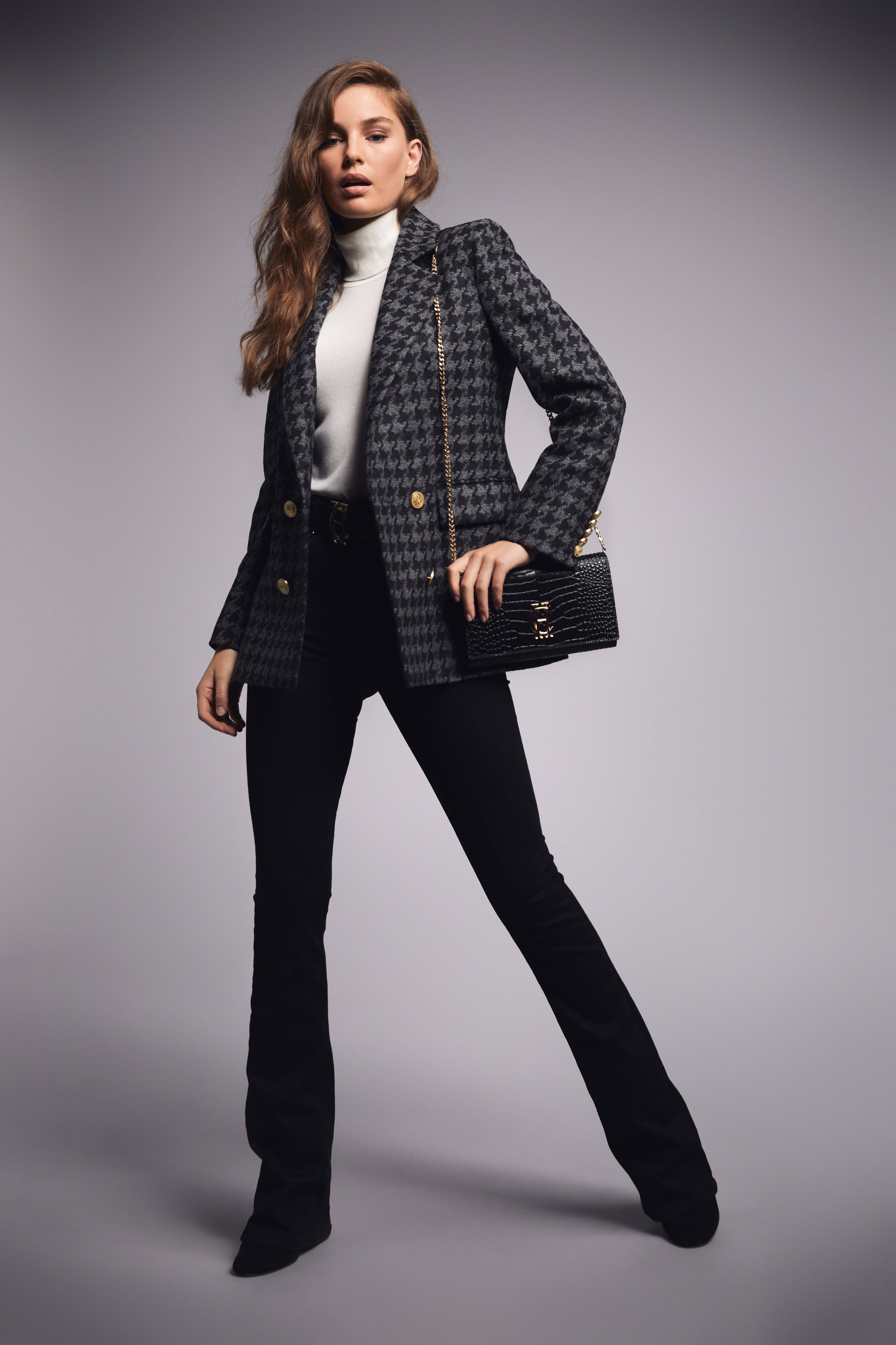A timeless accessory centred around our HC hardware. this bag has been made from croc-embossed leather. With a detachable chain strap with a leather top panel. this bag sits comfortably on the shoulder or as a handheld piece. Fully branded with our iconic HC finishes. and internal zip pocket and card slots.
