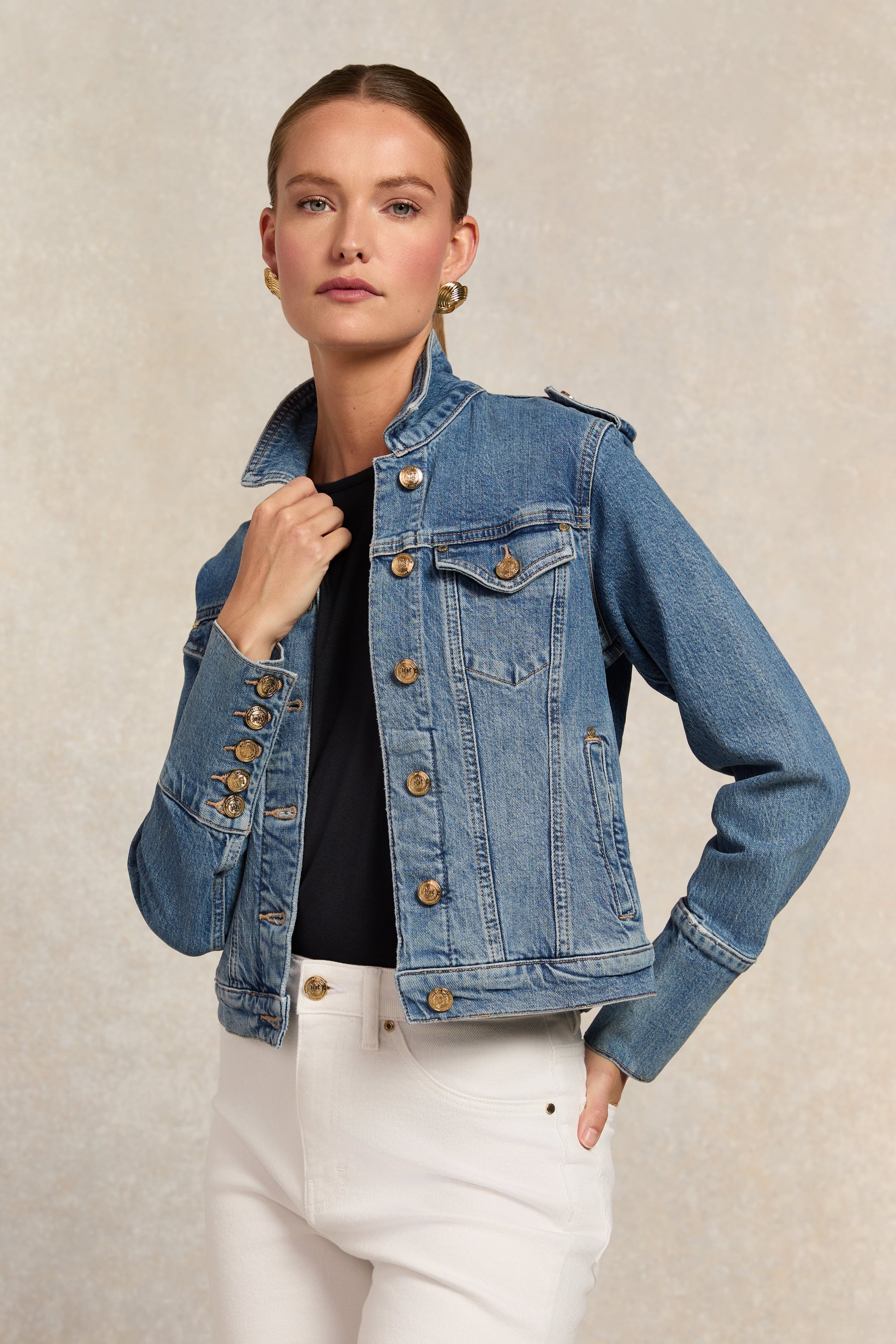 Designed with a classic 80's style. this jacket has been created from a comfortable stretch denim. Perfect for layering. this jacket has been detailed with a flap chest pocket. deep cuffs and our iconic hardware. Finished with our new leather jacron to the back.