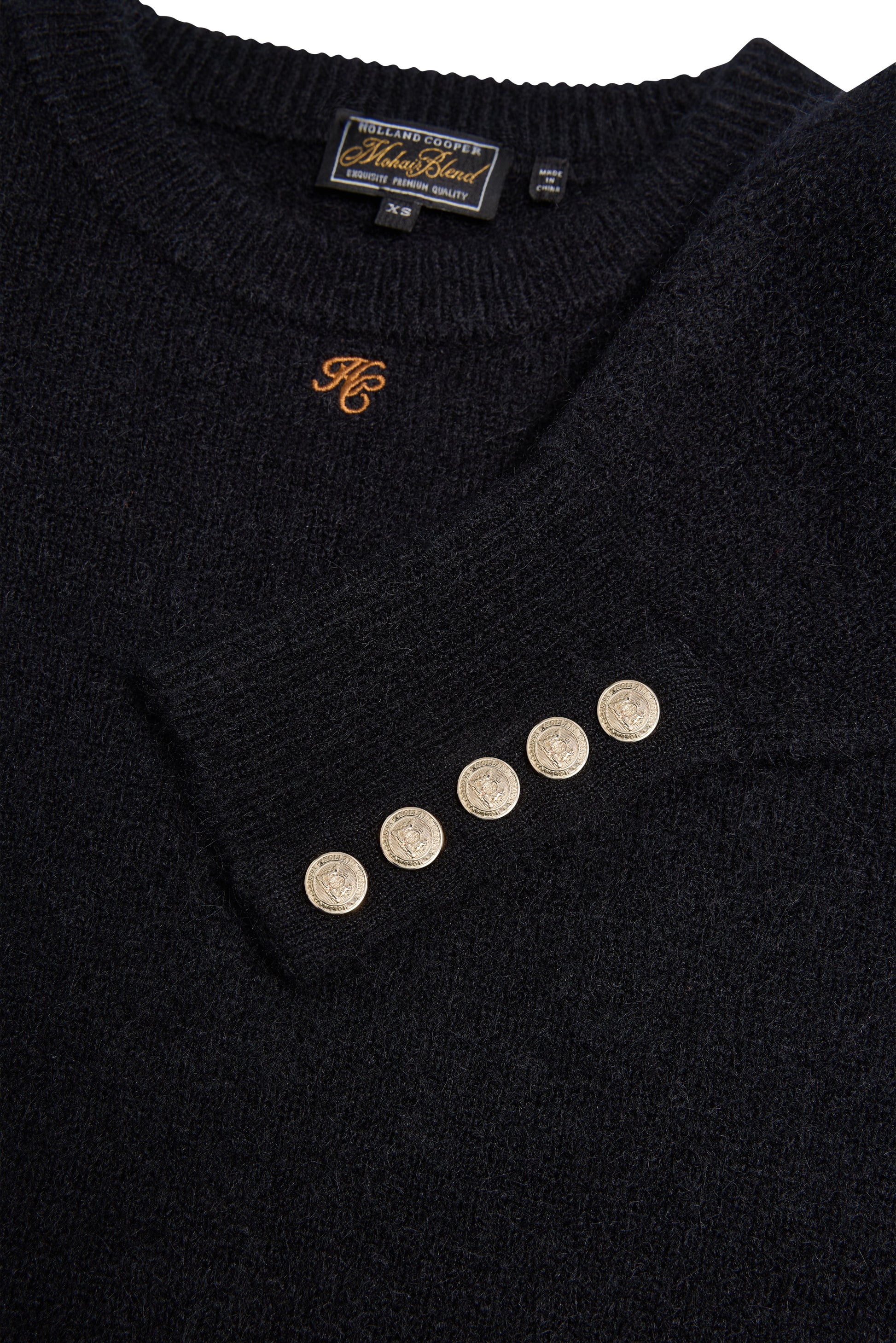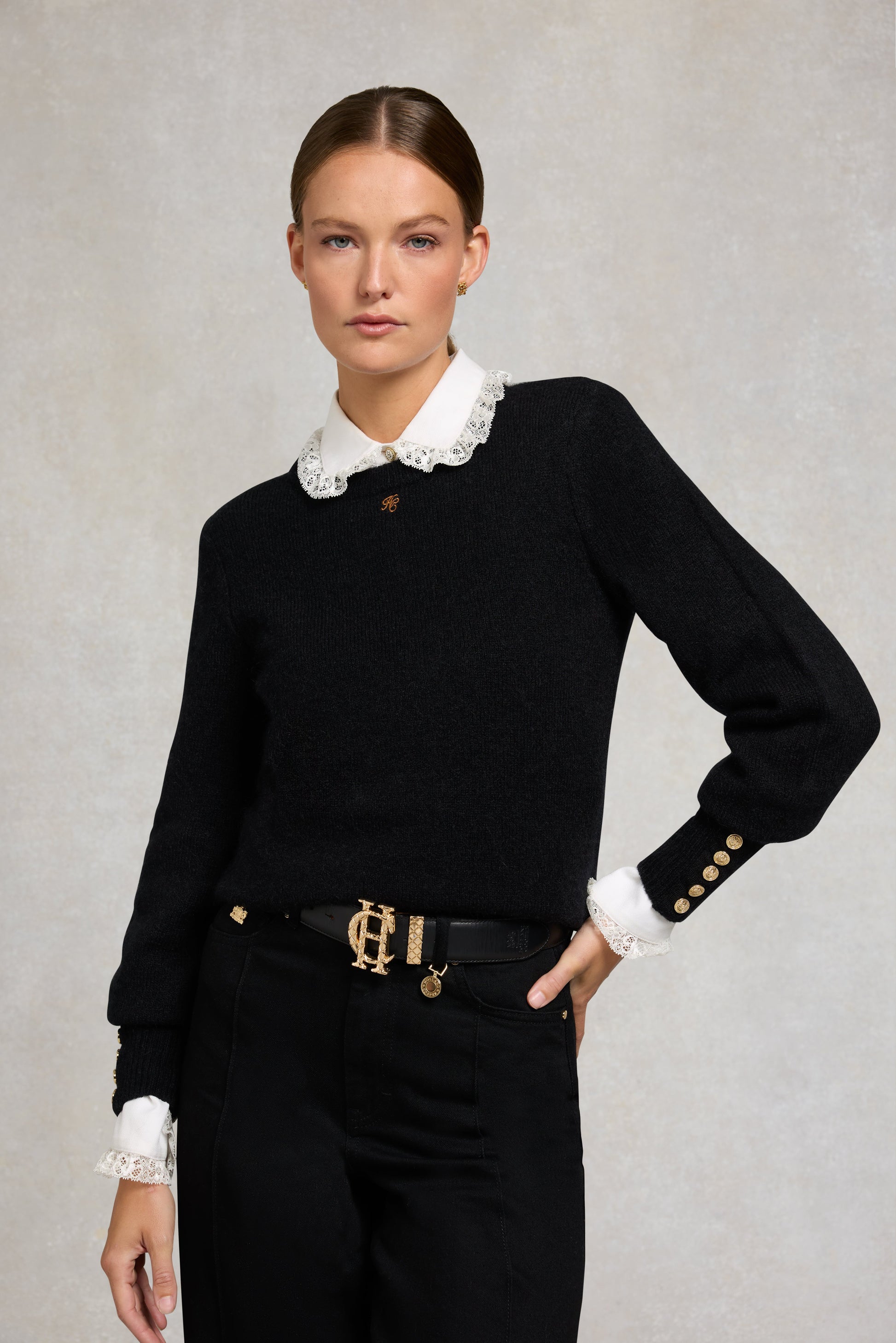 Expertly crafted from a sumptuous blend. this knit offers an exquisite softness and a gentle stretch that molds to your silhouette. The slim-fitting design is elegantly punctuated by feature embroidery at the center back. adding a touch of bespoke charm. Blouson sleeves provide a modern twist on classic styling. while the ribbed cuffs. adorned with subtle hardware. offer a refined finish. Perfect for layering or as a standalone piece. the Isla Crew Neck Knit promises to elevate your wardrobe with its timeless appeal and sophisticated craftsmanship.