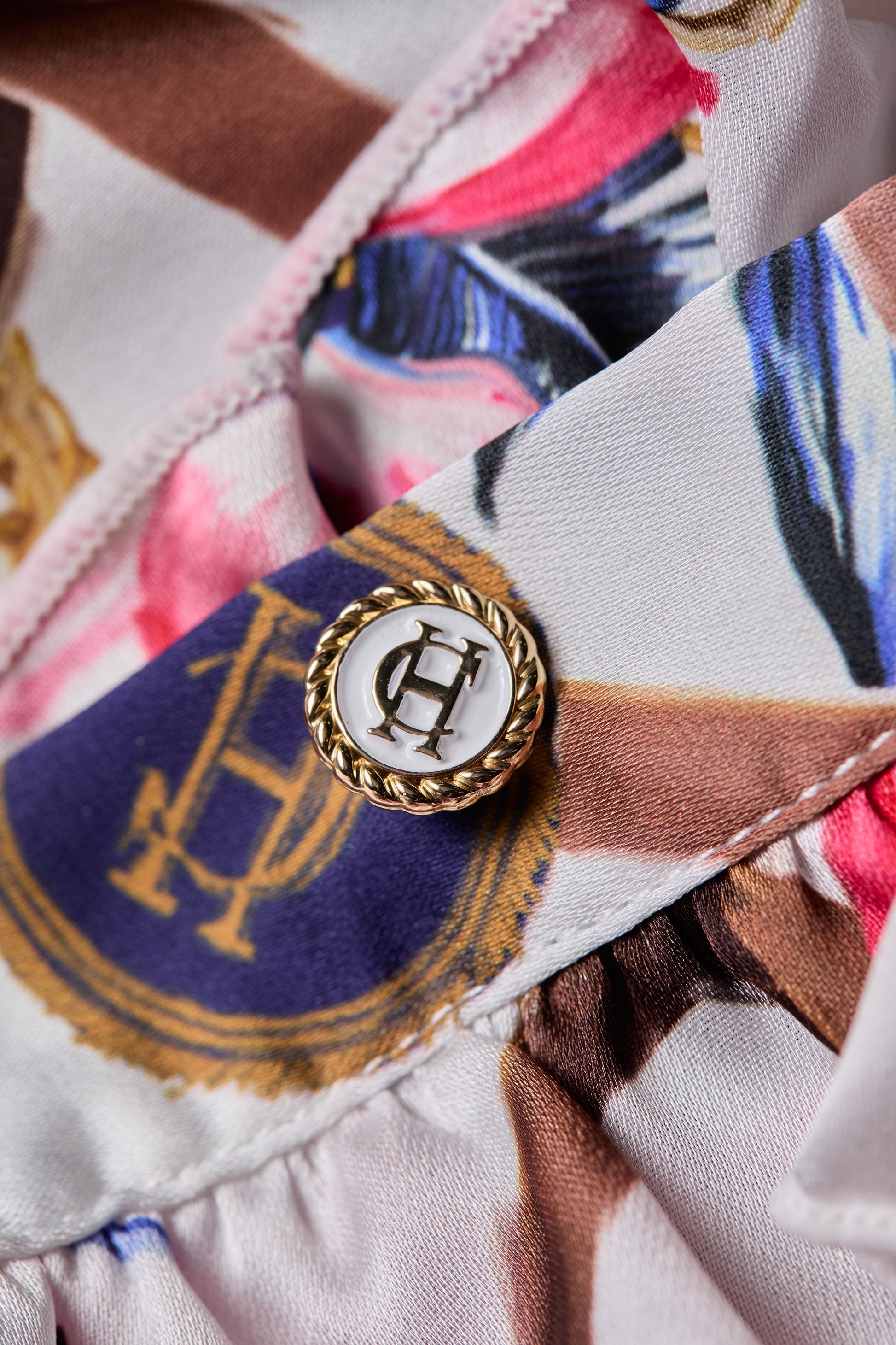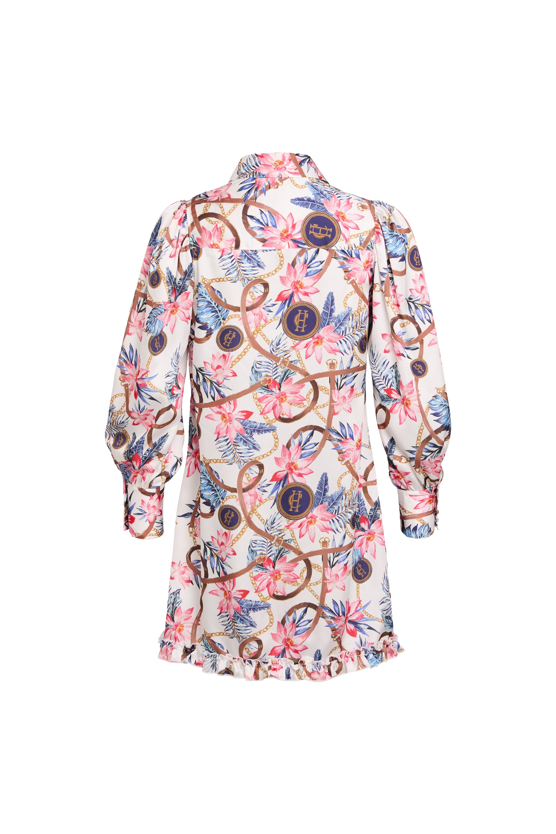 This chic mini dress features a ruffle front placket with covered button detailing. The relaxed. easy oversized shirt fit ensures comfort without compromising on style. making it an ideal choice for various occasions. Designed with a saddle-shaped hem. the hand-drawn HC print elevates this feminine piece.
