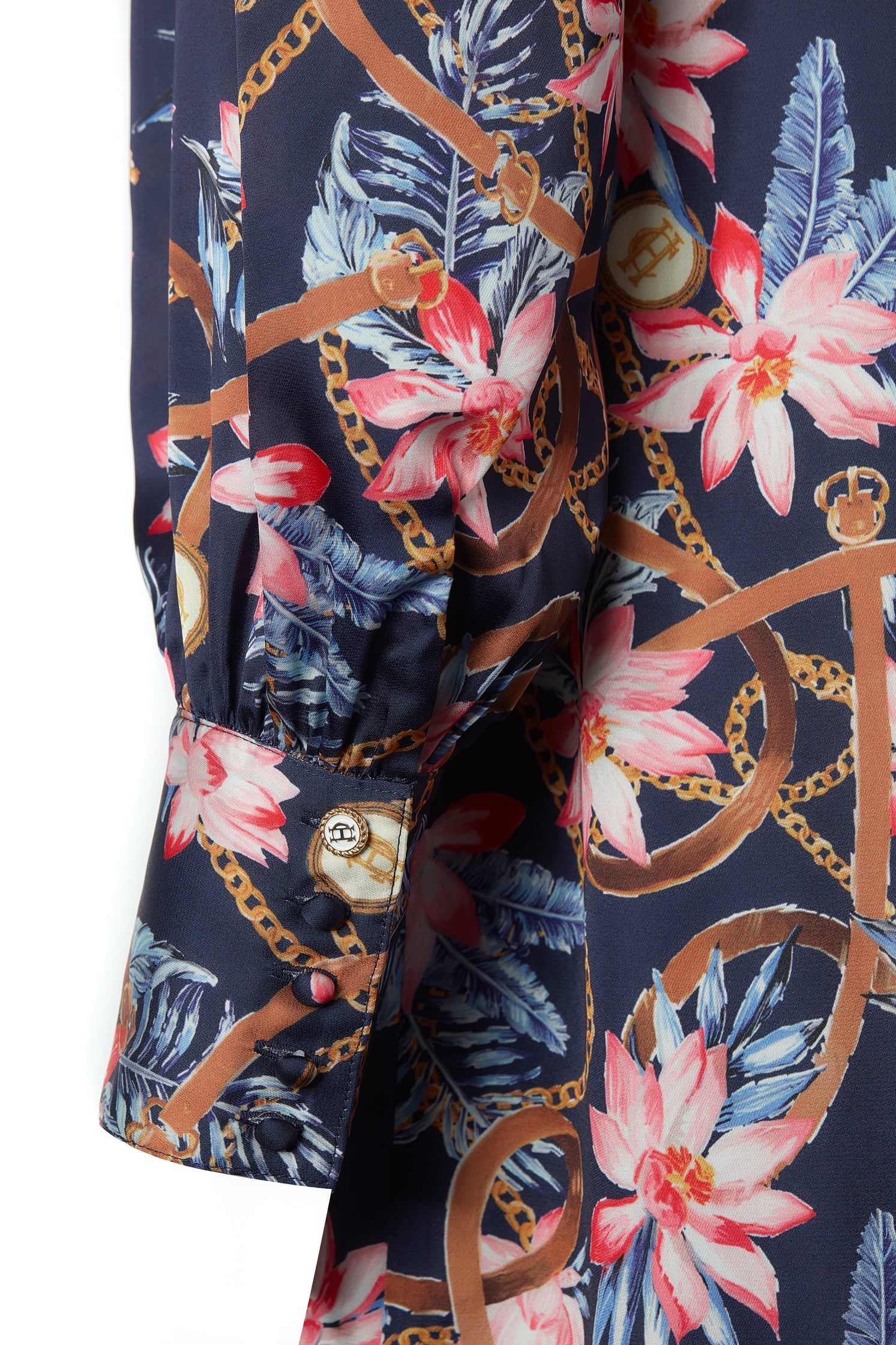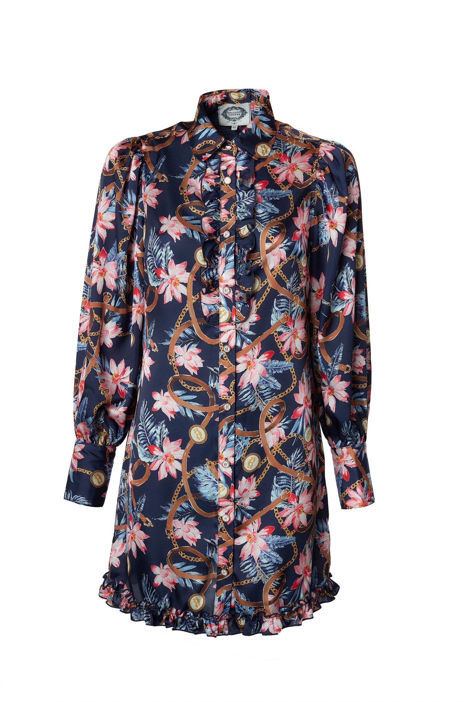 This chic mini dress features a ruffle front placket with covered button detailing. The relaxed. easy oversized shirt fit ensures comfort without compromising on style. making it an ideal choice for various occasions. Designed with a saddle-shaped hem. the hand-drawn HC print elevates this feminine piece.