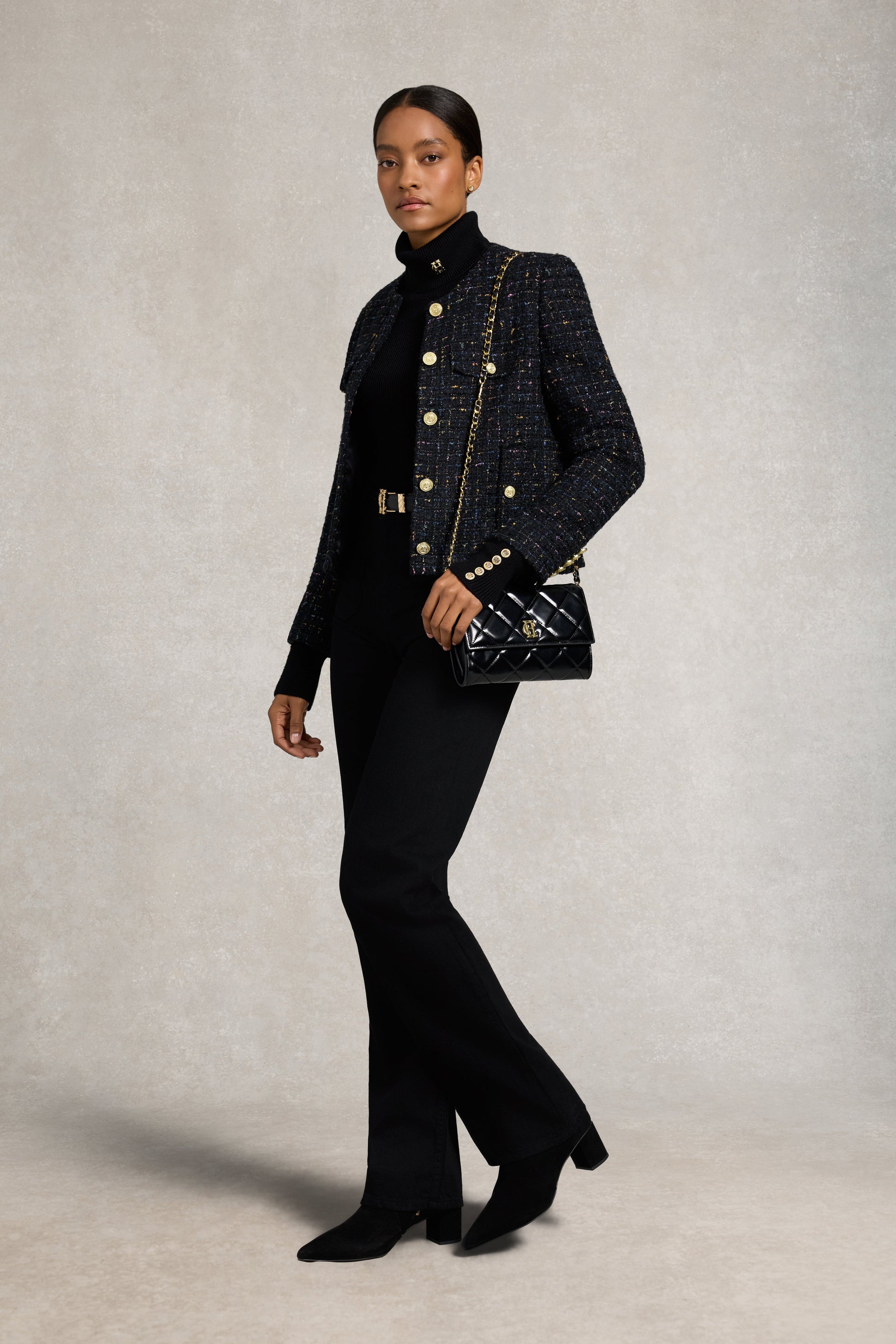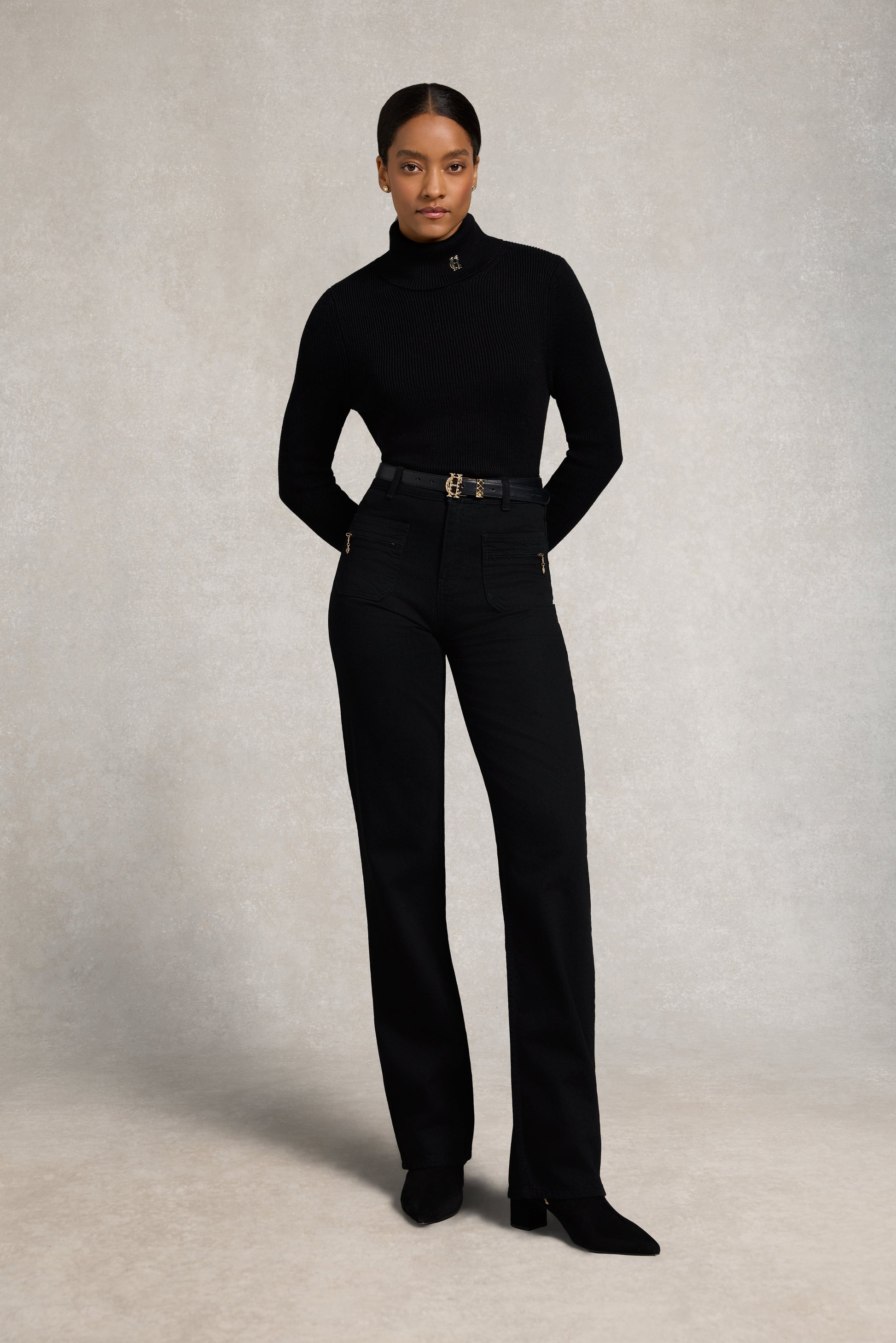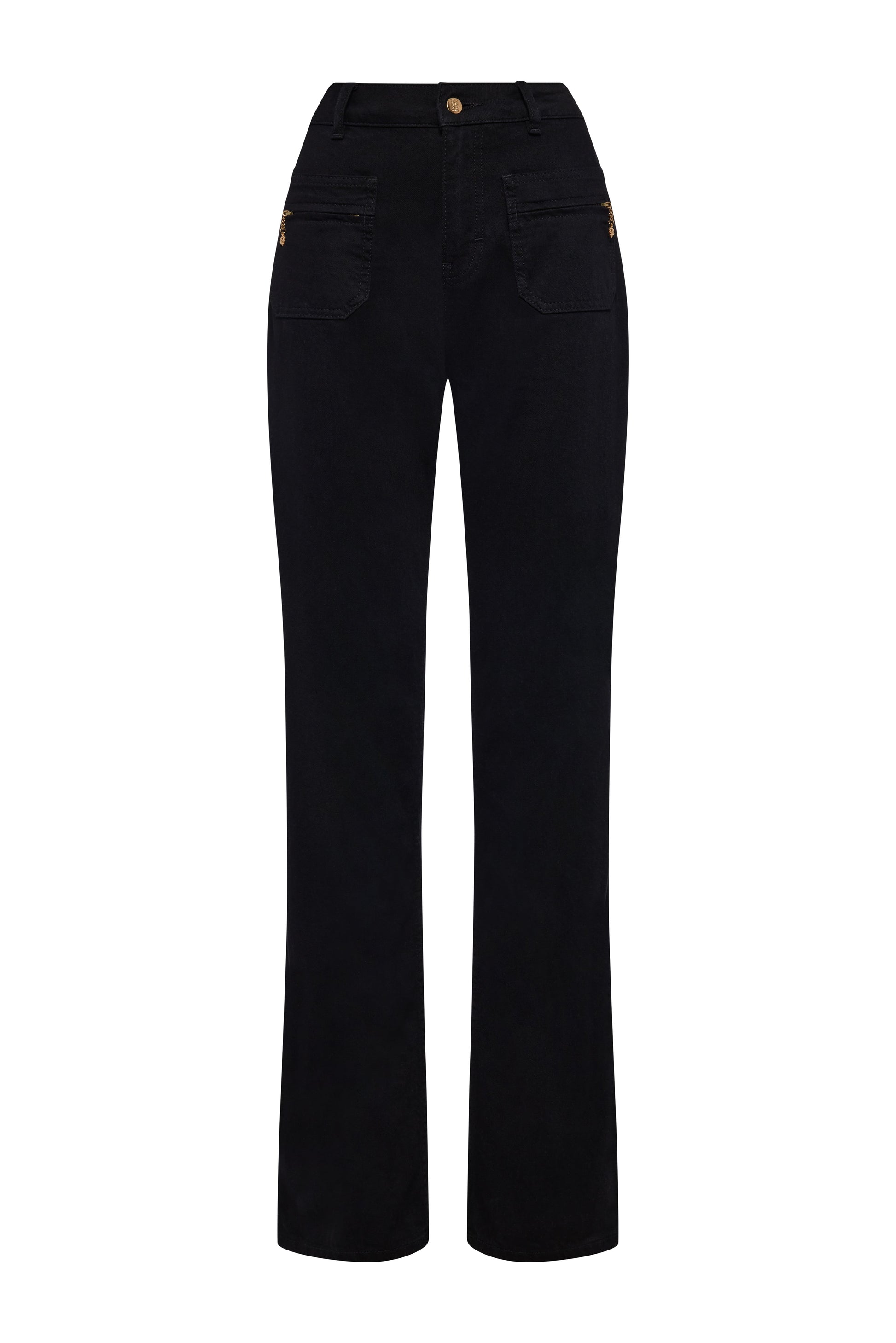 Combining classic structure with elevated detailing. the Jessica Straight Jean is designed with a high-rise waist and a subtle wide leg for a flattering. modern silhouette. Front patch pockets feature functional zip fastenings. complemented by rear patch pockets and finished with domed crested buttons. Crafted with signature gold metal hardware throughout. this style is a timeless wardrobe staple with a refined edge.
