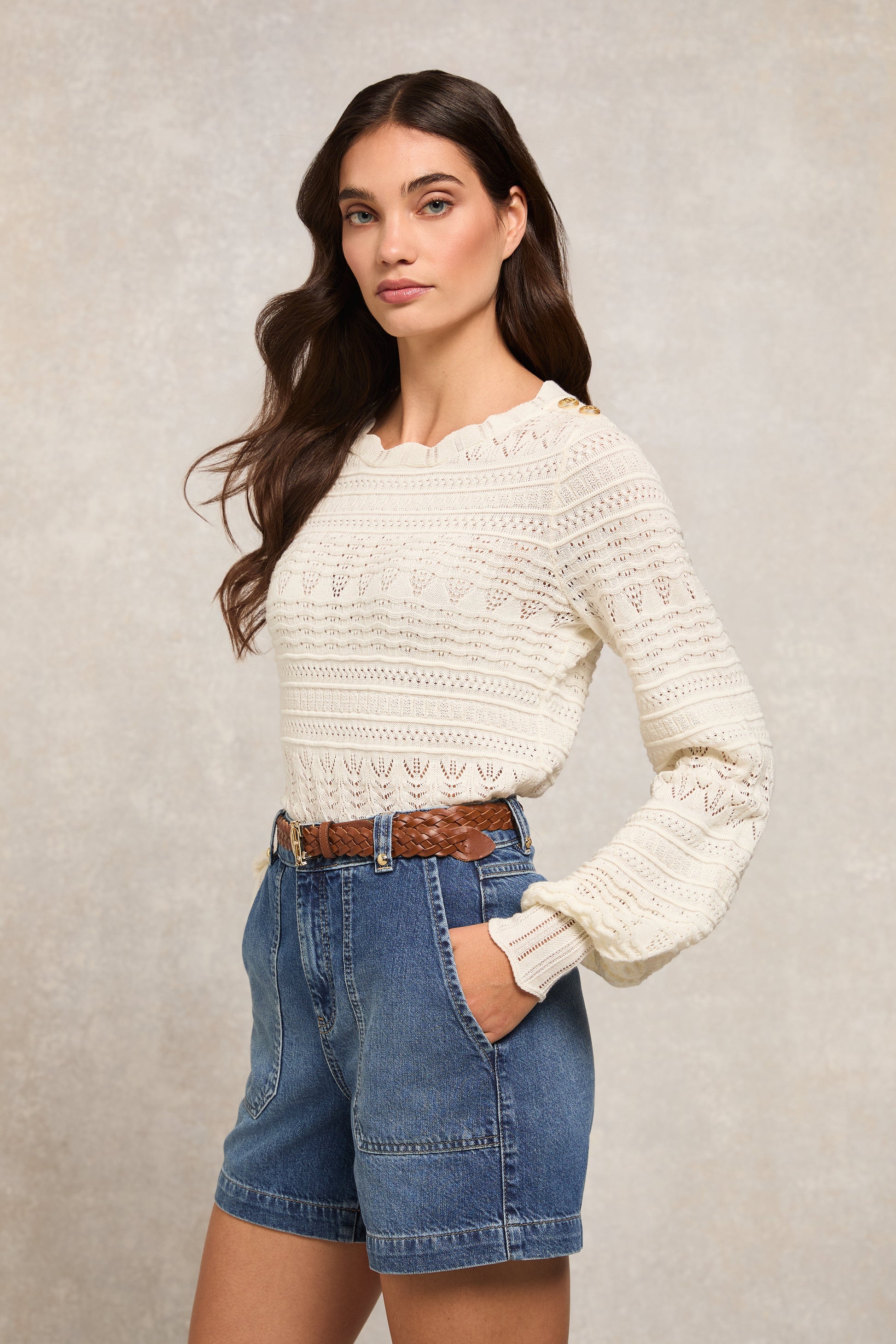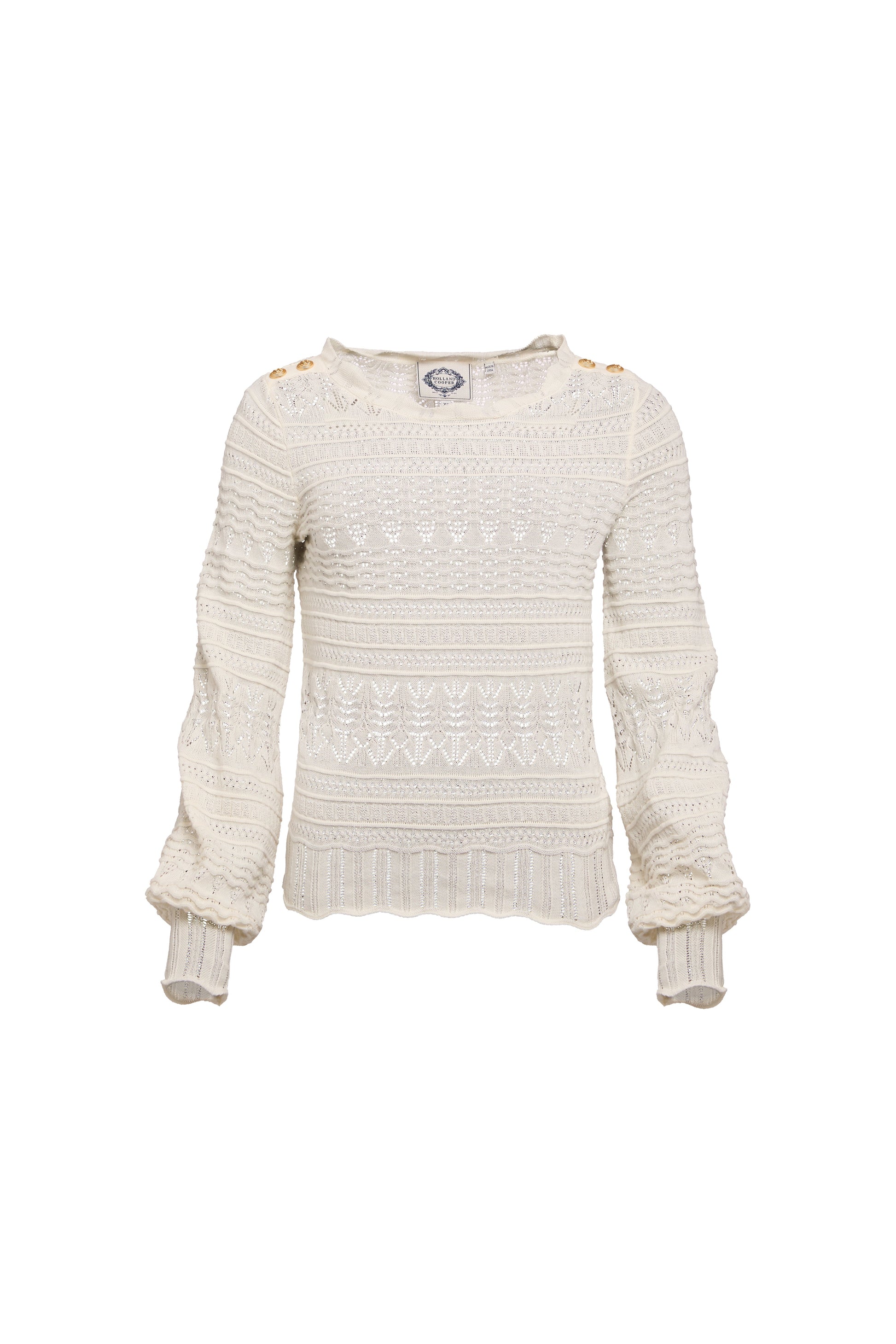 This exquisite piece features a classic crew neck and is adorned with delicate pointelle stitching. adding a touch of elegance to its overall simplicity. The lightweight design ensures breathability. while the blouson sleeves offer a modern twist on a relaxed fit. Ideal for layering or as a standalone statement. the Kelsie is a versatile addition to any wardrobe. promising to keep you effortlessly chic in any setting.