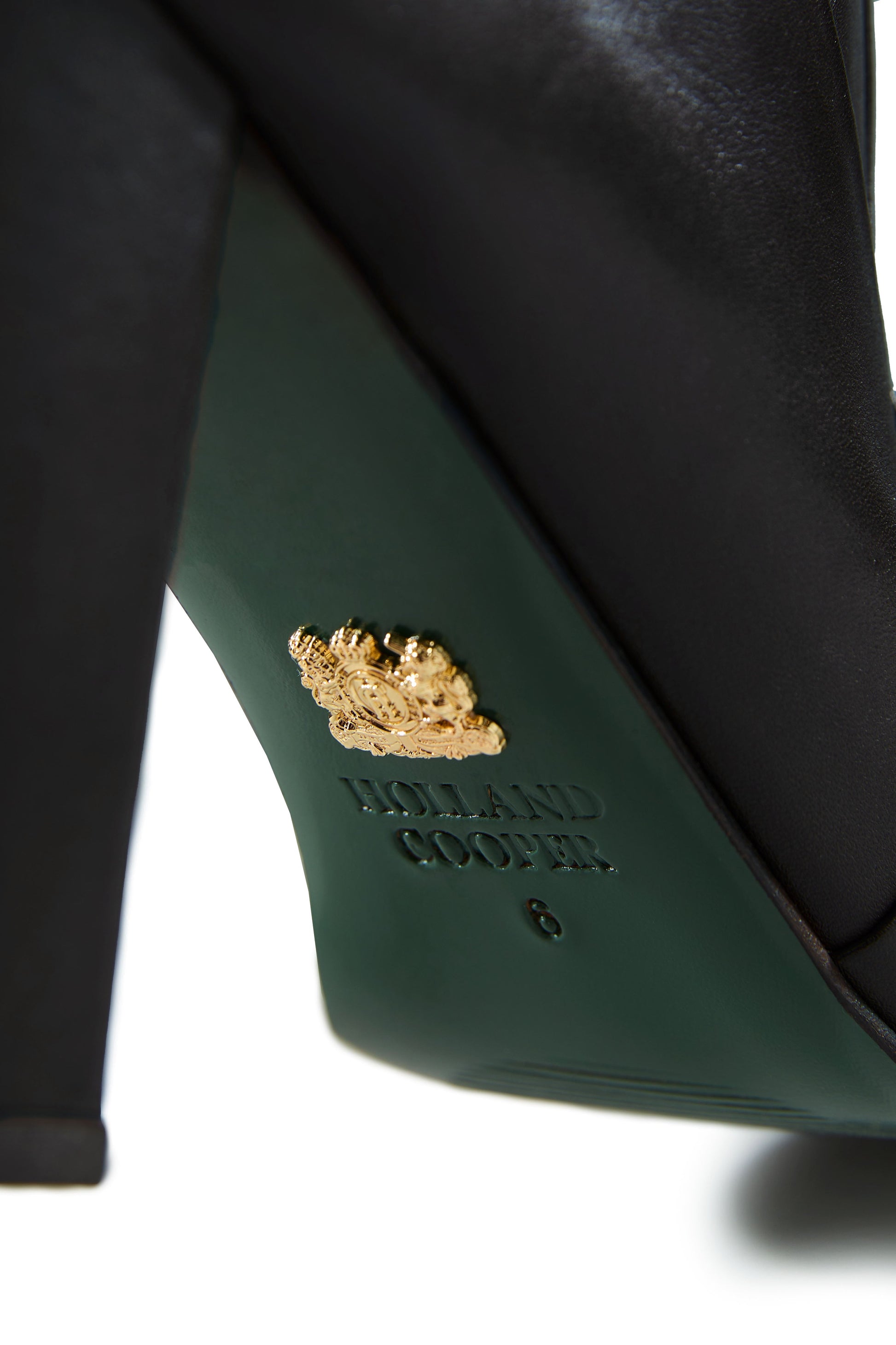 A timeless classic. updated for the season. This elegant pull-on style features a comfortable chunky heel and our signature HC branding for a touch of sophistication. Designed with an internal elastic gusset for a perfect fit and ease of wear. it boasts a clean outsole finished with our classic racing green lacquer. Ideal for regular calf widths. the Kensington Knee Boot combines style. comfort. and functionality for a versatile addition to your wardrobe.