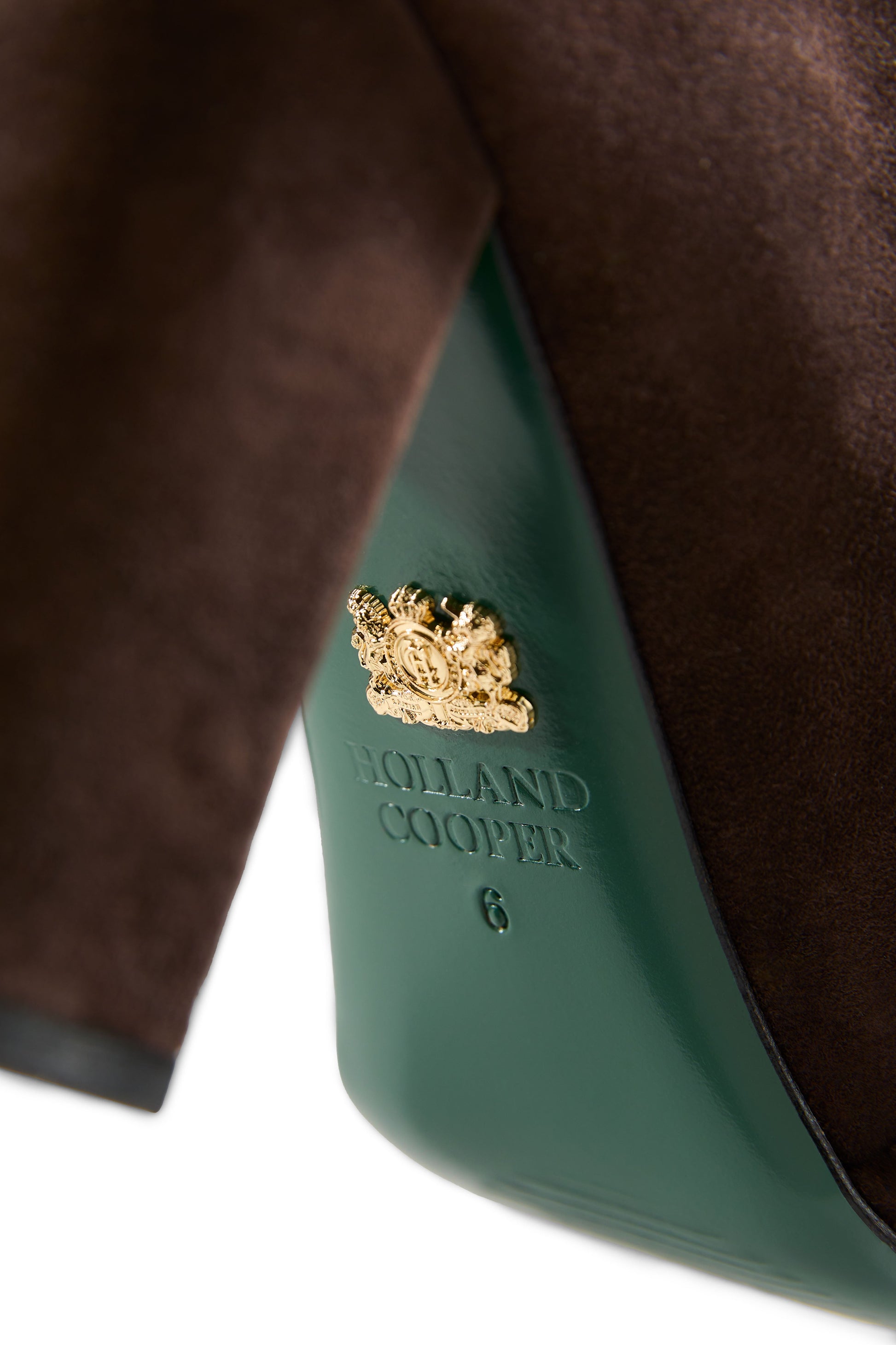 A timeless classic. updated for the season. This elegant pull-on style features a comfortable chunky heel and our signature HC branding for a touch of sophistication. Designed with an internal elastic gusset for a perfect fit and ease of wear. it boasts a clean outsole finished with our classic racing green lacquer. Ideal for regular calf widths. the Kensington Knee Boot combines style. comfort. and functionality for a versatile addition to your wardrobe.
