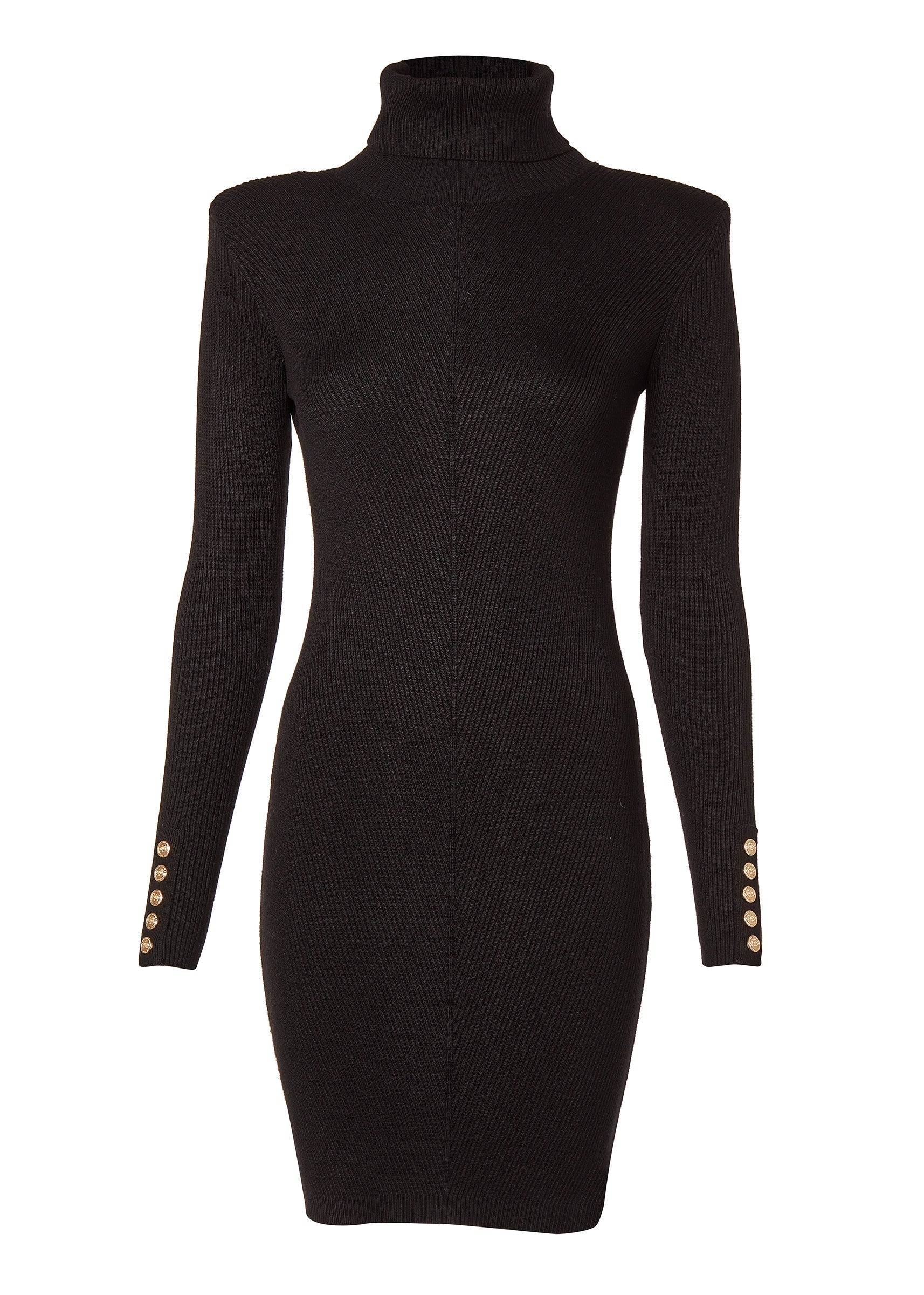 A striking piece designed to enhance your silhouette with its body-contouring fit. Featuring a high roll neck collar. this mini dress exudes sophistication and modern style. The ribbed fabric construction ensures a flattering. sculpted look. while the shoulder pads are enhanced with the added detail of signature rivets. giving the dress a unique and contemporary touch.
