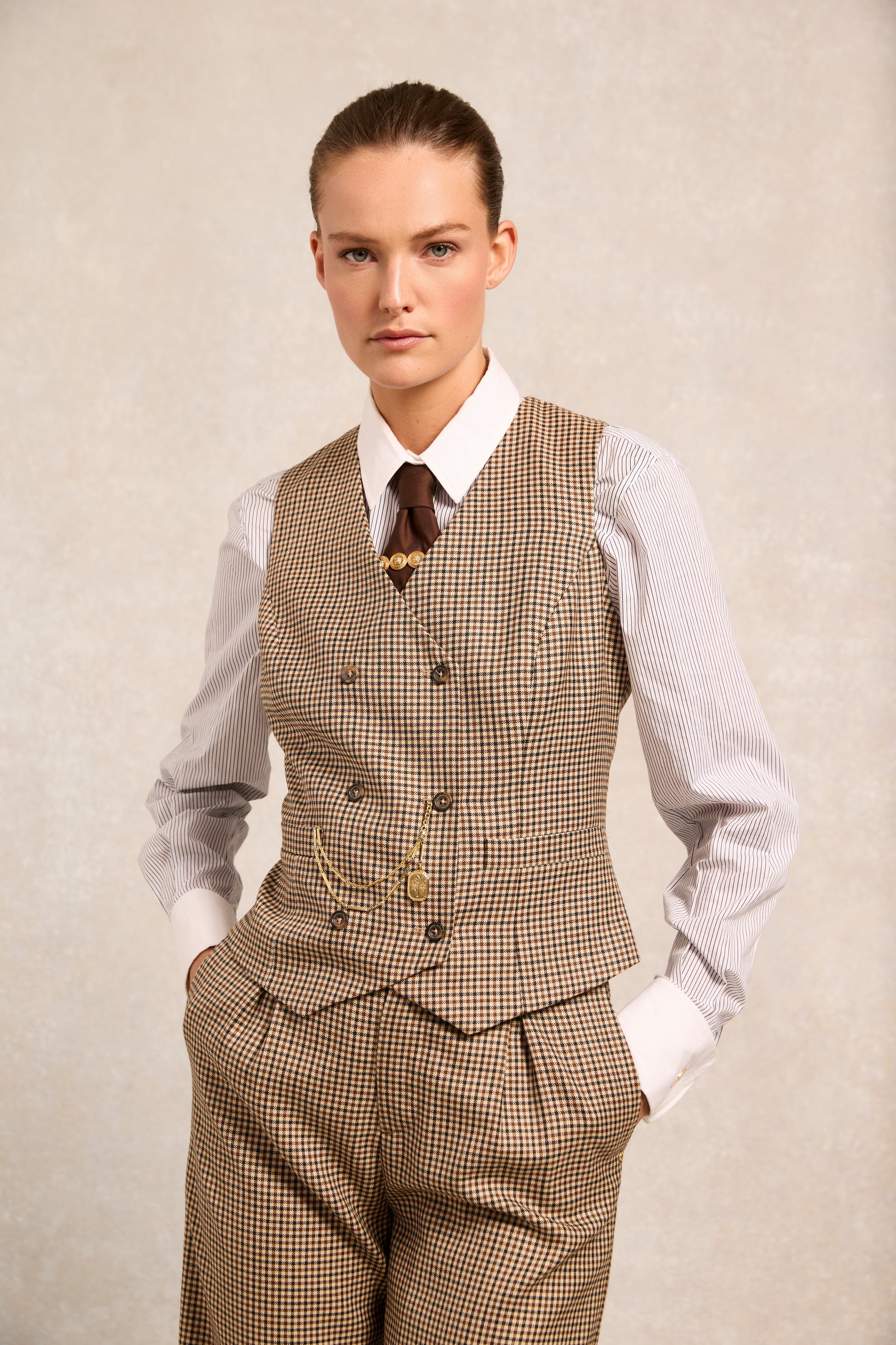 Both classic and refined. this waistcoat offers a slim tailored fit with a skimming v-neckline and elegantly shaped hem. A classic wardrobe staple with traditional suiting details. neat welted pockets. satin lining and a darted front. the back adjuster allows for a personalised fit. Subtly detailed with HC horn buttons. Looks great simply paired with matching trousers. as a layering piece. or as part of a 3 piece suit. Proudly hand cut and made in England using wools woven in the UK.