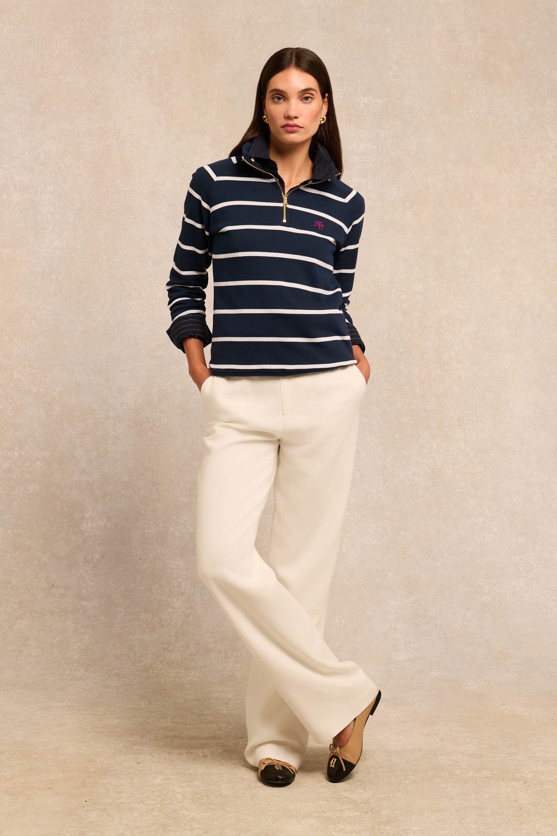 The Kingham Quarter Zip Sweat is crafted from soft cotton loopback jersey for all-day comfort with a premium feel. Featuring classic breton stripes. this piece blends heritage influence with contemporary style. The ¼ zip neckline allows for versatile layering. while the contrast chest embroidery adds a refined touch of branding.