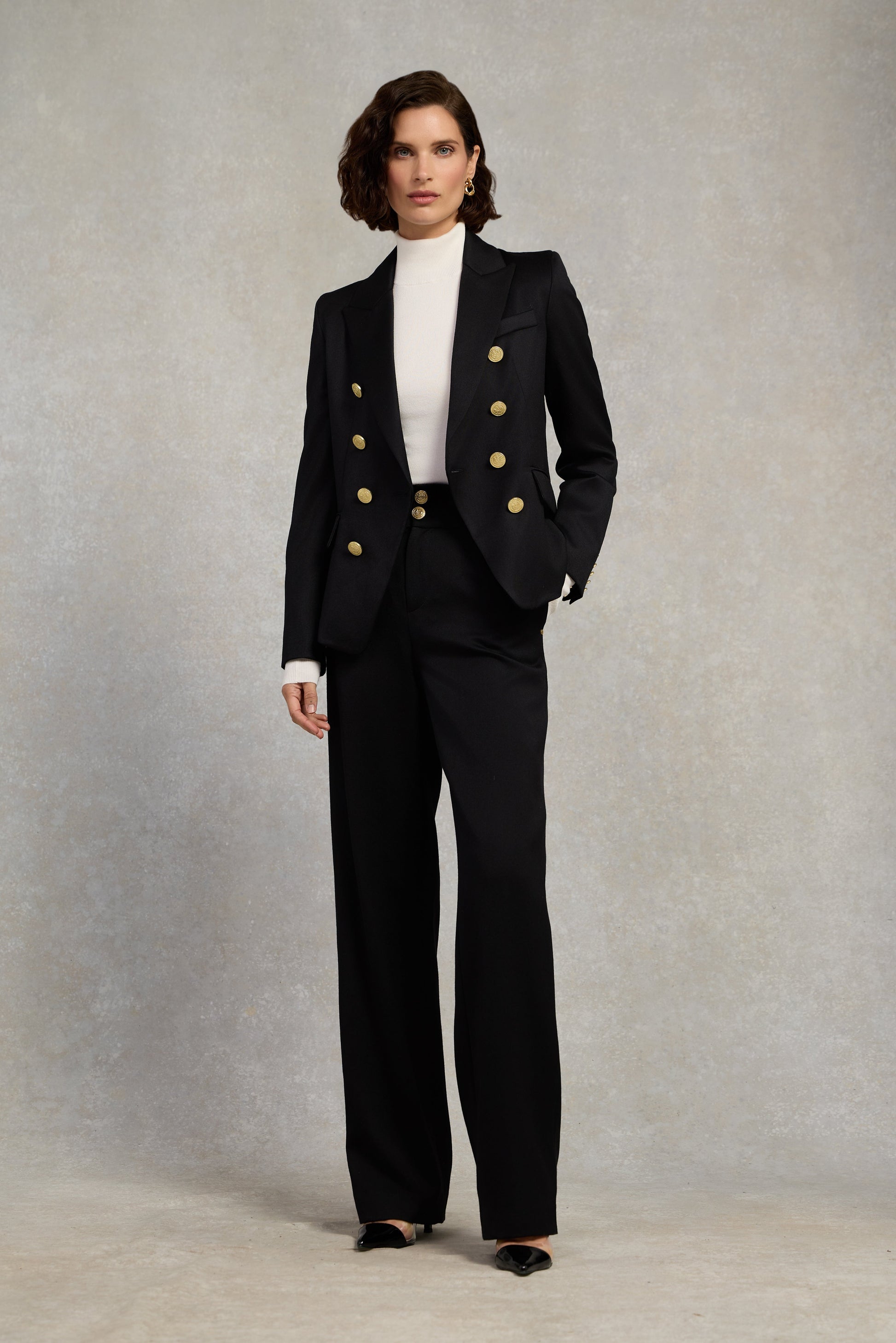 This double breasted blazer is a chic transeasonal wardrobe essential. Designed to create a sharp tailored silhouette worn open or closed. Fully lined with a luxury stretch lining for extra comfort and adorned with HC signature Gold buttons on the front and cuffs. This blazer has been hand cut and made entirely in England using wools woven in the UK.