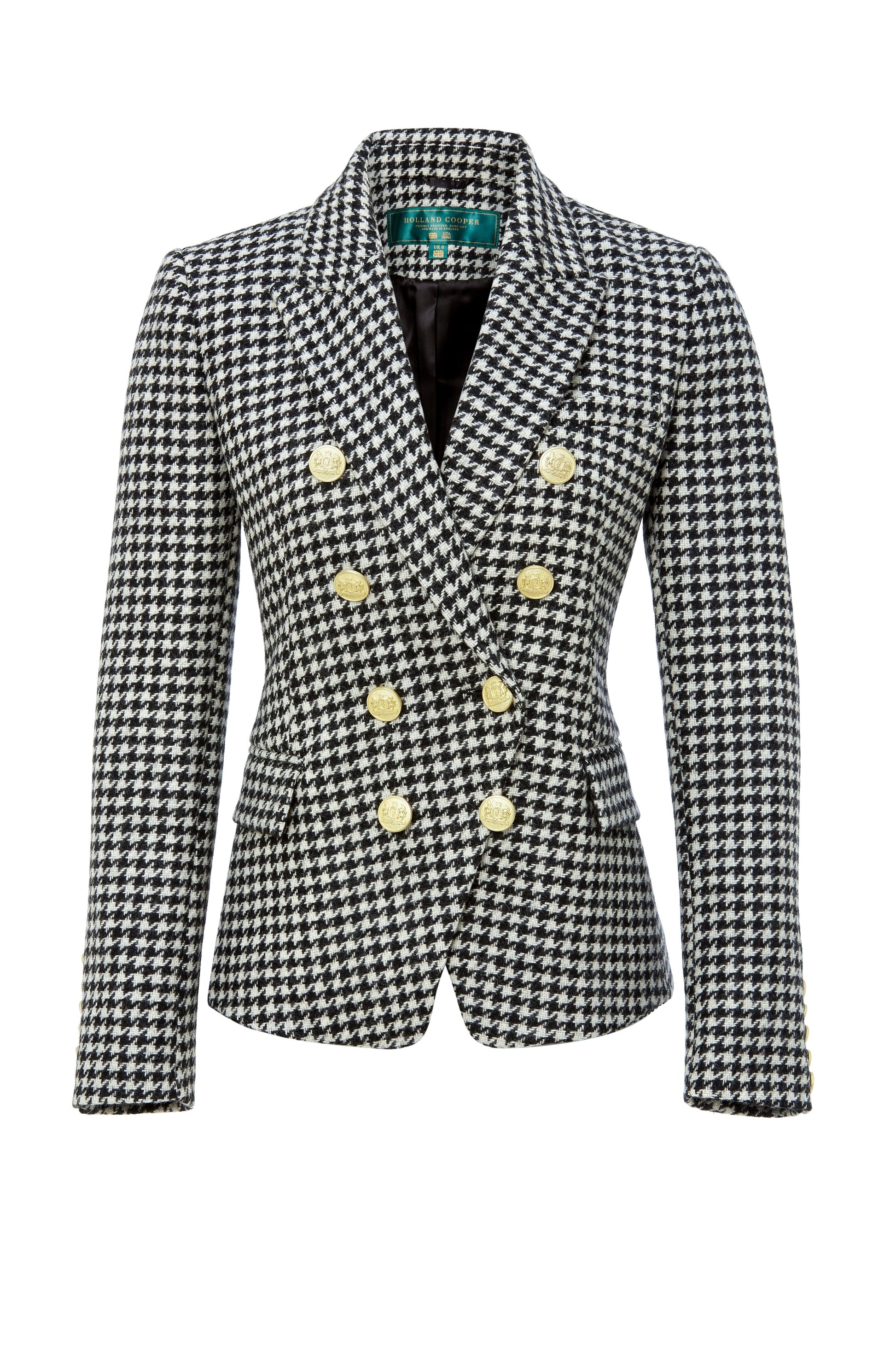 This double breasted Blazer is a chic transeasonal wardrobe essential. Designed to create a sharp tailored silhouette worn open or closed. Fully lined with a luxury stretch lining for extra comfort and adorned with HC signature Gold buttons on the front and cuffs. This blazer has been hand cut and made entirely in England using wools woven in the UK.