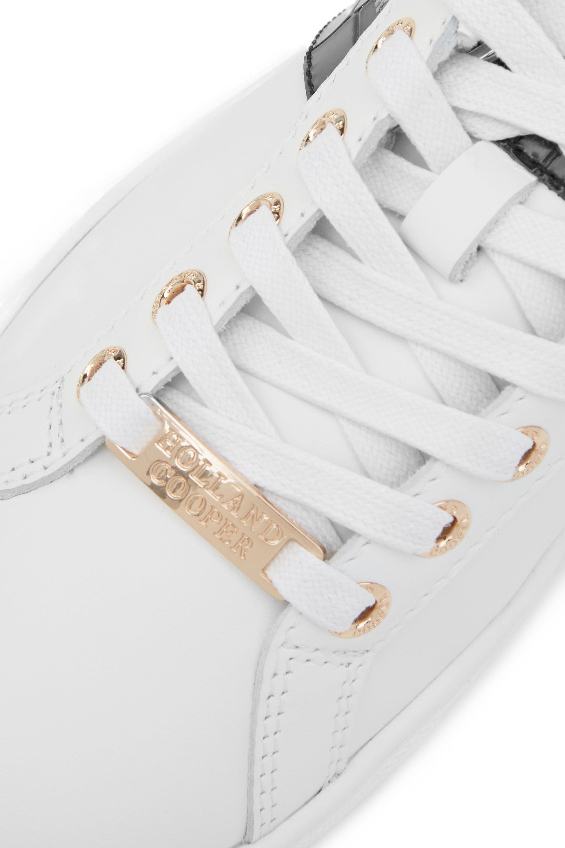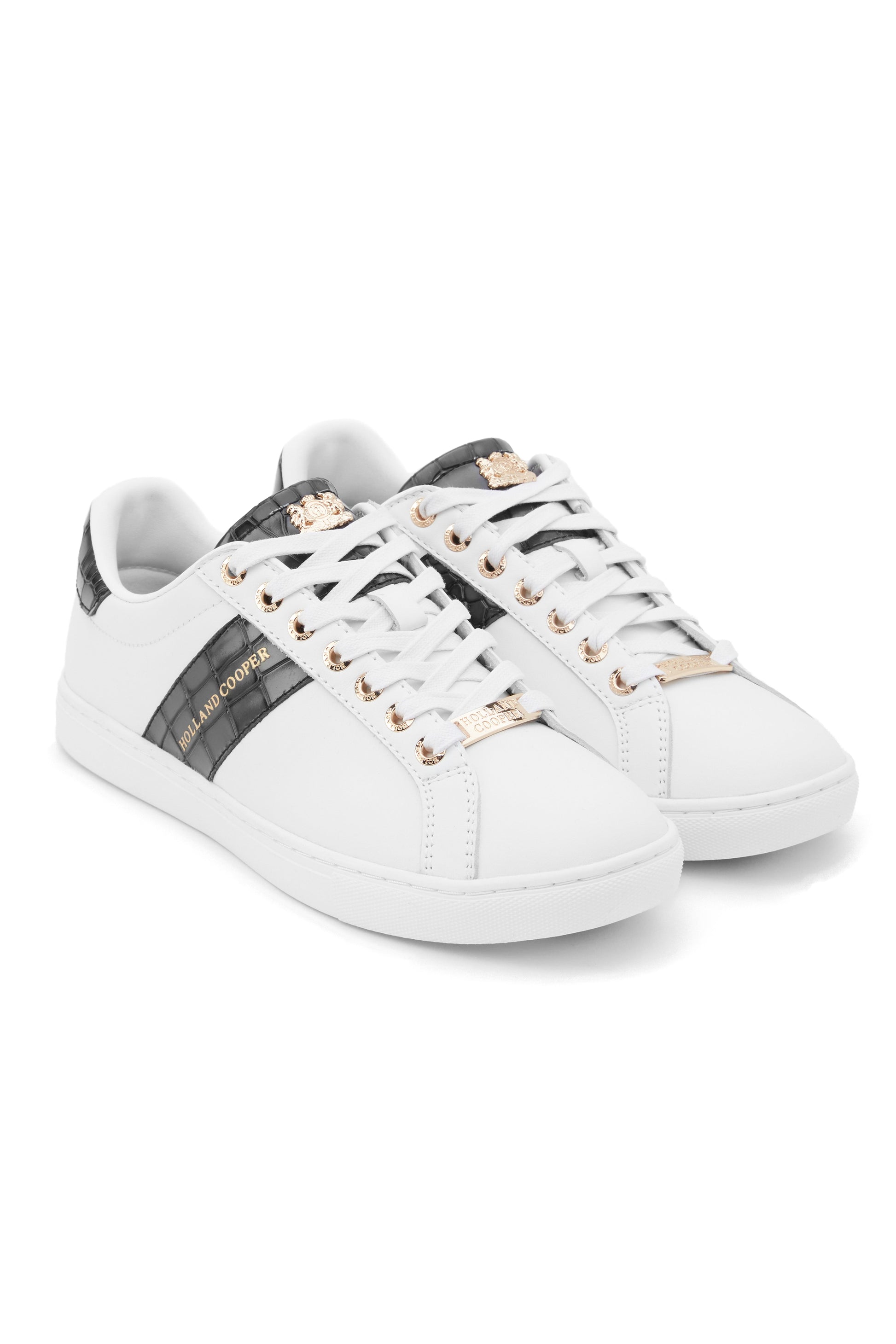 Inspired by traditional tennis shoes. these trainers have a cushioned footbed. made from super soft memory foam with arch support for maximum comfort. making them great for everyday wear. With soft white leather to the upper. the minimalist silhouette features a contrasting panel of black croc leather. for a subtle stylish touch. Finished with our signature gold hardware and embossed with our iconic green HC to the rubber soles.