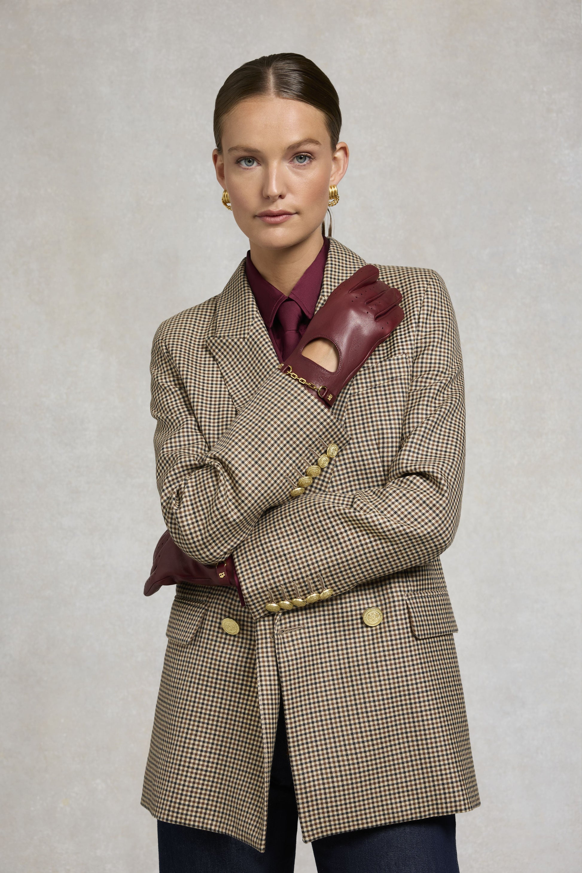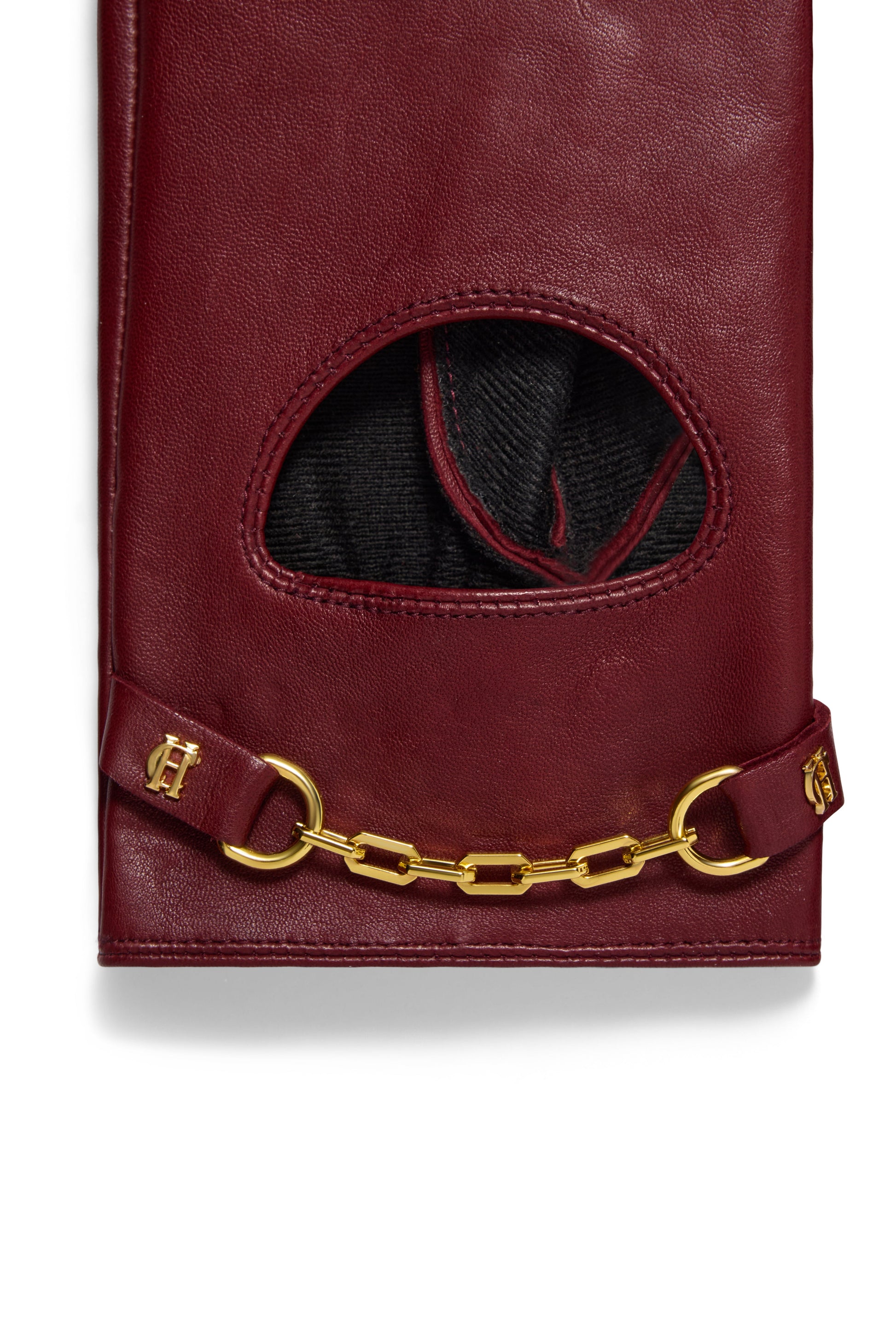 Crafted from beautifully soft sheep leather. these classic driving gloves combine luxury with practicality. Designed with perforated finger detailing for breathability and comfort. they feature an elasticated wrist opening for a secure fit. Finished with a refined gold chain and HC logo trim. they bring a touch of elegance to a timeless accessory.