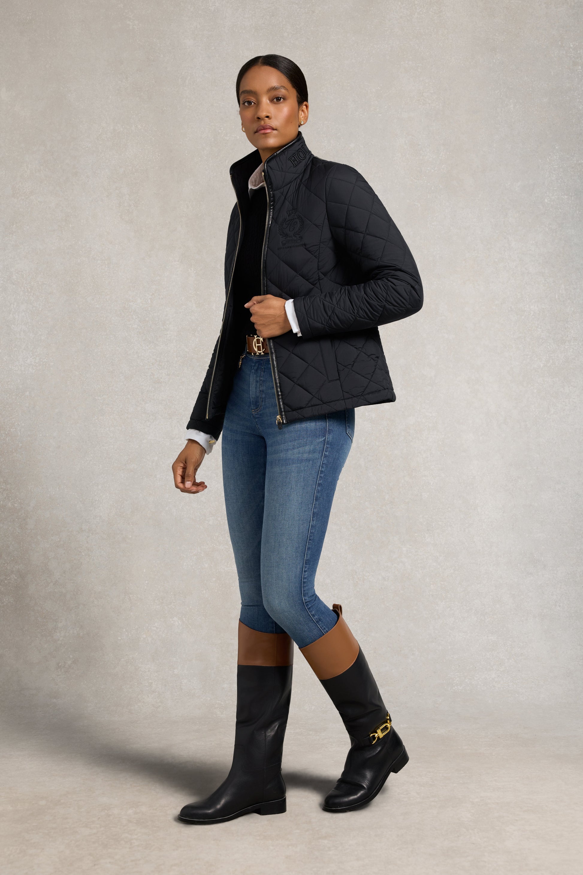 The latest evolution of our iconic diamond quilt series. the Lightweight Country Jacket blends heritage styling with a modern. refined silhouette. Cut to a slim fit. this versatile layer features classic diamond quilting through the body and sleeves. offering lightweight warmth without bulk. Faux leather binding along the front closure and collar edges adds a touch of luxury. while antique brass zips lend a timeless finish.