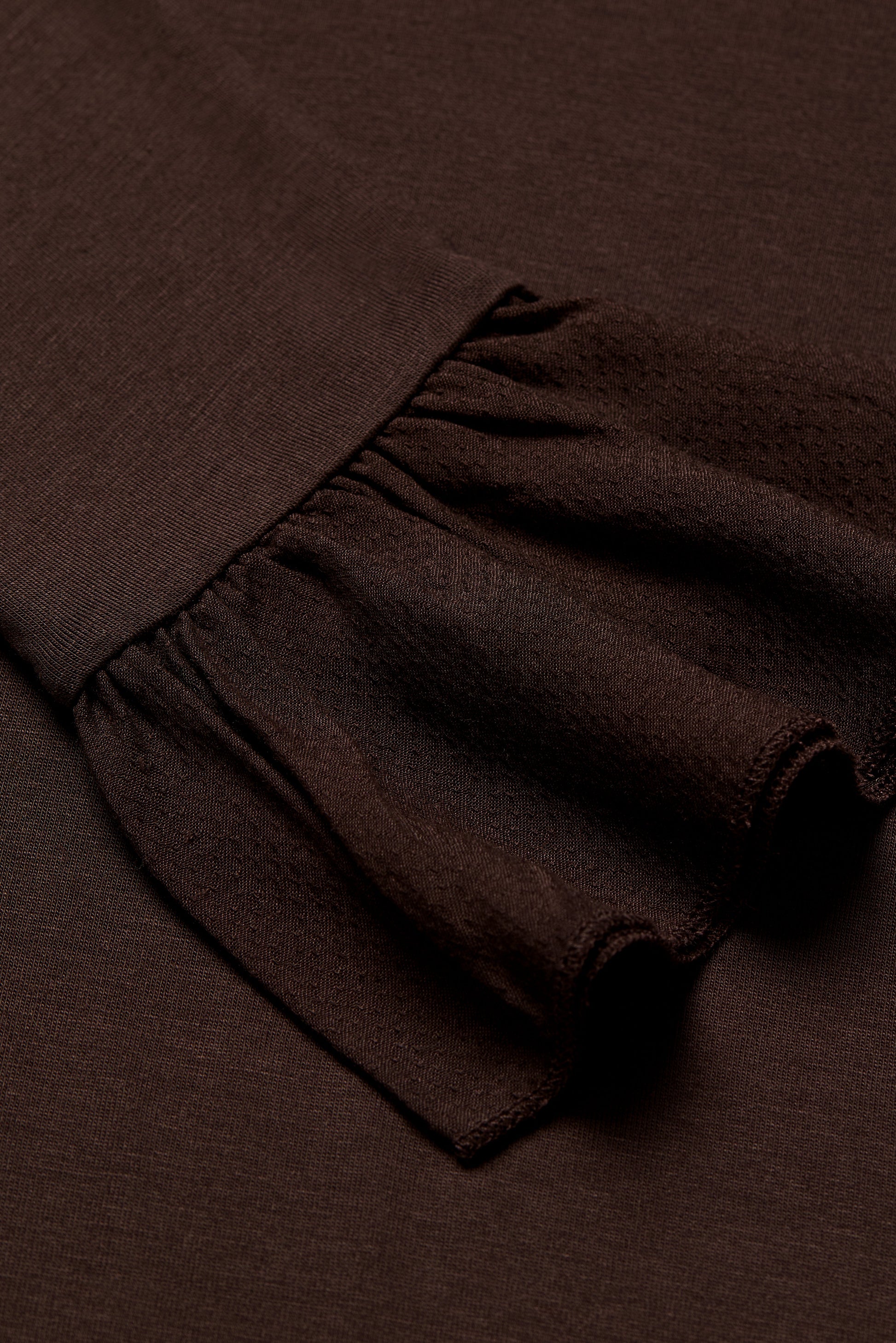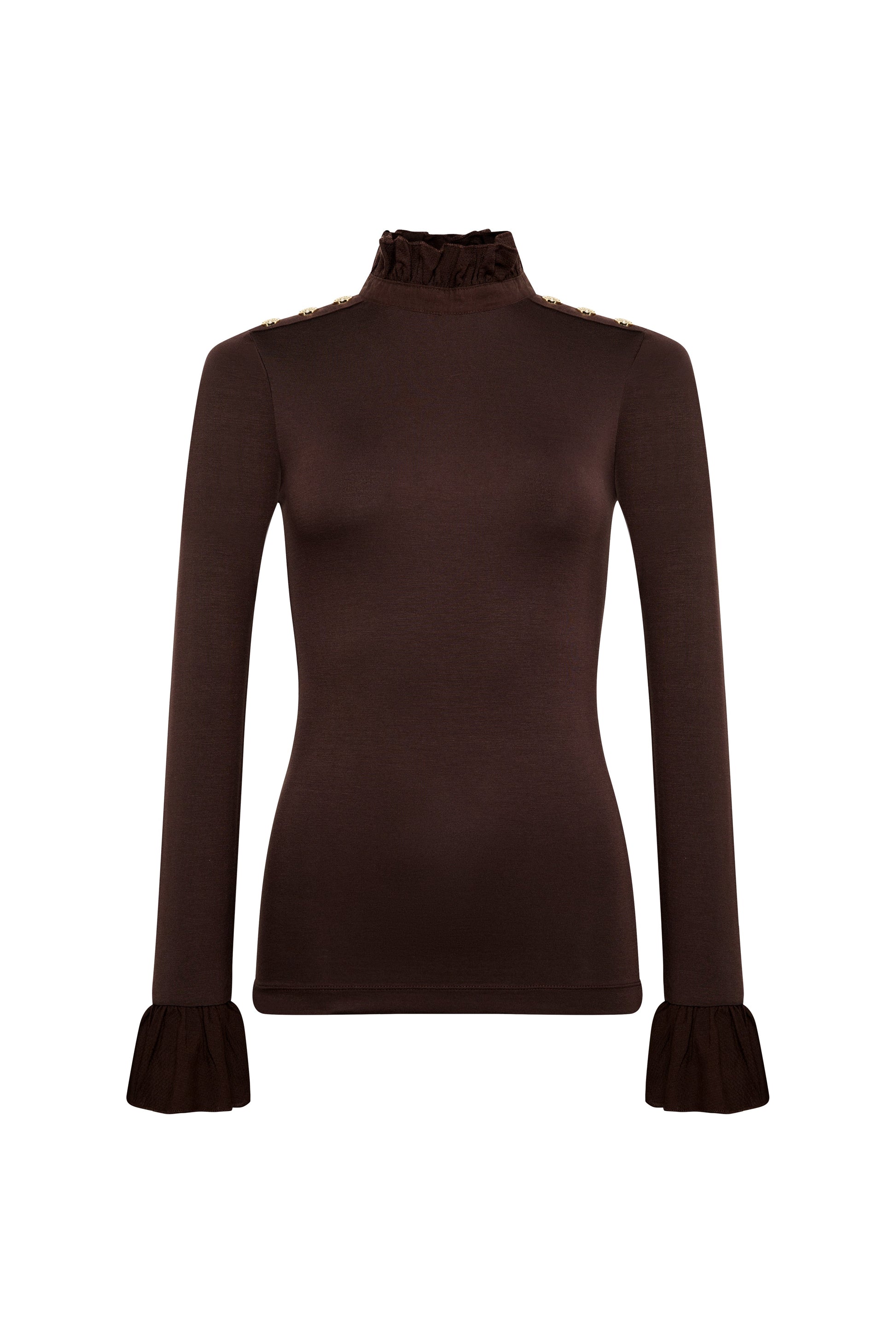 Created from a flawless and smooth fabric for a second-skin feel. this tee has been designed to become an everyday essential in your wardrobe. Designed with a body-contouring fit with a pretty ruffle neckline and cuffs. this piece is both flattering and elegant. Detailed with HC rivets on the shoulders.