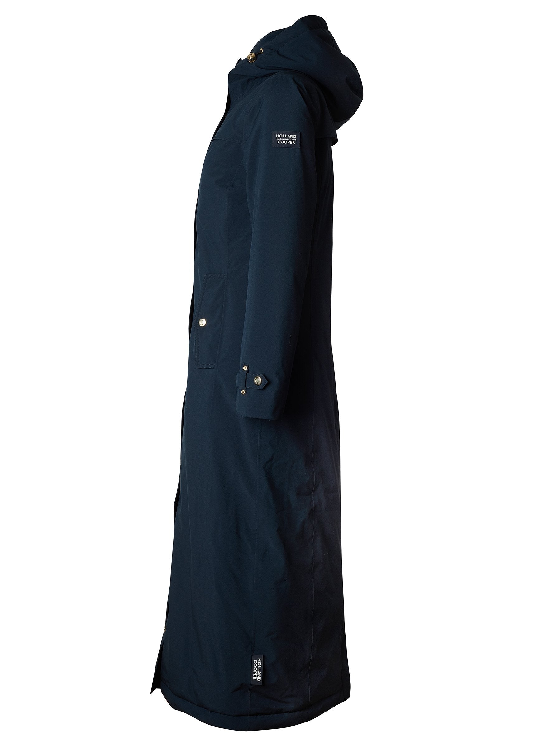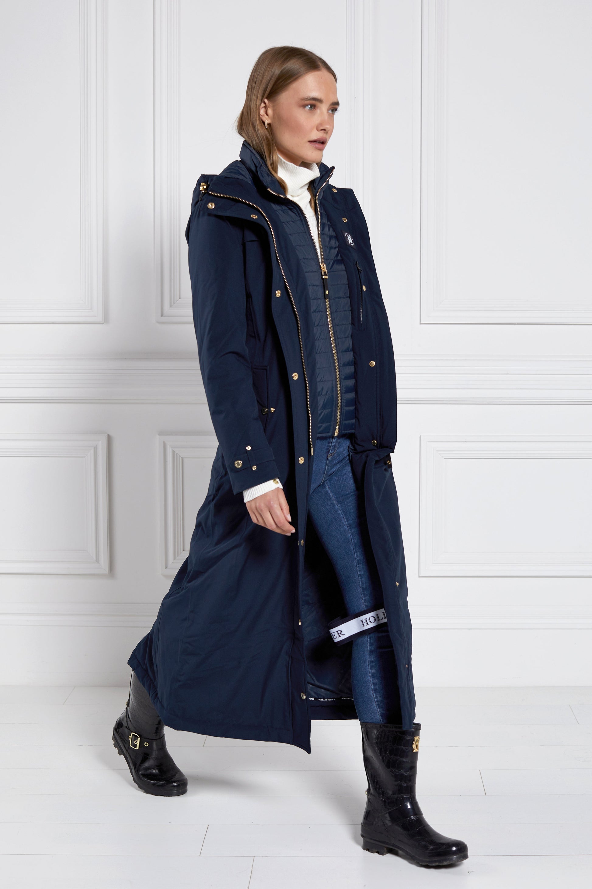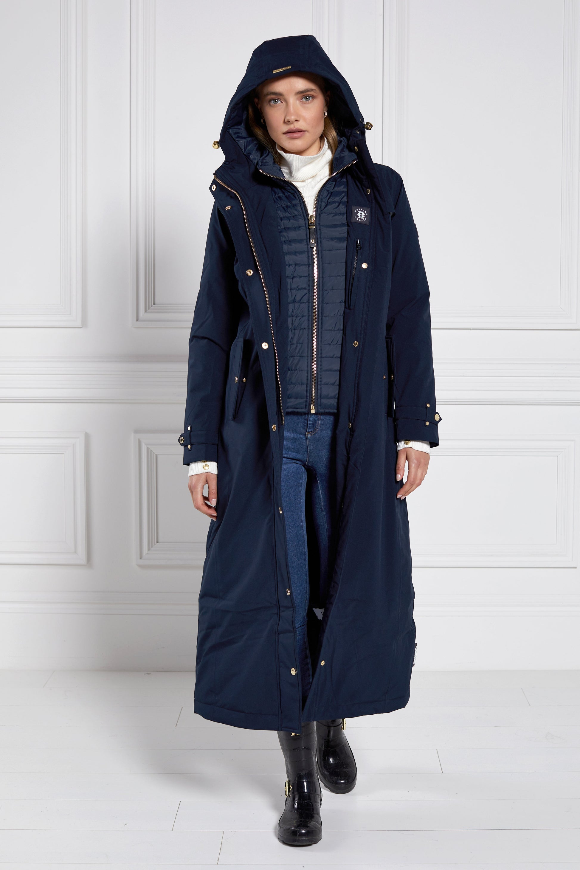 Durable. practical and 100% waterproof. our longline training coat is perfect for wearing in all weather conditions. Designed with breathable mesh insert on the back. protective neoprene storm cuffs and interior leg straps for riding. this coat is a must-have for every rider. Finished with reflective silicone prints and our iconic gold hardware.