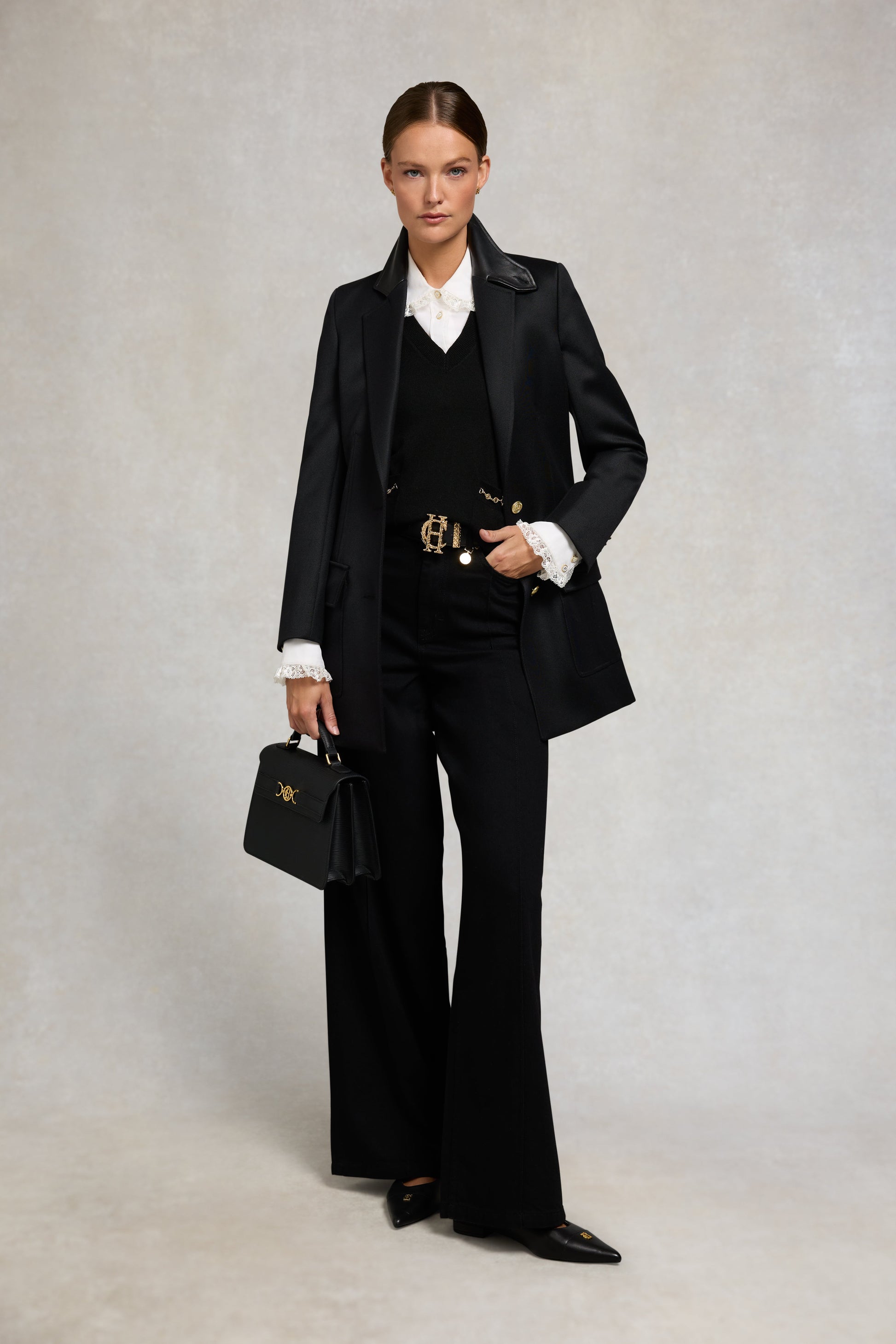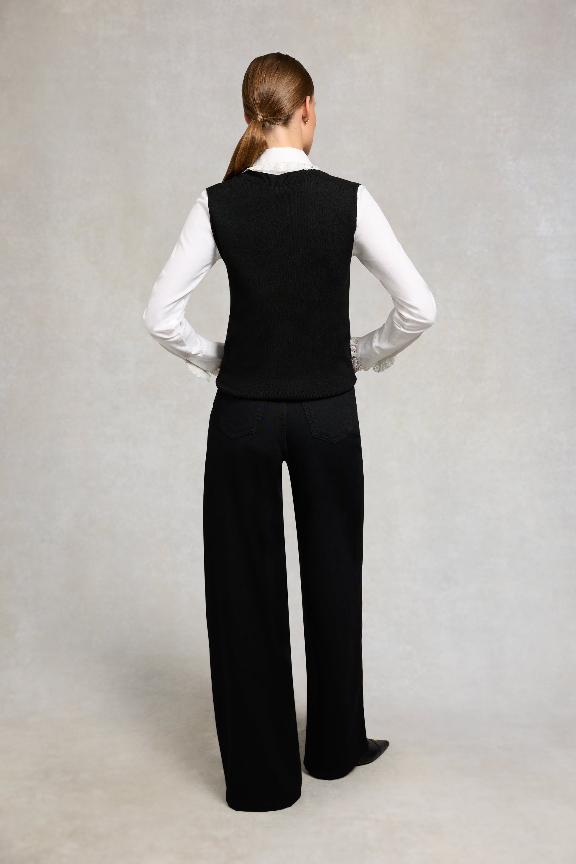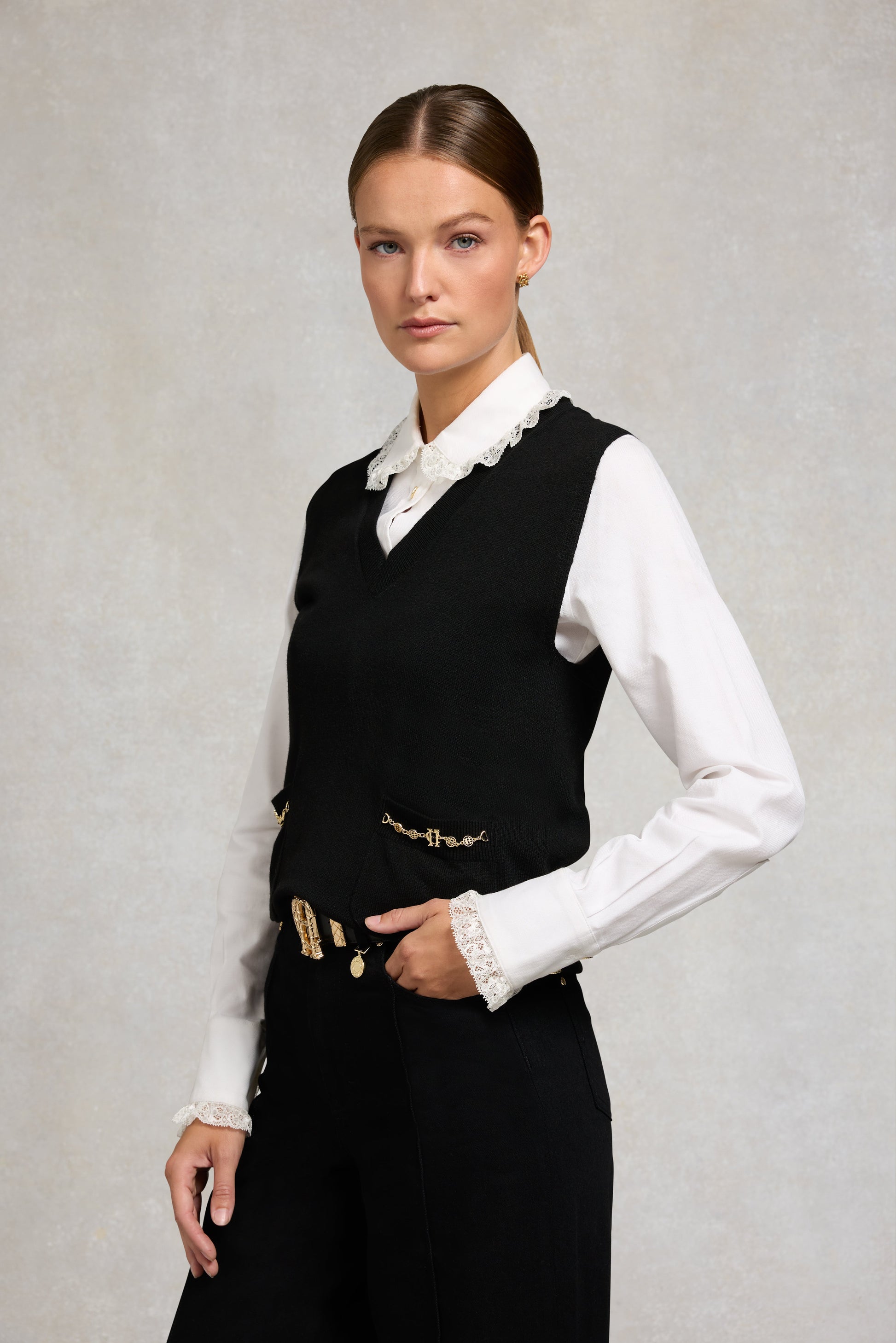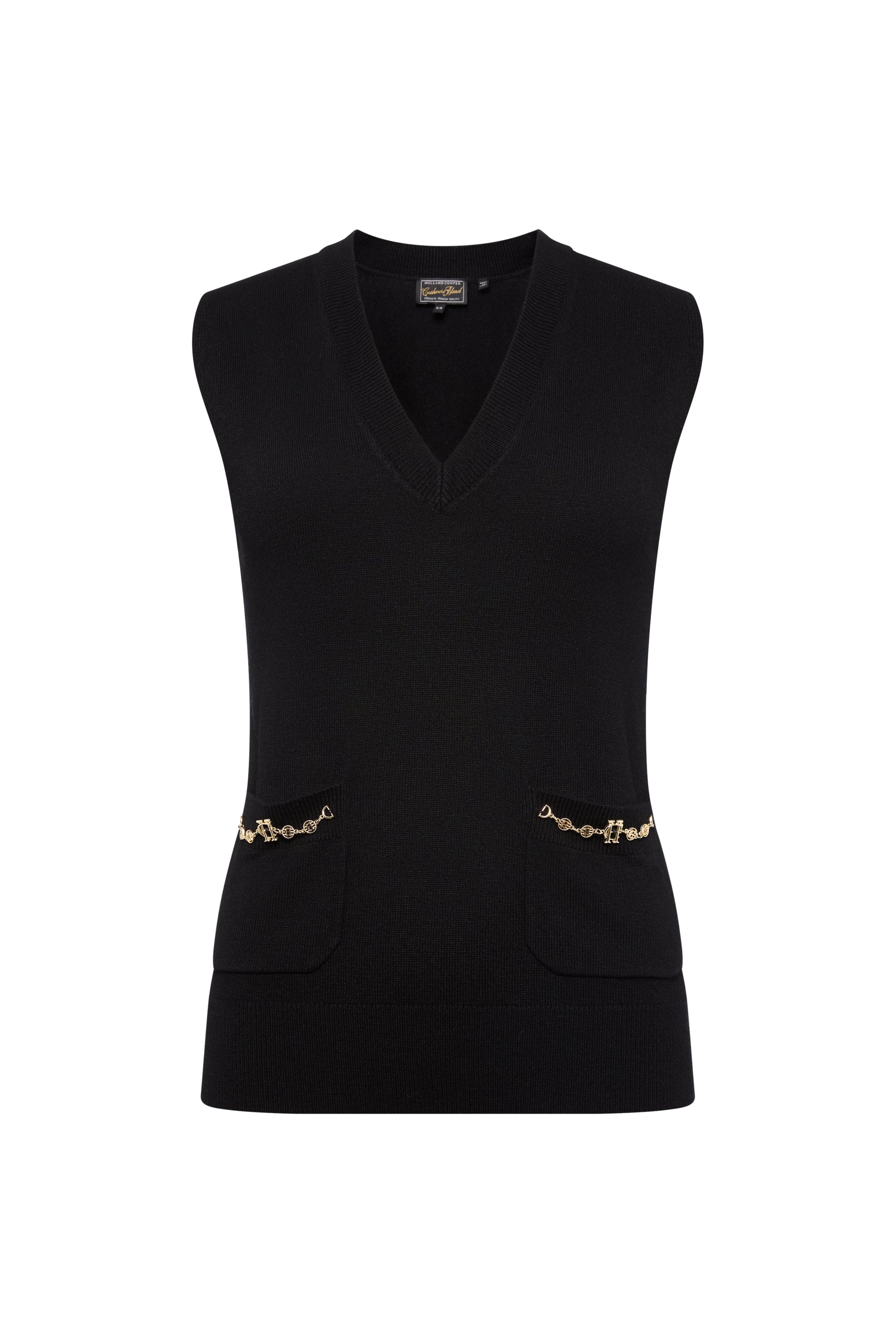 Crafted from a luxurious cashmere-blend. the Knitted Tank offers a relaxed fit with effortless elegance. The classic V-neck silhouette is complemented by charm hardware on the pocket. adding a subtle signature detail. Perfect for layering under blazers or wearing alone. this versatile tank brings a refined touch to both casual and elevated outfits.