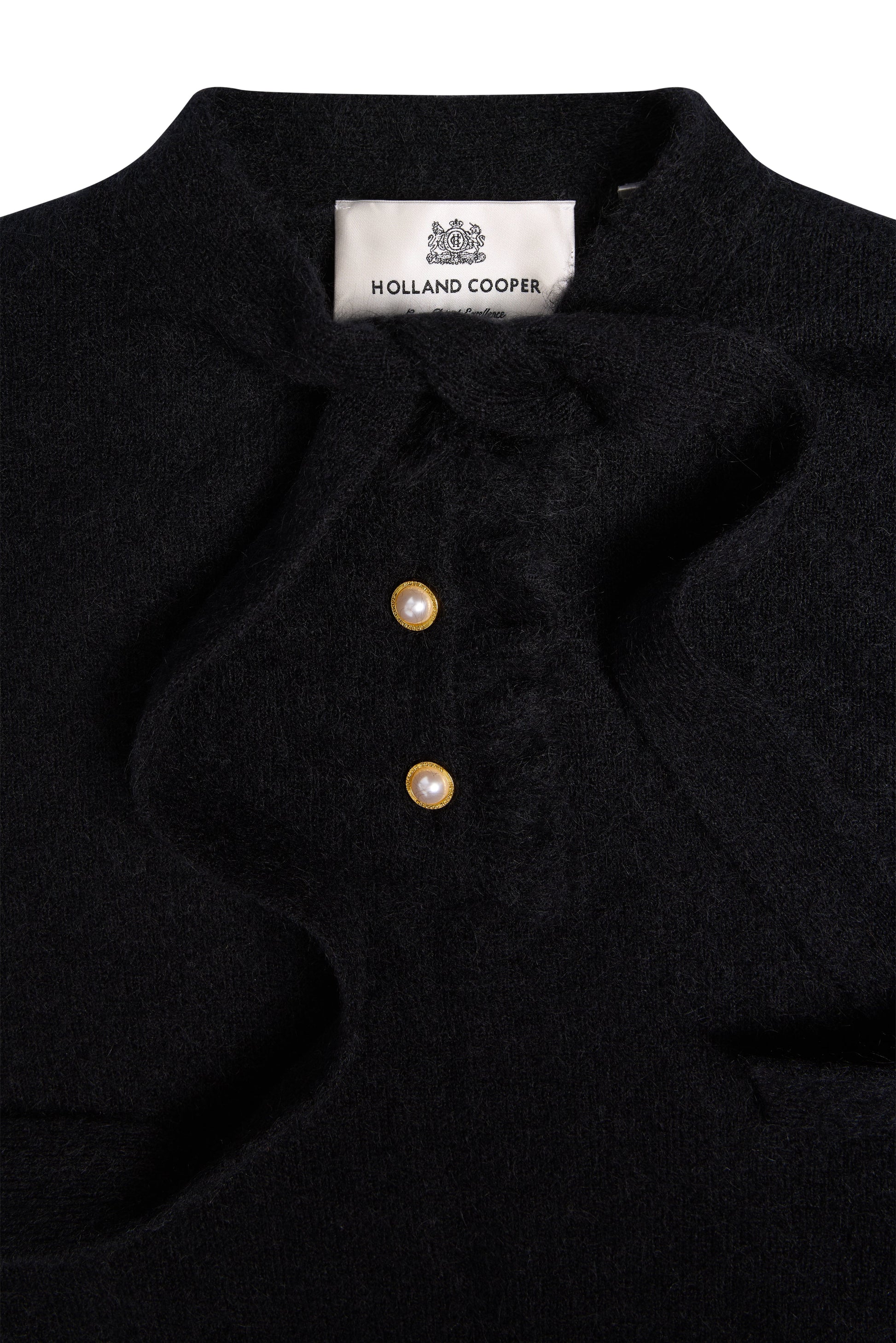Softly sophisticated. the Marissa Knit combines luxe texture with feminine detailing. Crafted in a sumptuous mohair blend. it drapes in a relaxed silhouette while featuring slim. set-in sleeves for a balanced shape. A delicate tie neck and frilled placket add romantic flair. and HC-branded pearl buttons lend a signature touch. This knit elevates any look with effortless elegance.