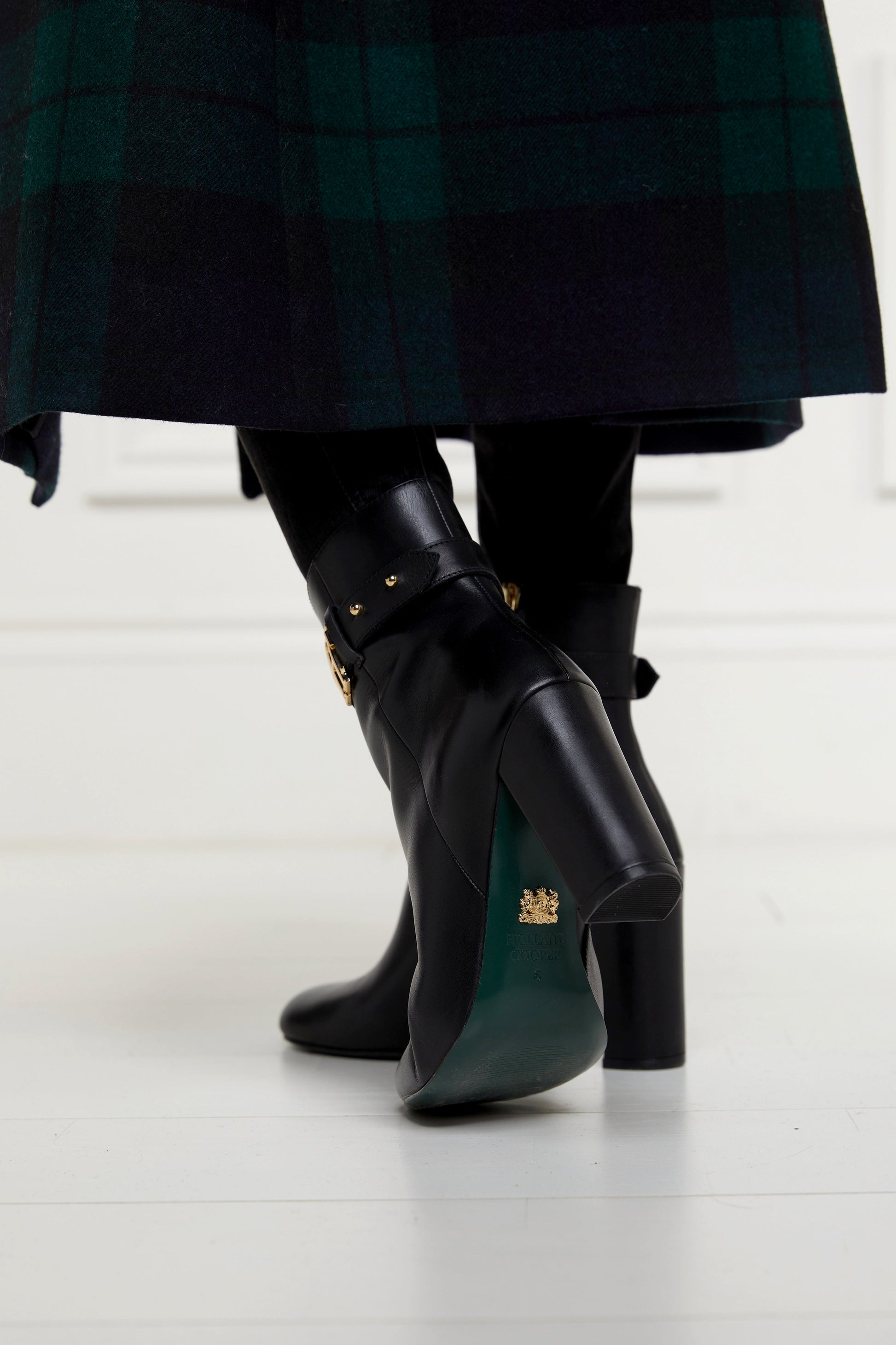 Redefined from a clean premium smooth leather. our Mayfair Boots have been reimagined for the season. Designed with comfort and style in mind. this boot is the perfect everyday piece. Detailed with an elegant classic HC buckle and HC's iconic racing green sole. this style provides the ultimate day to night look due to the ultra-comfy block heel which elongates and flatters the leg.
