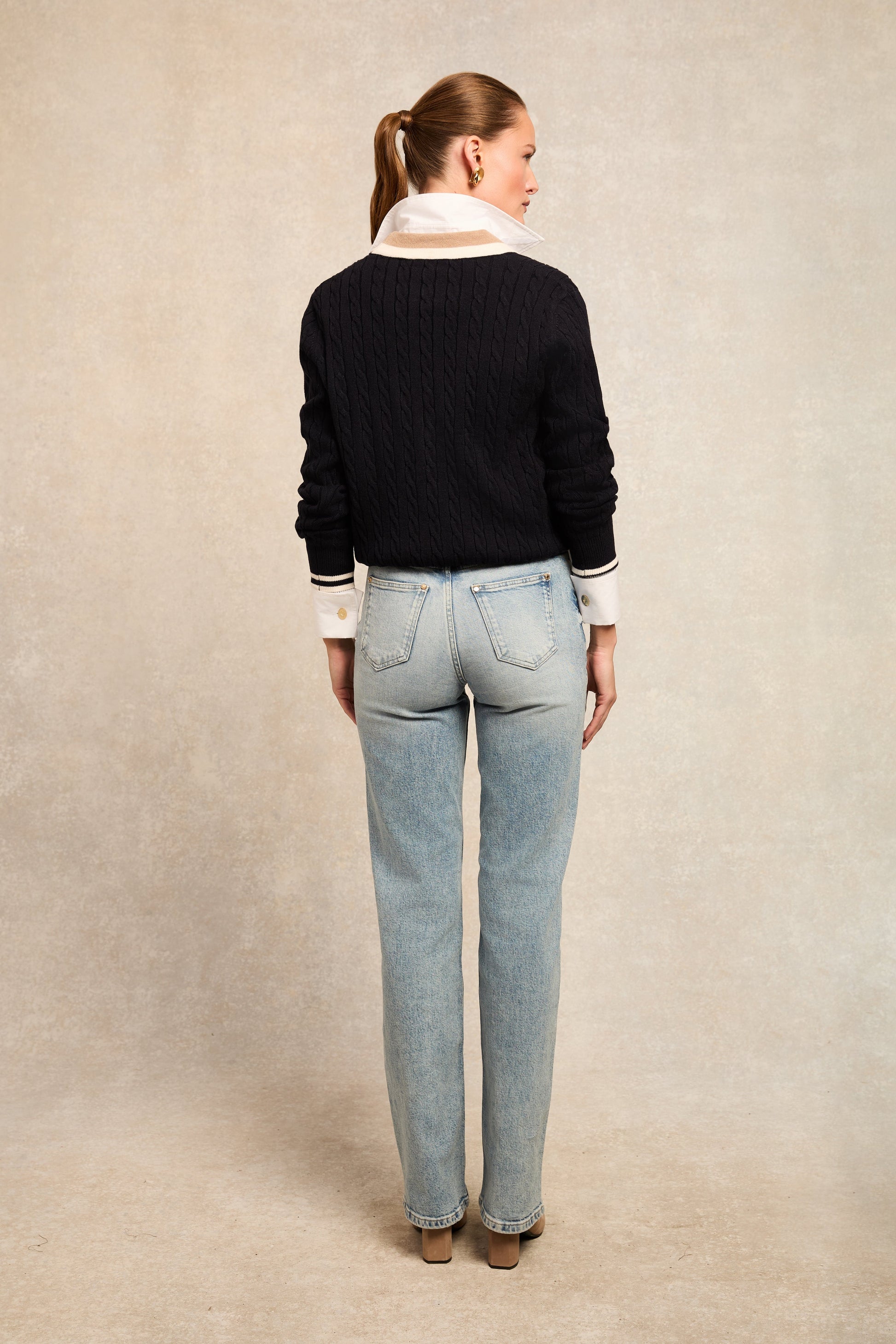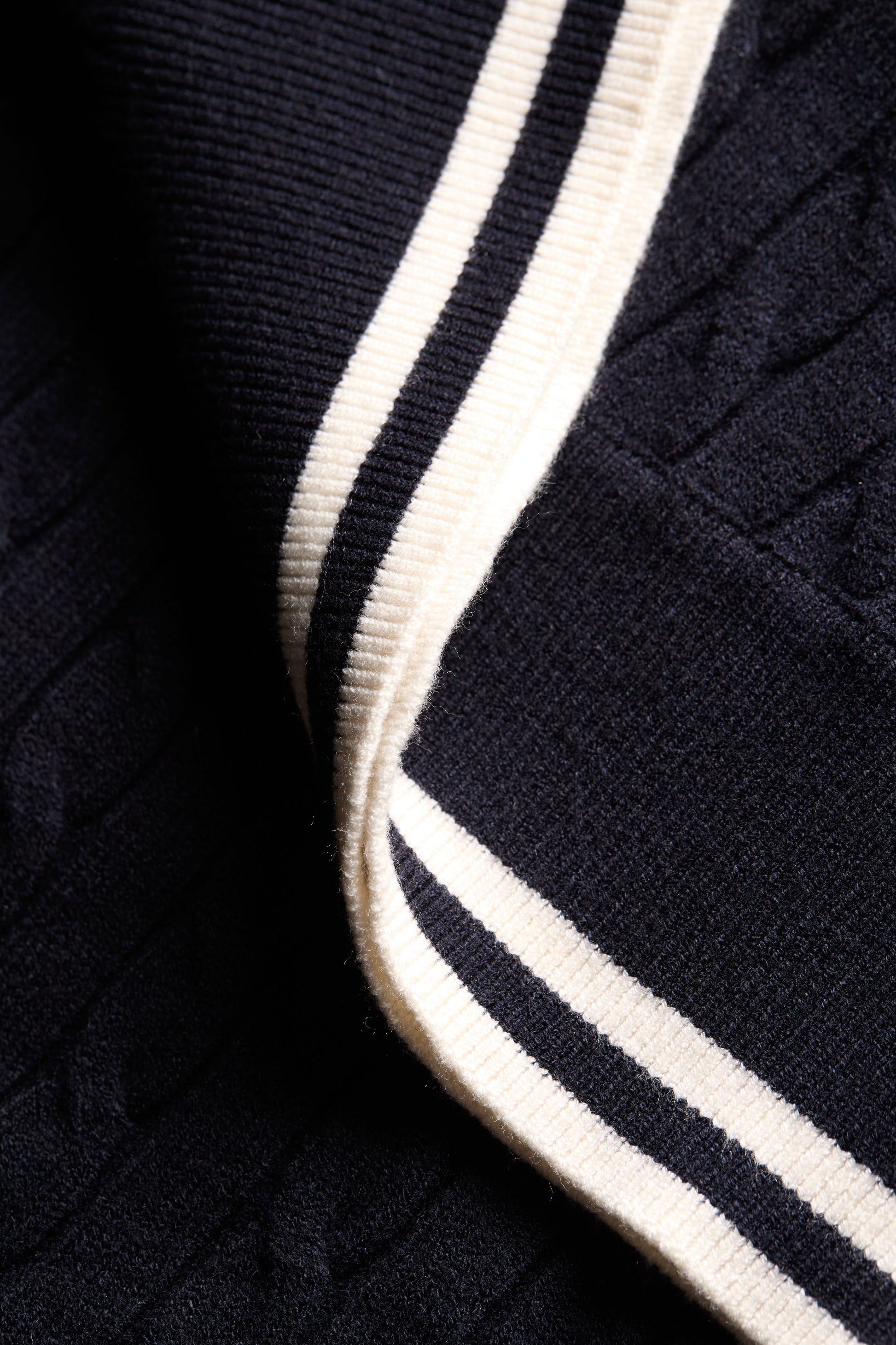 This exquisite piece showcases intricate chevron cabling detailing on the body. adding a touch of classic sophistication. The contrasting ribbed neckline complements the deep V-neck cut. enhancing its elegant silhouette. Adorned with the signature high-build HC emblem on the chest. this knit sweater is finished with refined tipping on the cuffs and hem. lending a polished look to your ensemble. Perfect for layering or as a standalone statement.