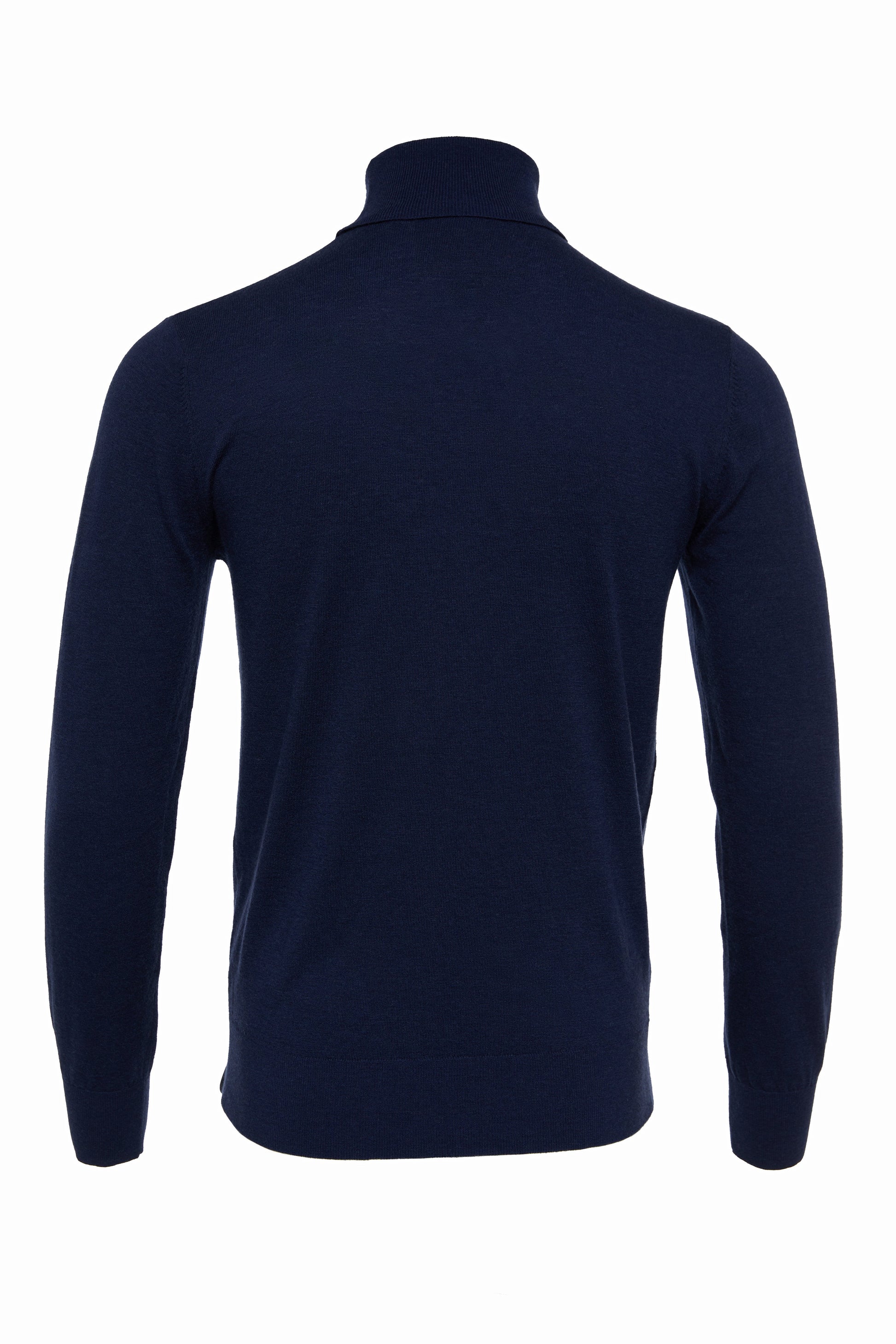 Meticulously crafted using a premium merino wool blend for an understated classic look. A wardrobe essential which exudes sophistication. this knit offers a slim fit with a ribbed hem. cuff and roll neck. The merino wool offers exceptional comfort and warmth whilst remaining breathable and lightweight. Wear alone or layer under one of our pieces of classic British tailoring.