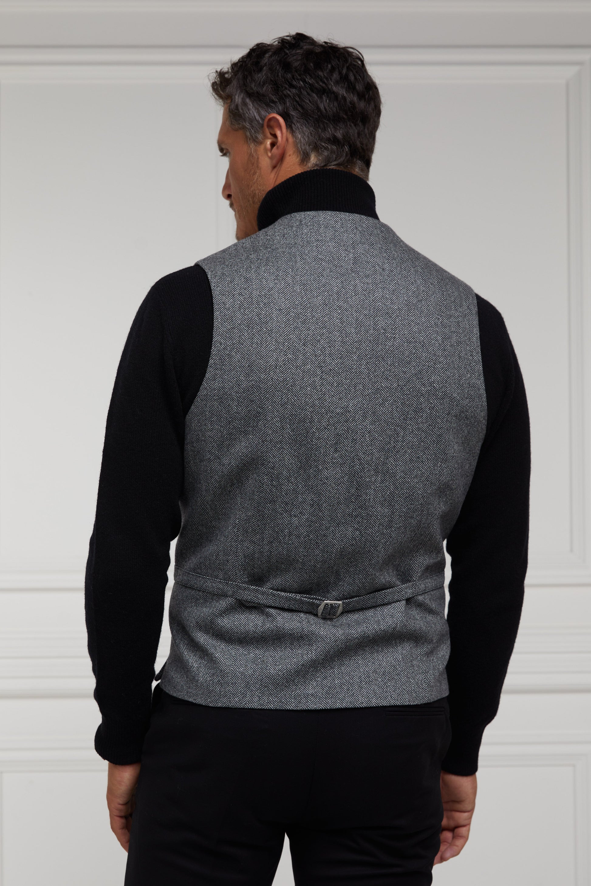 Both classic and refined. our St James Waistcoat has been beautifully crafted in the UK from the finest of heritage wools. With a timeless. single breasted silhouette with slim-fitting construction. this waistcoat is an essential in every gentleman's wardrobe. With a satin twill lining with an interior double welt pocket and functional pocket detailing to the front. this piece is both classic and practical. Finished with our signature detailing and elevated with our subtle metallic buttons.