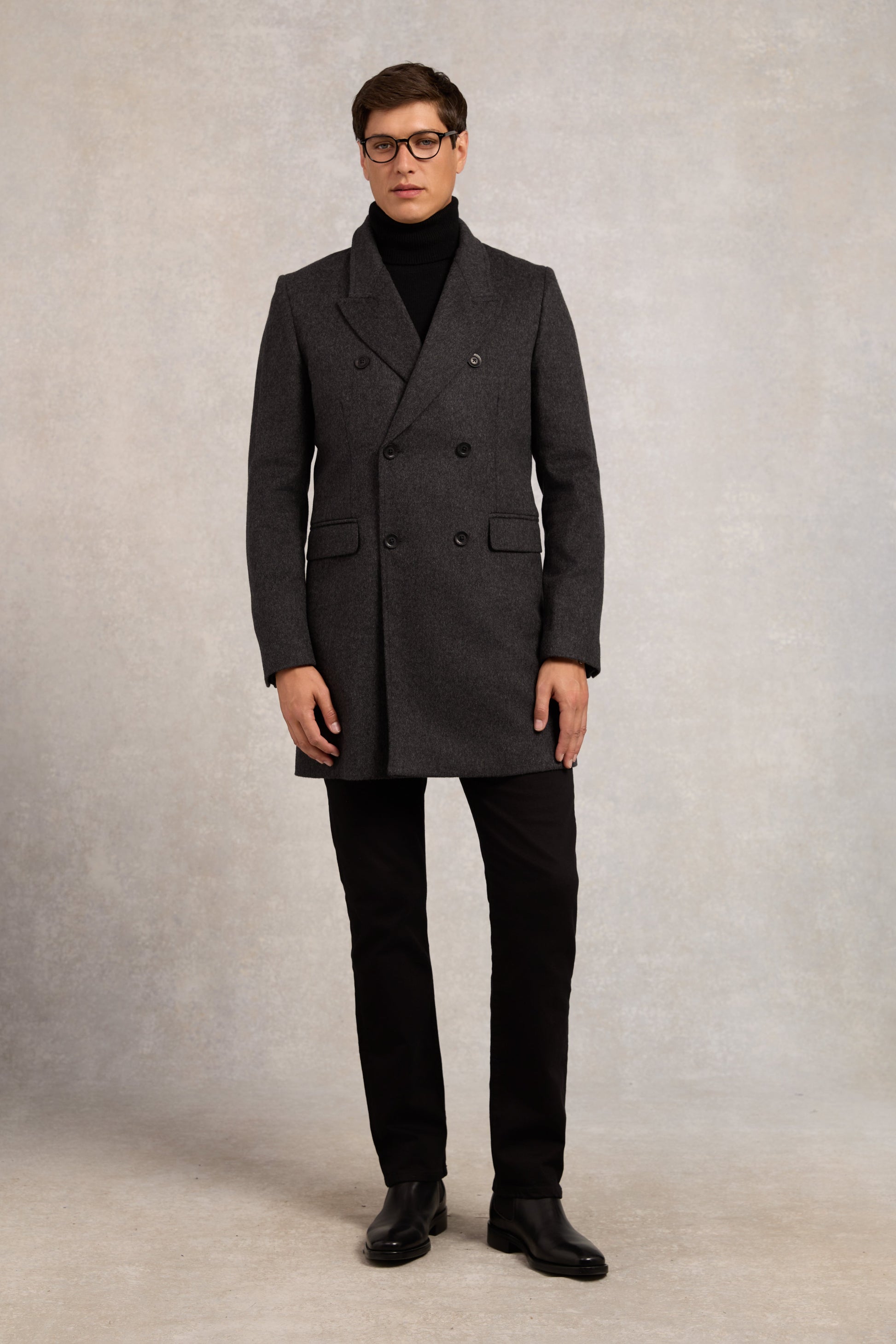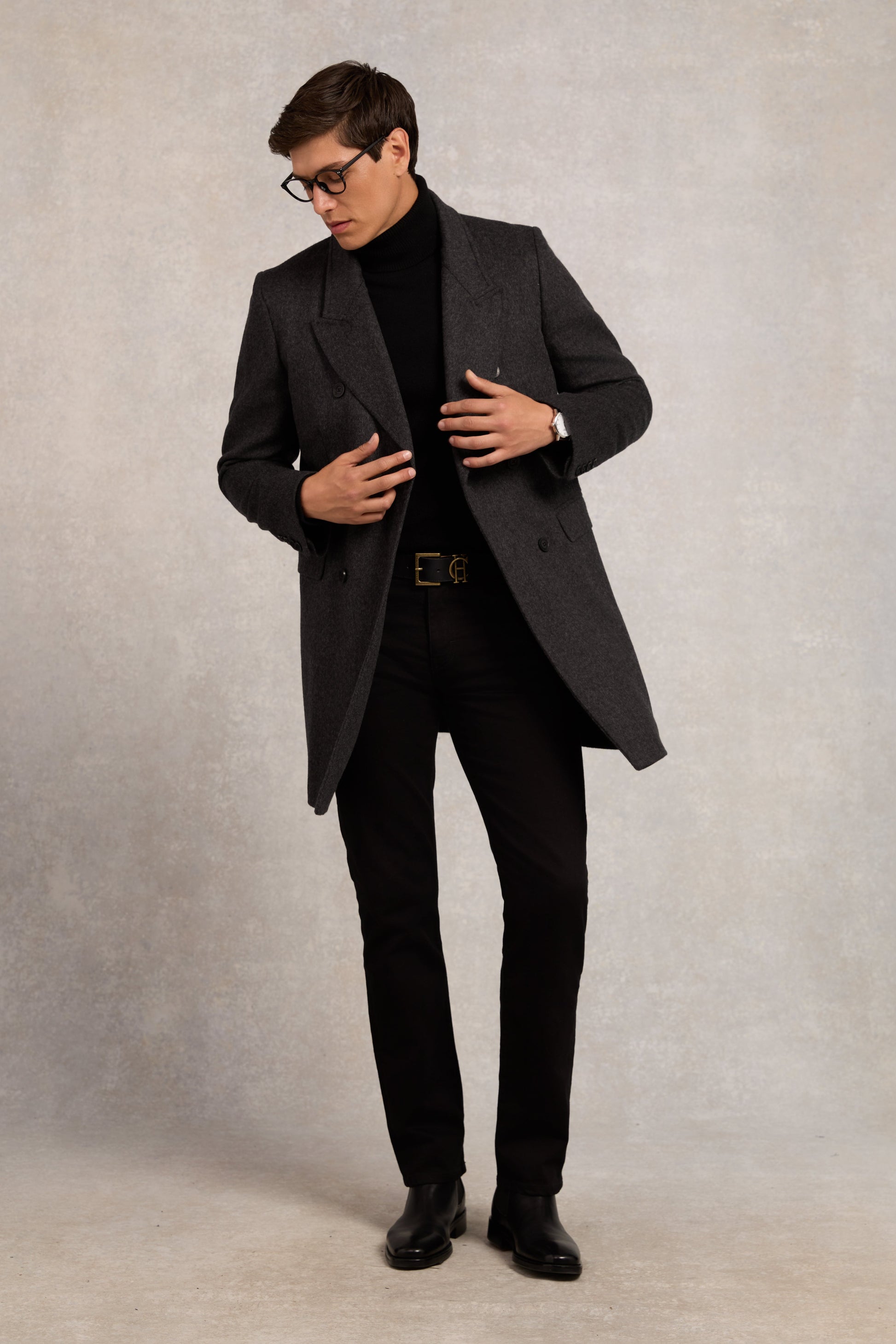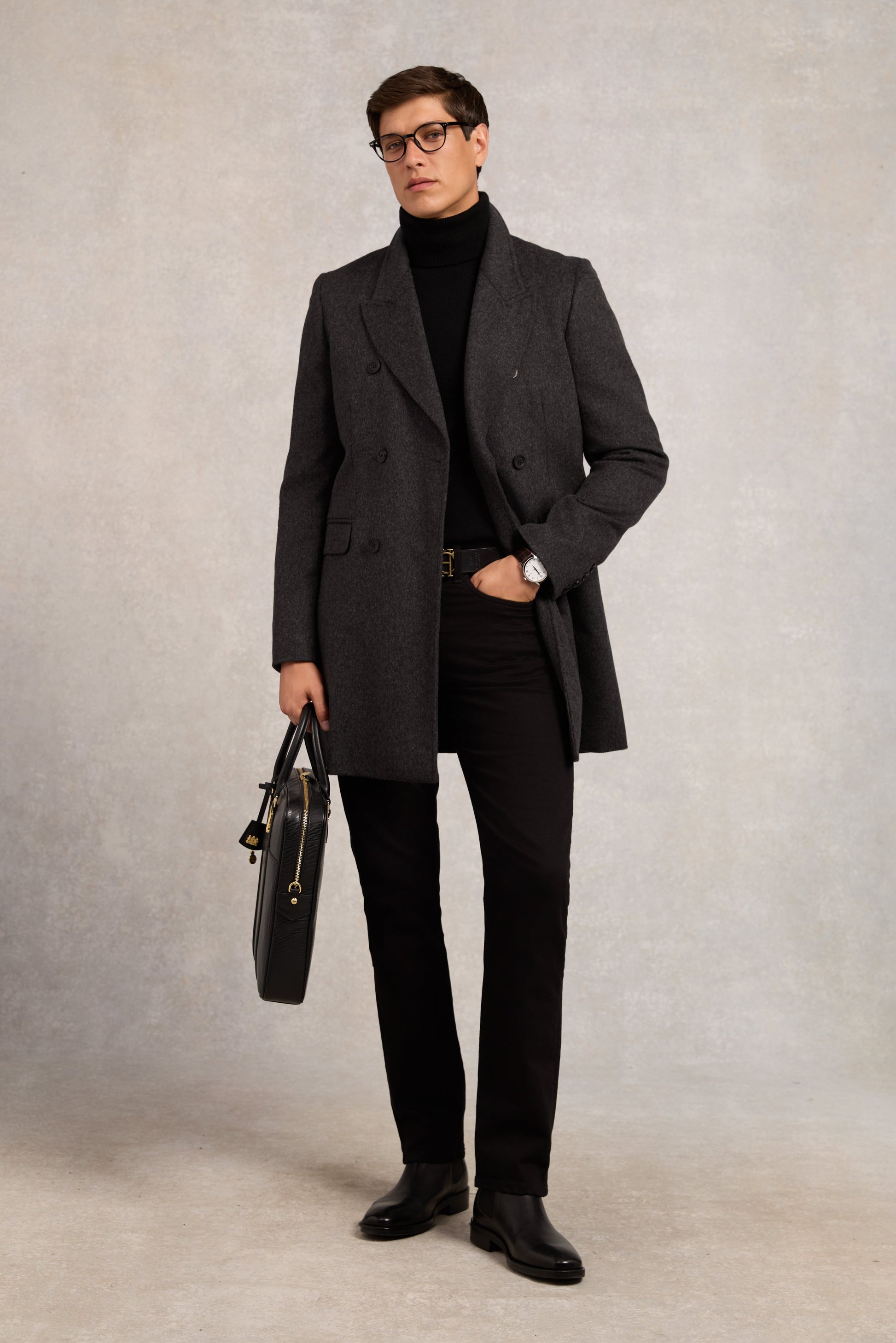 Hand crafted in the UK using the finest wools and meticulously tailored for a crisp. clean appearance. the Double Breasted Coat is the epitome of classic tailoring. With a mid-length silhouette and double breasted. button closure. this coat is framed by slightly padded shoulders for a sharp fit. Tailored with articulated sleeves and classic notch lapels. the double-welt pocket detail has been elevated with a mock horn button closure. Finished with a contrasting under collar for a statement wear with practical chain hanger loop on the inside.