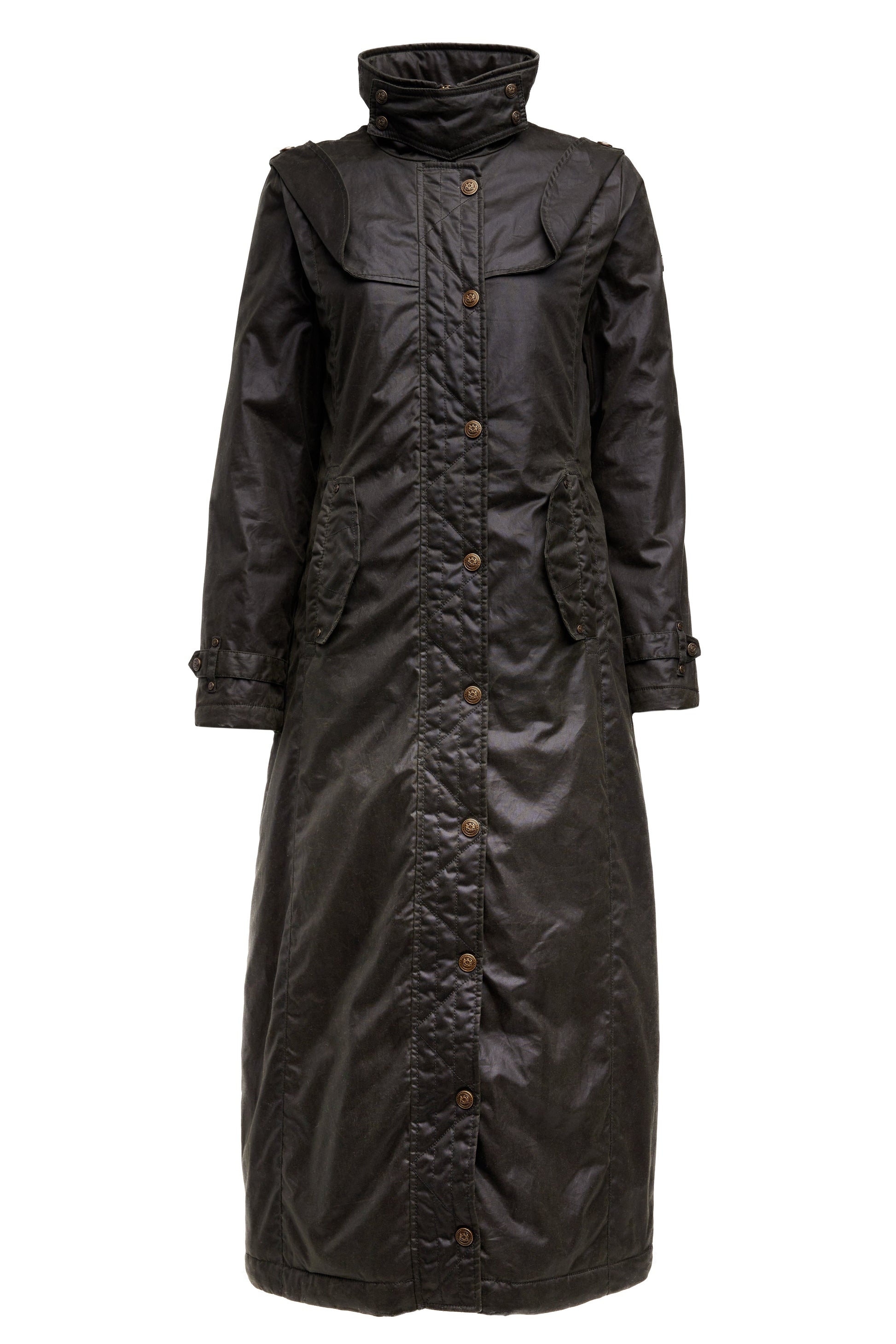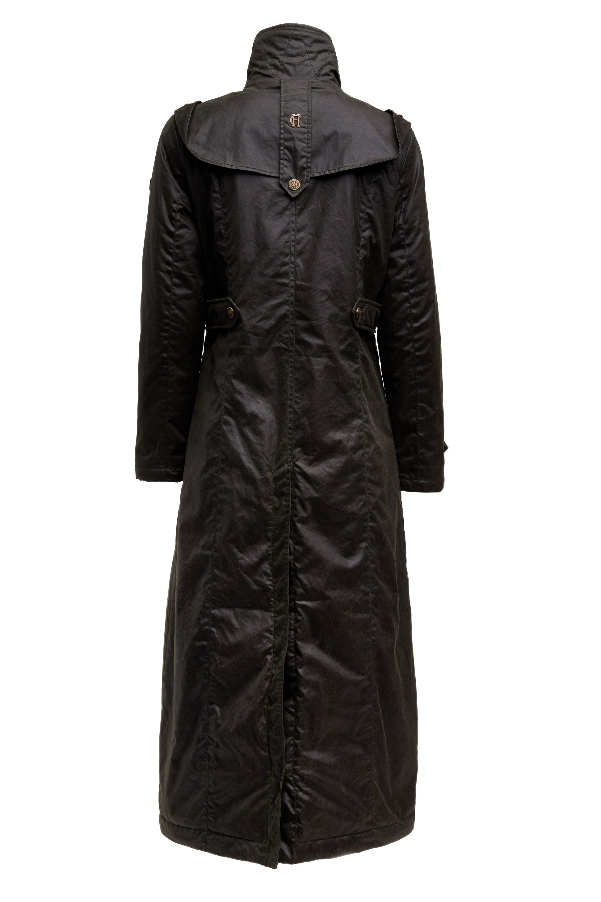 Designed with a classic heritage aesthetic with an oversized cape style yolk. this coat is an elegant. country statement. Made from a water-resistant waxed cotton fabric with a longline shape & beautiful check lining. the high storm collar is perfect for protecting you from the cold. Detailed with pocket flaps & finished with our iconic hardware.