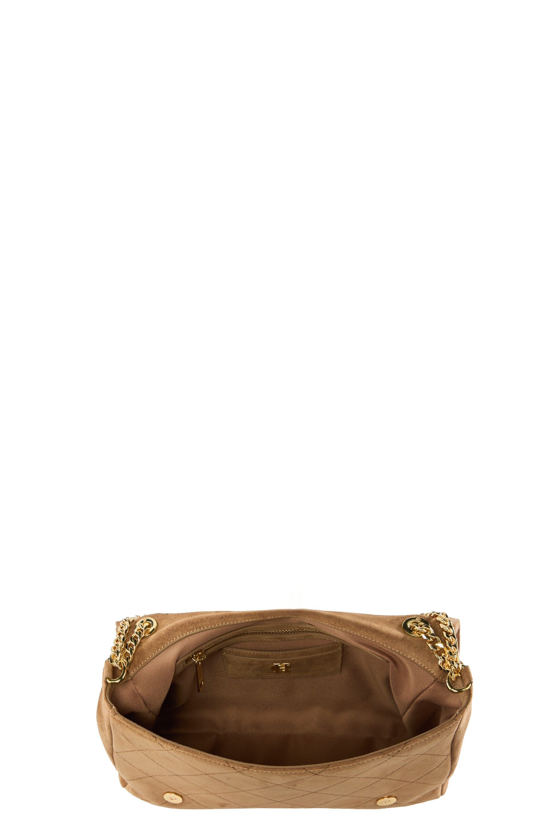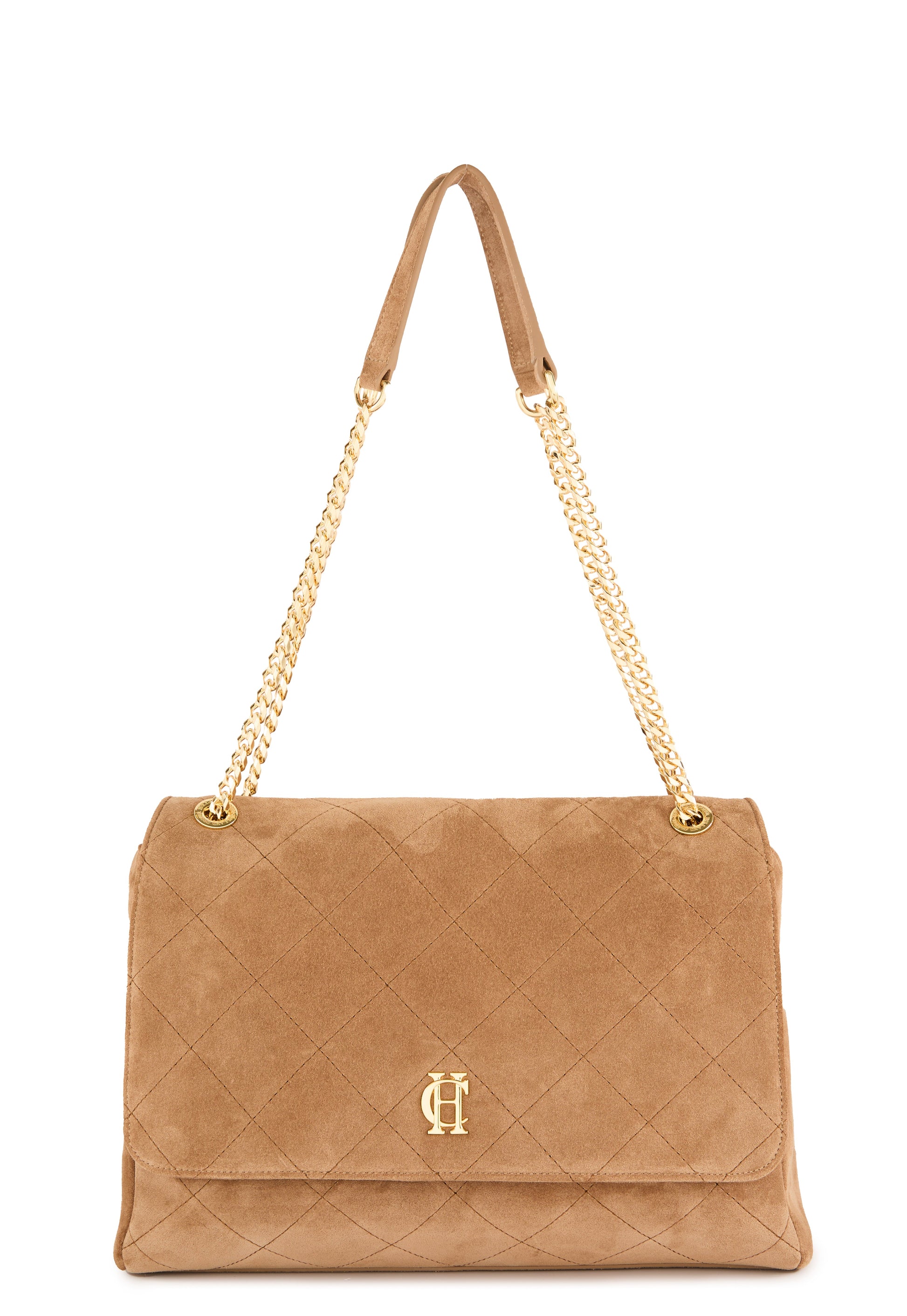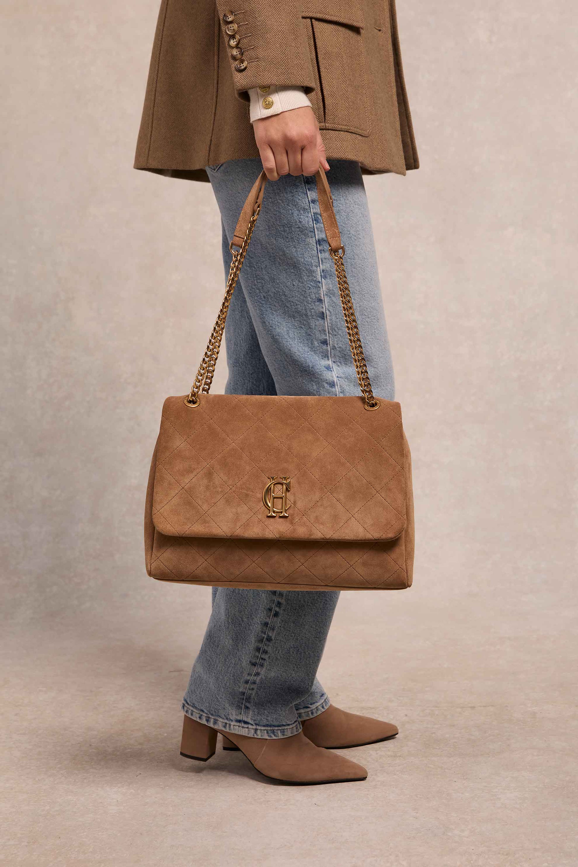 Effortlessly elegant and designed for modern lifestyles. this tote is the ultimate bland of structure and slouch. Crafted from luxurious soft quilted suede. this timeless piece brings both comfort and elevated style to your everyday. Finished with our signature gold detailing. the convertible strap allows for versatile wear - over the shoulder or cross body.