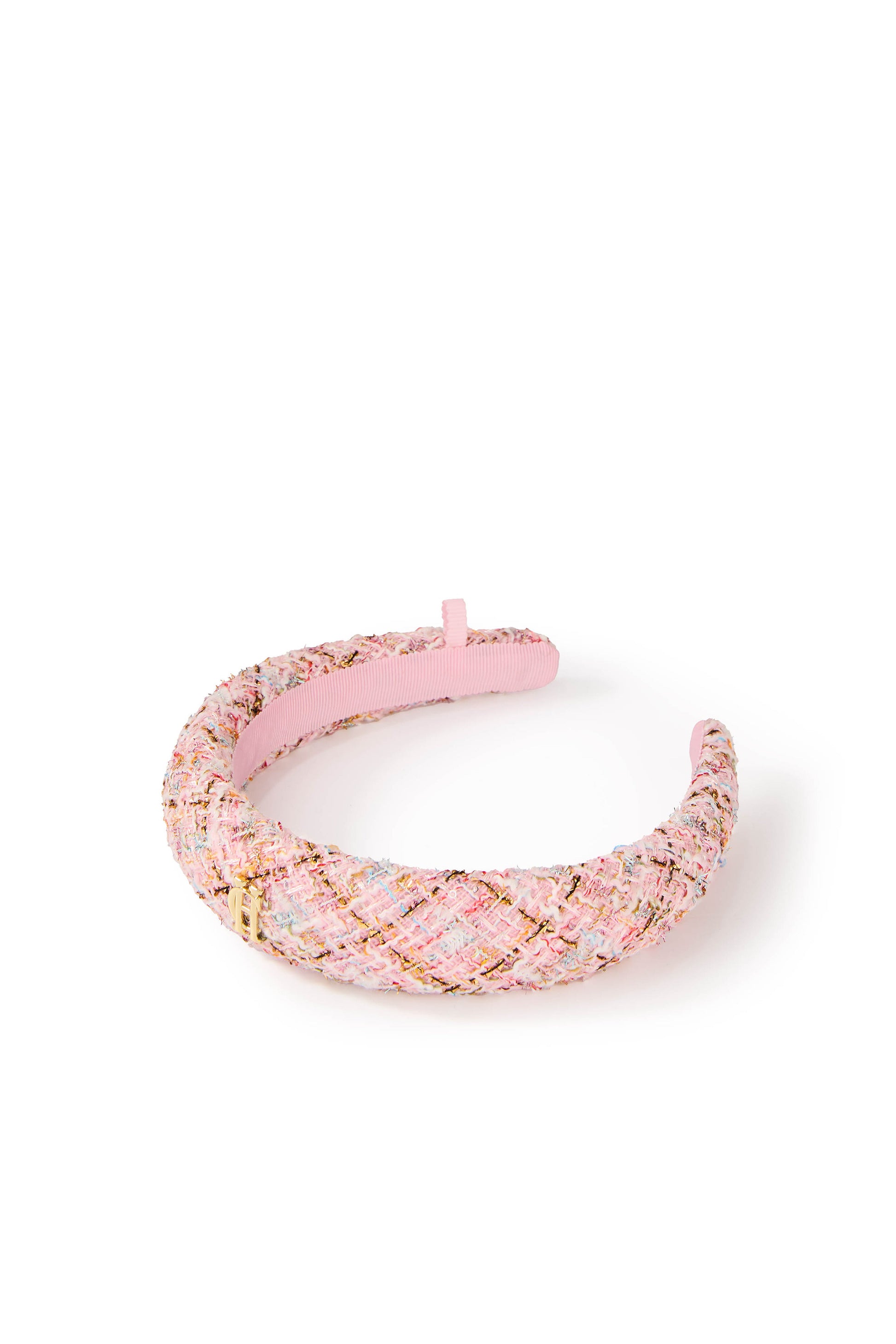 This refined piece showcases our signature attention to detail. crafted with a luxurious bouclé fabric that catches the light with subtle sparkle. The narrow. padded silhouette offers both elegance and comfort. while the internal grosgrain ribbon ensures a secure fit. Adorned with our distinguished HC pin. this headband epitomises luxury.