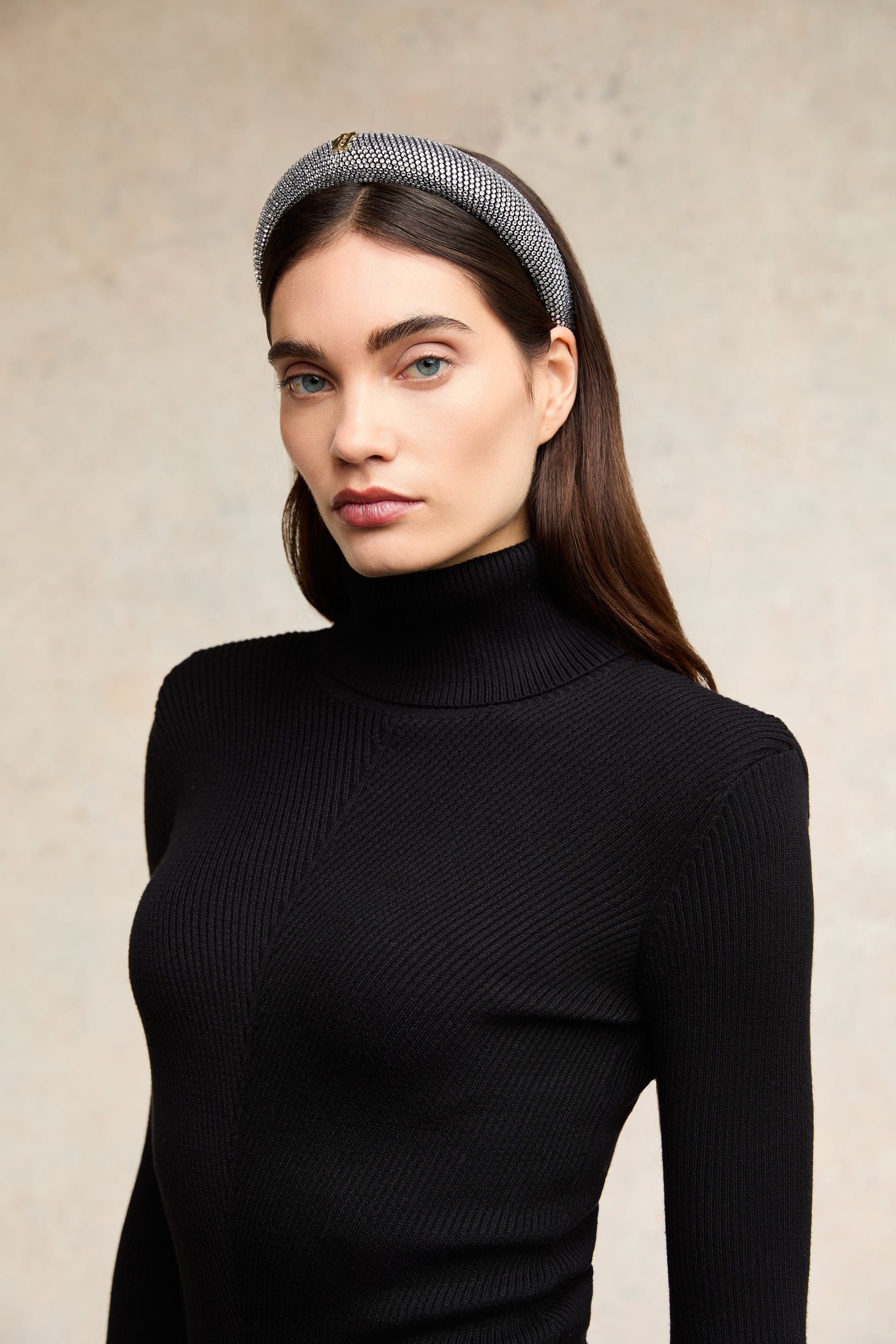 A sleek and elegant accessory that adds just the right amount of sparkle to your look. Featuring our iconic branding with a shimmering crystal inlay. this headband offers a refined and sophisticated touch. The narrow design provides a subtle yet chic accent. making it perfect for both everyday wear and special occasions.