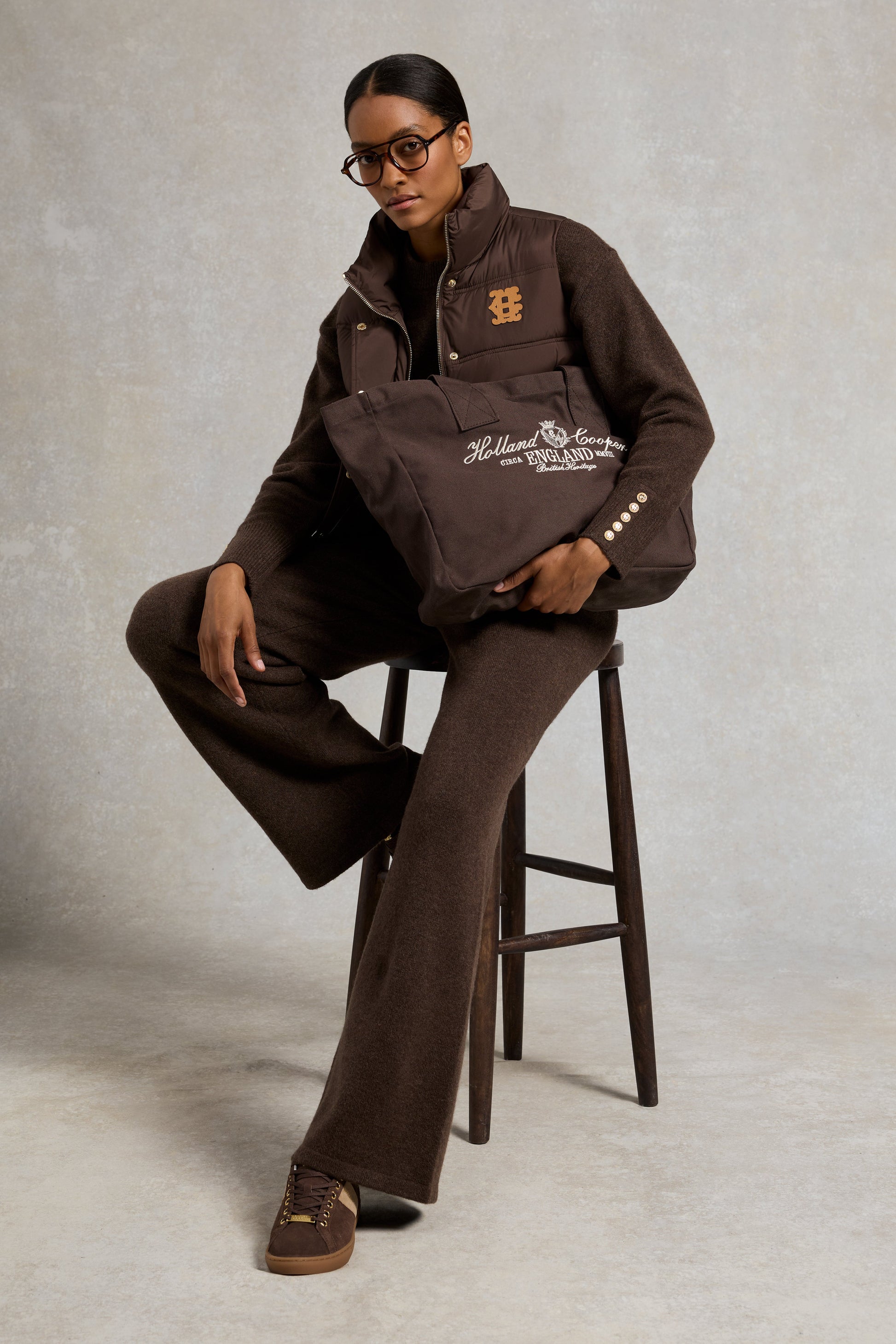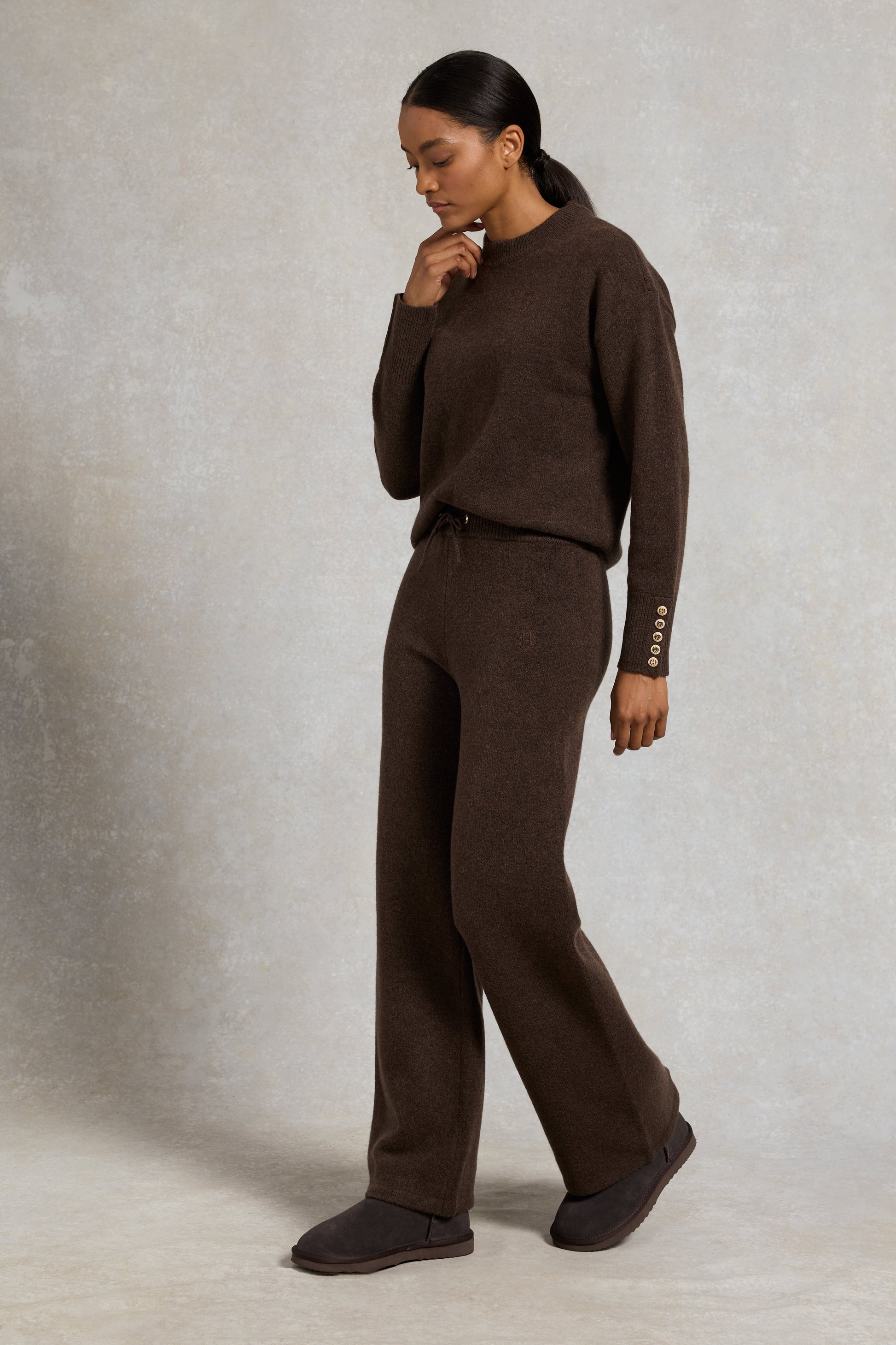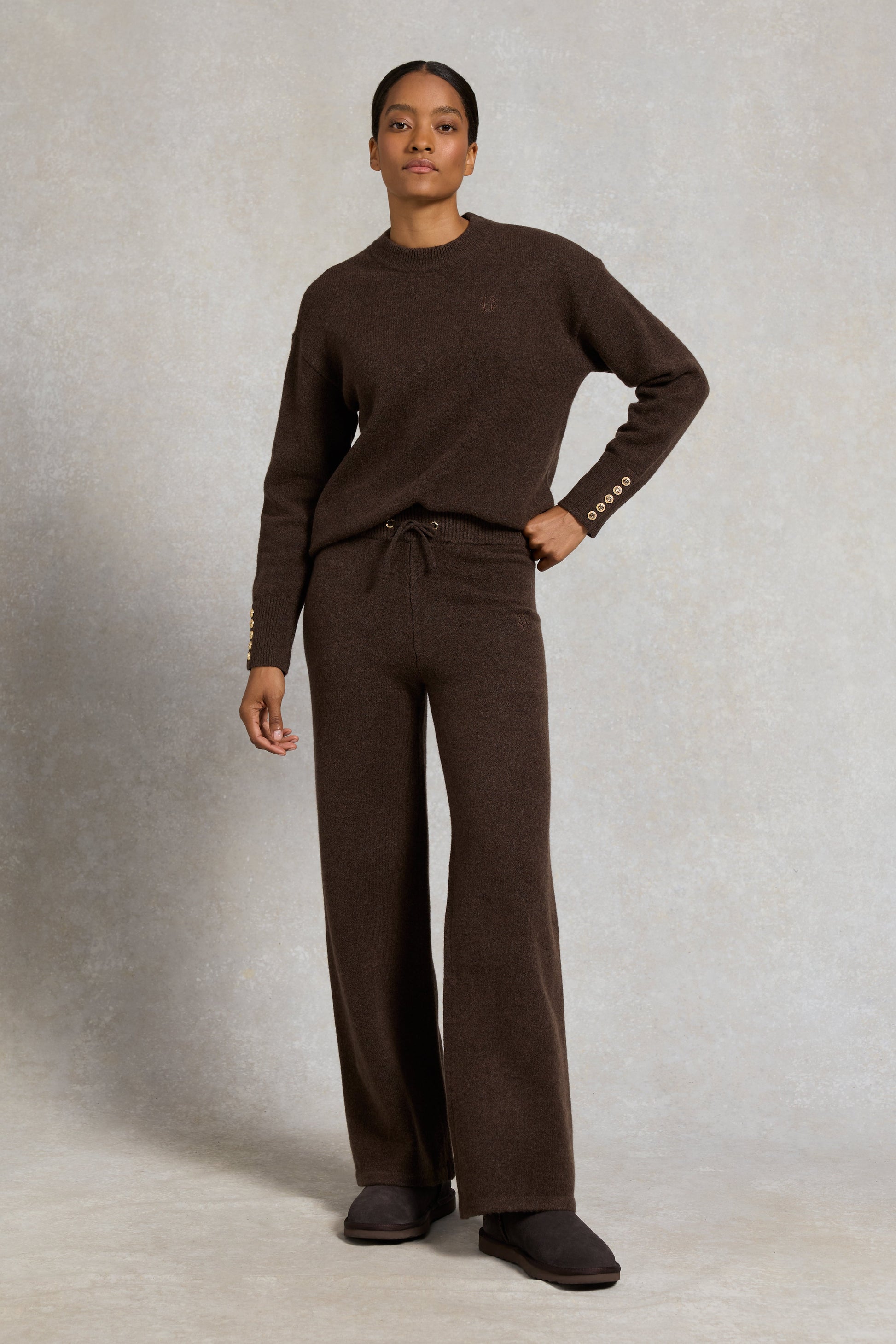Designed for both comfort and style. the Nina Knitted Wide Leg Pant features a relaxed fit with self-fabric drawcords and tonal HC embroidery at the hip. Crafted from easy-care yarns. they're perfect for everyday wear. Pair with the matching knit for a coordinated loungewear look. or style separately for an effortlessly chic off-duty outfit.