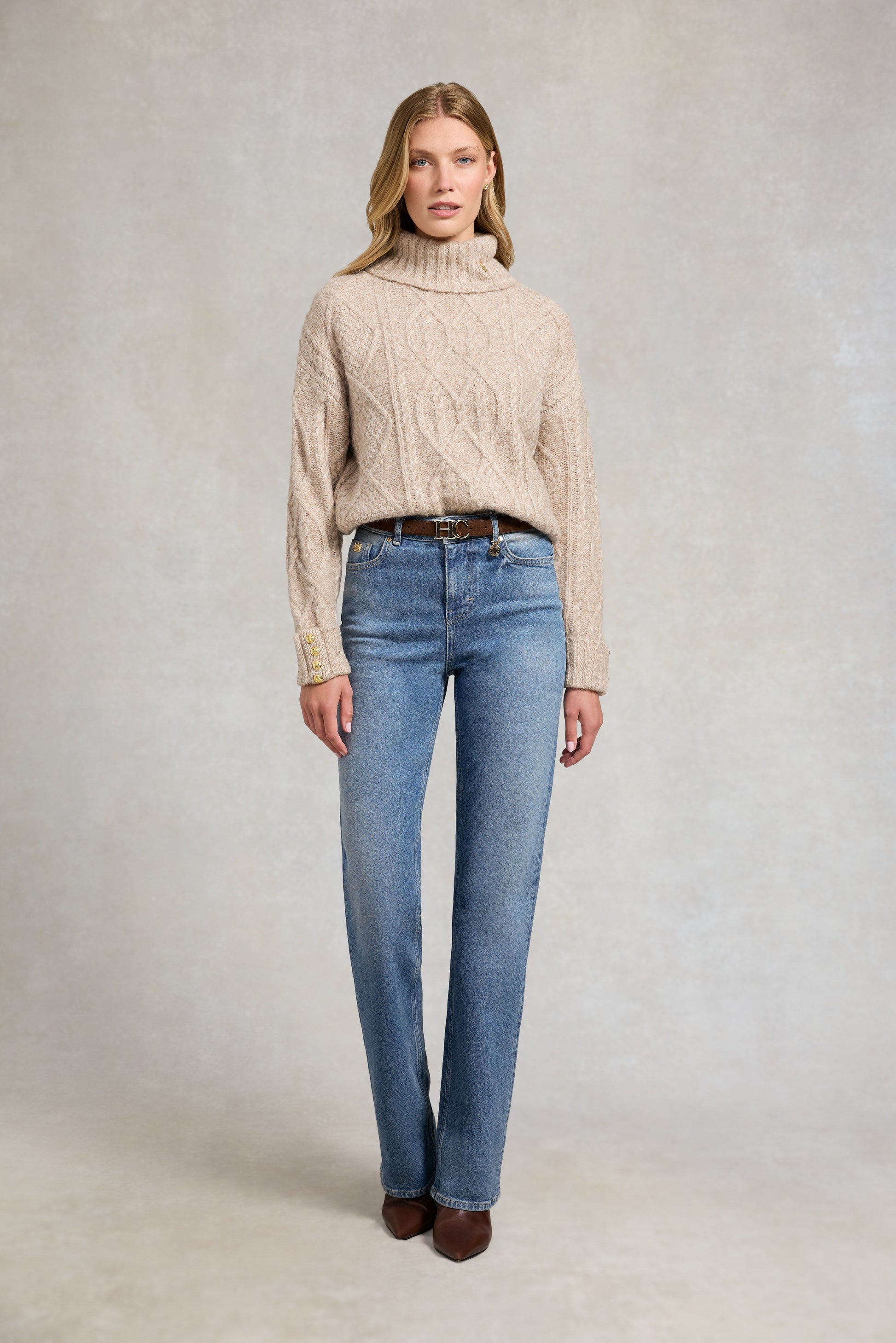Crafted from a sumptuously soft yarn. newly enriched with subtle multi-tonal hues for added depth. this knit features a modern cable design for texture and interest. The boxy fit and drop shoulders create a contemporary. relaxed silhouette. while signature gold rivets on the cuffs and HC hardware at the collar add refined finishing touches. Elevated for the season. this versatile piece brings a sophisticated update to your knitwear collection.
