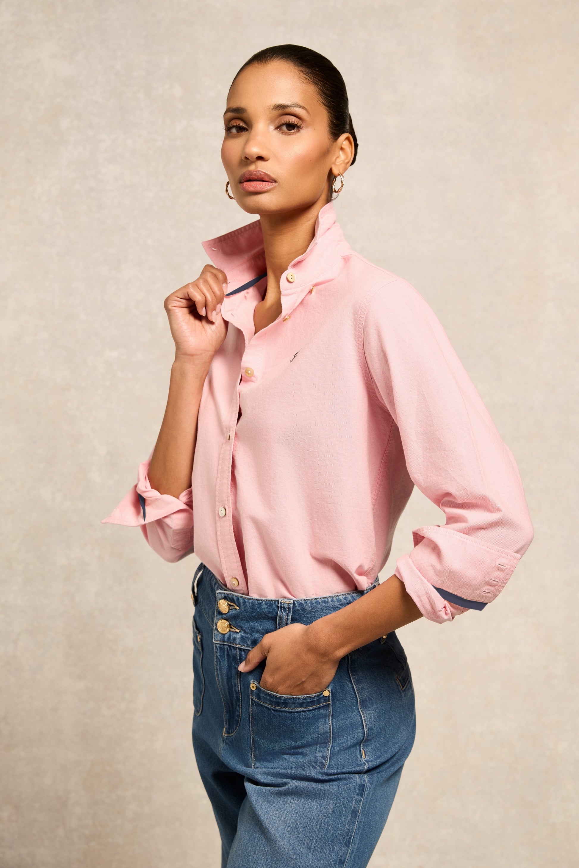 Timeless. versatile and effortlessly polished. our Oxford Shirt is a wardrobe essential designed to elevate your everyday style. Crafted with a classic button-down collar and traditional button-through front. this piece blends heritage charm with a contemporary silhouette. The contrast HC embroidery to the chest adds a refined touch. while our signature Holland Cooper branded buttons lend a premium finish.