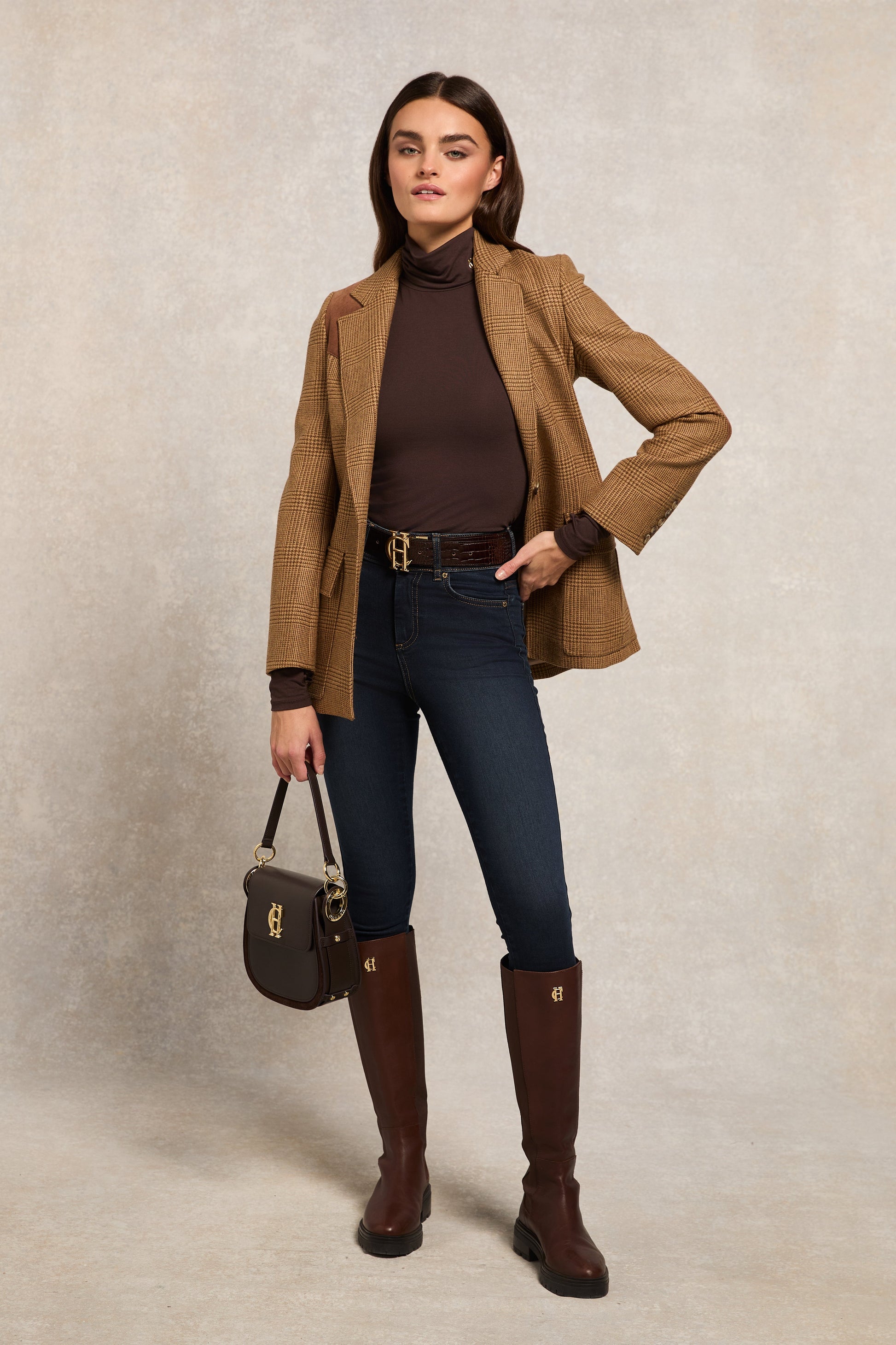 This sophisticated essential features our iconic HC plaque detailing and an exquisitely ruched neckline. creating an effortlessly elegant silhouette. The considered design includes a concealed centre-back zip for a streamlined finish. The sumptuous fabric composition ensures both comfort and durability. while maintaining its impeccable shape wear.