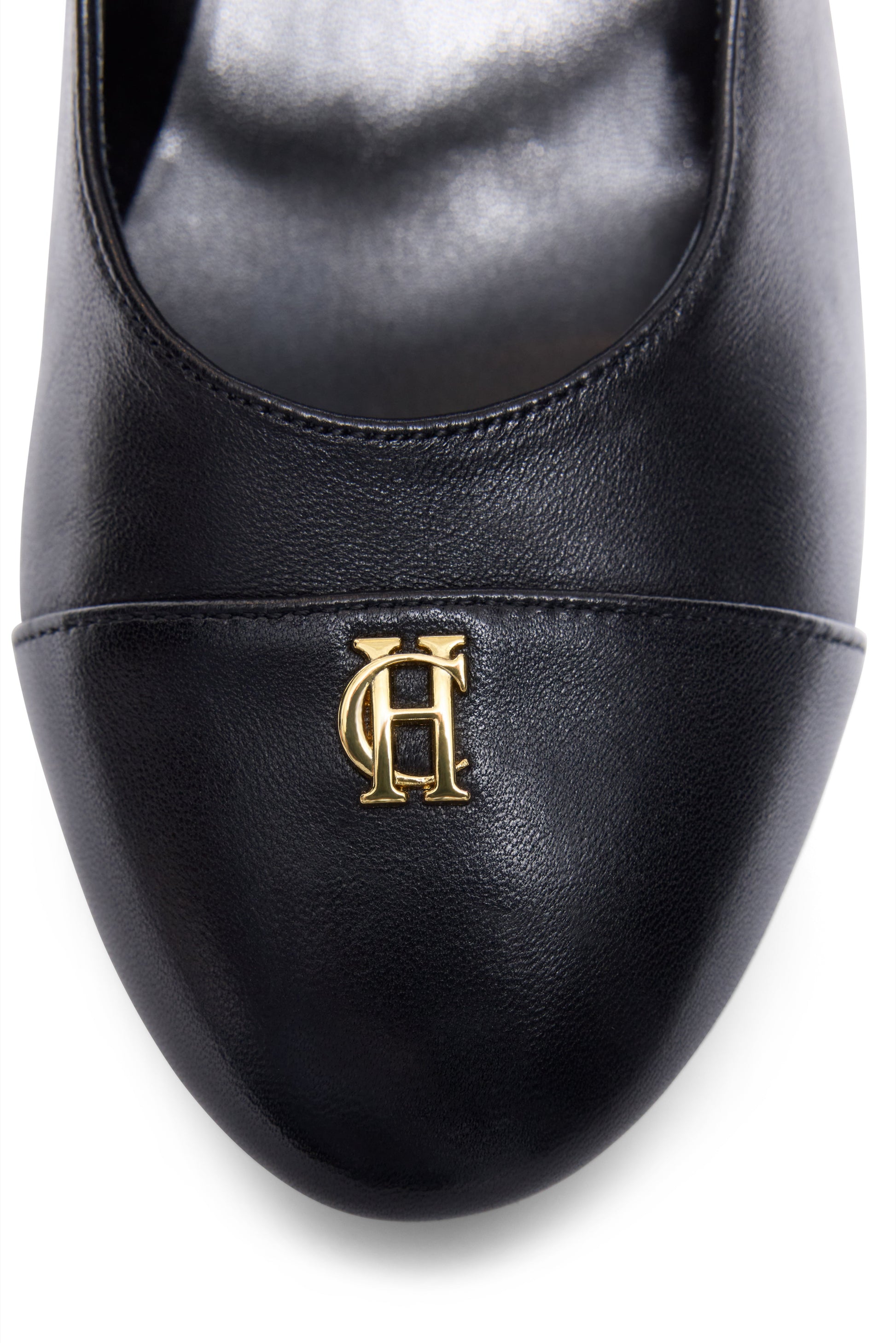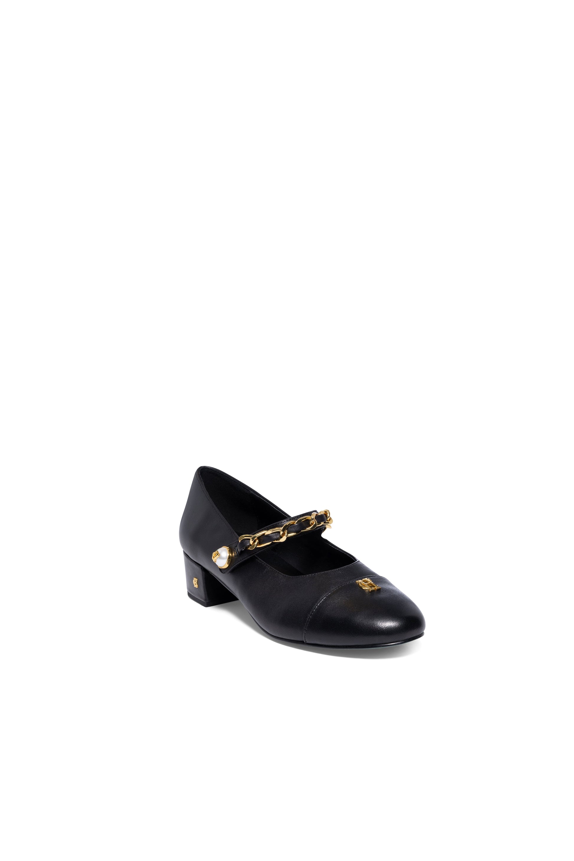 A modern take on a timeless classic. this elegant ballet shoe features a mid-height heel for effortless day-to-evening wear. Crafted from premium cow leather with a soft matte finish. the design is elevated with a delicate gold chain strap and a branded pearl snap detail. Finished with a comfort footbed and durable outsole for all-day support and style.