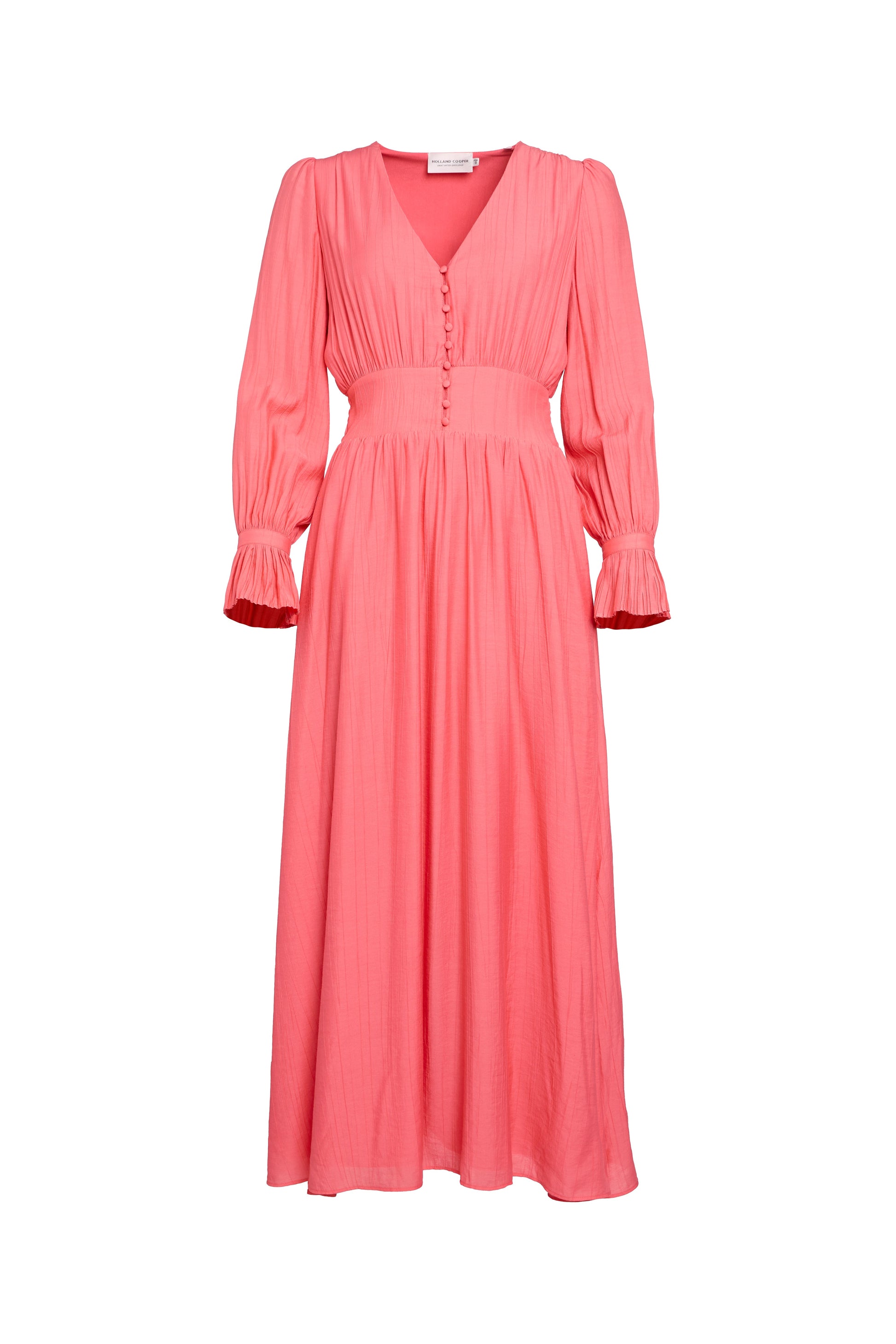Designed with a maxi length. this dress features a modest v-neckline with self-covered buttons at the centre front for a touch of elegance. Delicate sleeve details and fluted cuffs add a subtle charm. while the elasticated shirred back panel ensures a perfect fit. Designed for convenience. this dress comes with a fully lined skirt and side-entry pockets. The signature gold hardware at the cuffs adds a hint of sophistication.