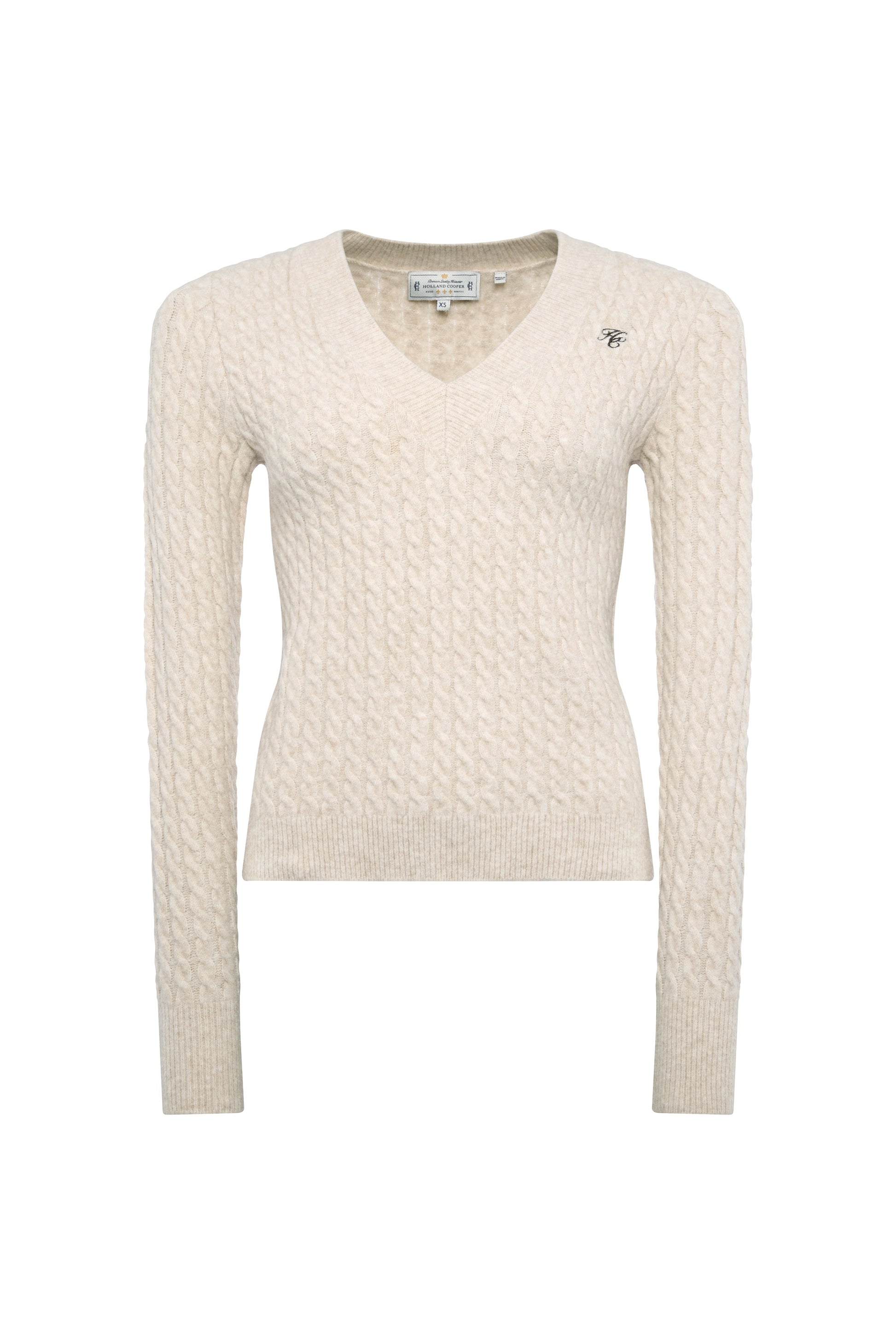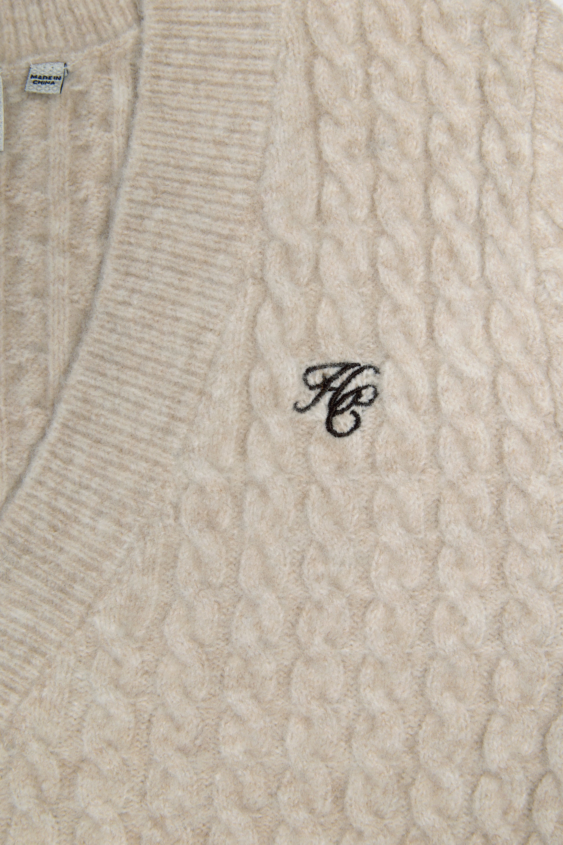 The Polly Knit combines comfort and sophistication with a relaxed fit and slim. set-in sleeves. The V-neck cable knit design is elevated with a contrast embroidered HC logo at the chest. adding a signature touch. A true wardrobe essential. it's perfect for any occasion. whether layered or worn on its own.