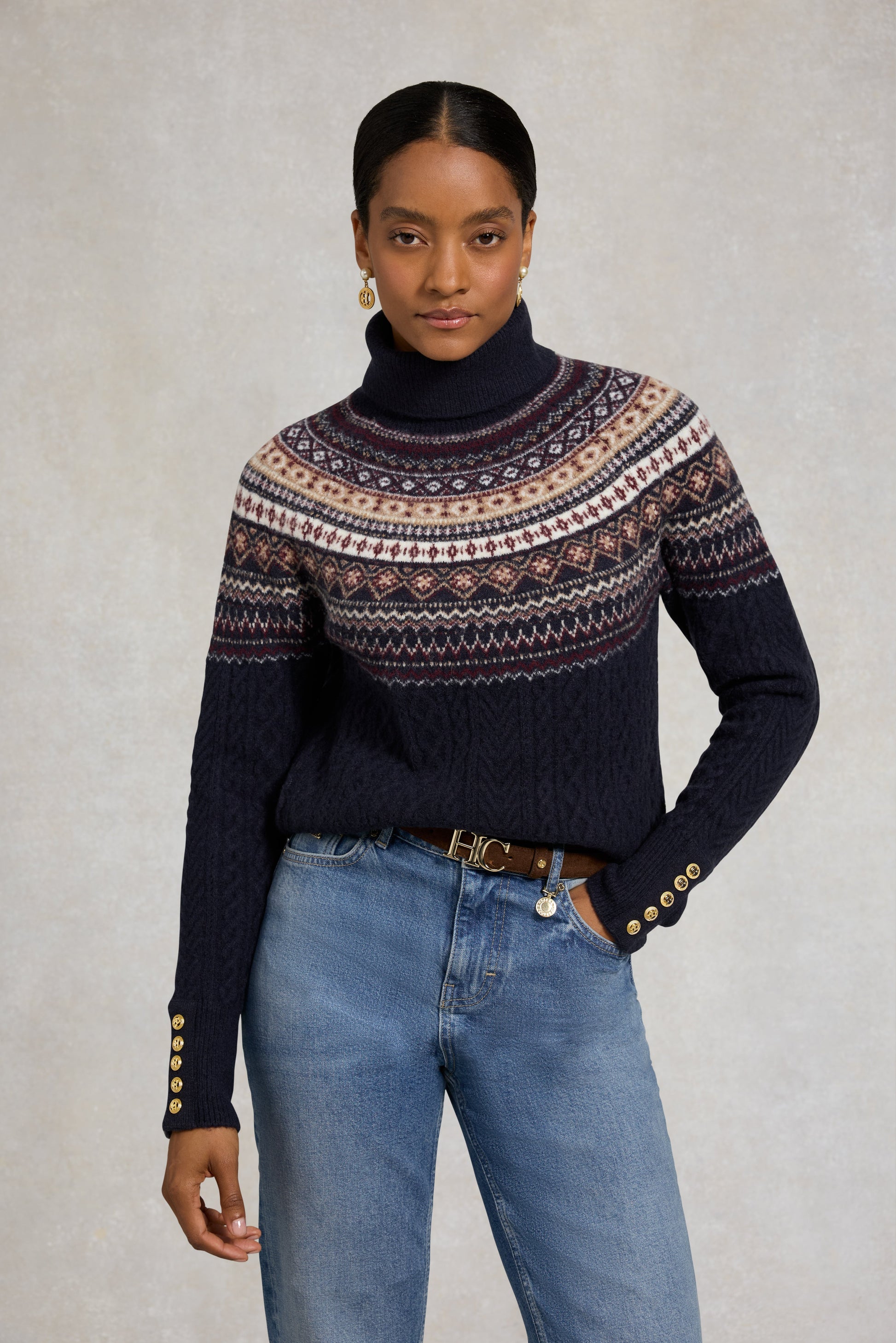 Crafted from a soft wool blend. the Rebecca Roll Neck Knit combines timeless Fair Isle and cable-knit details with a contemporary relaxed fit. Raglan and blouson sleeves create a modern silhouette. while subtle hardware on the cuffs and a signature HC Heraldic plaque at the neckline add refined finishing touches. Perfect for layering or wearing on its own. this versatile knit is a stylish wardrobe essential.