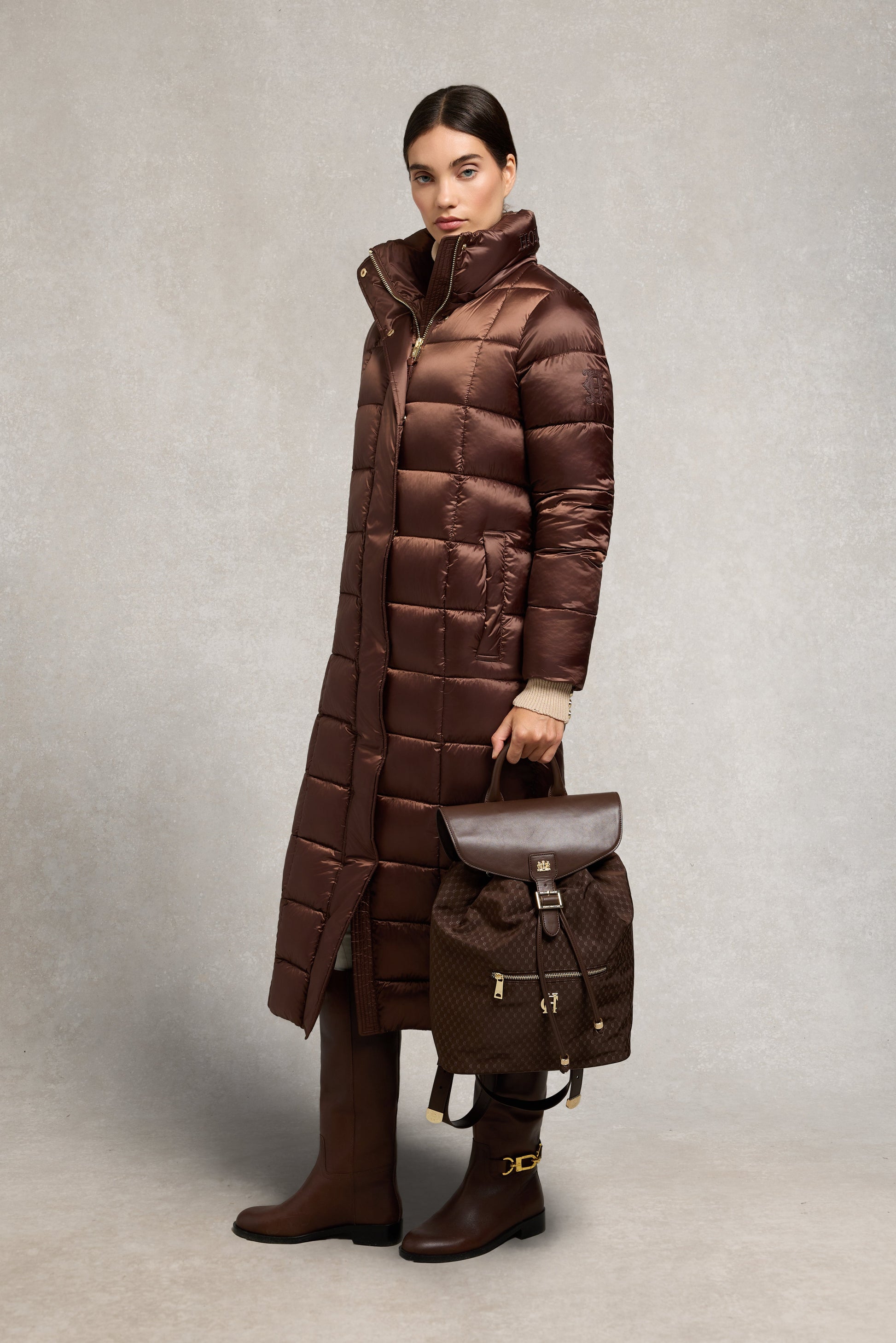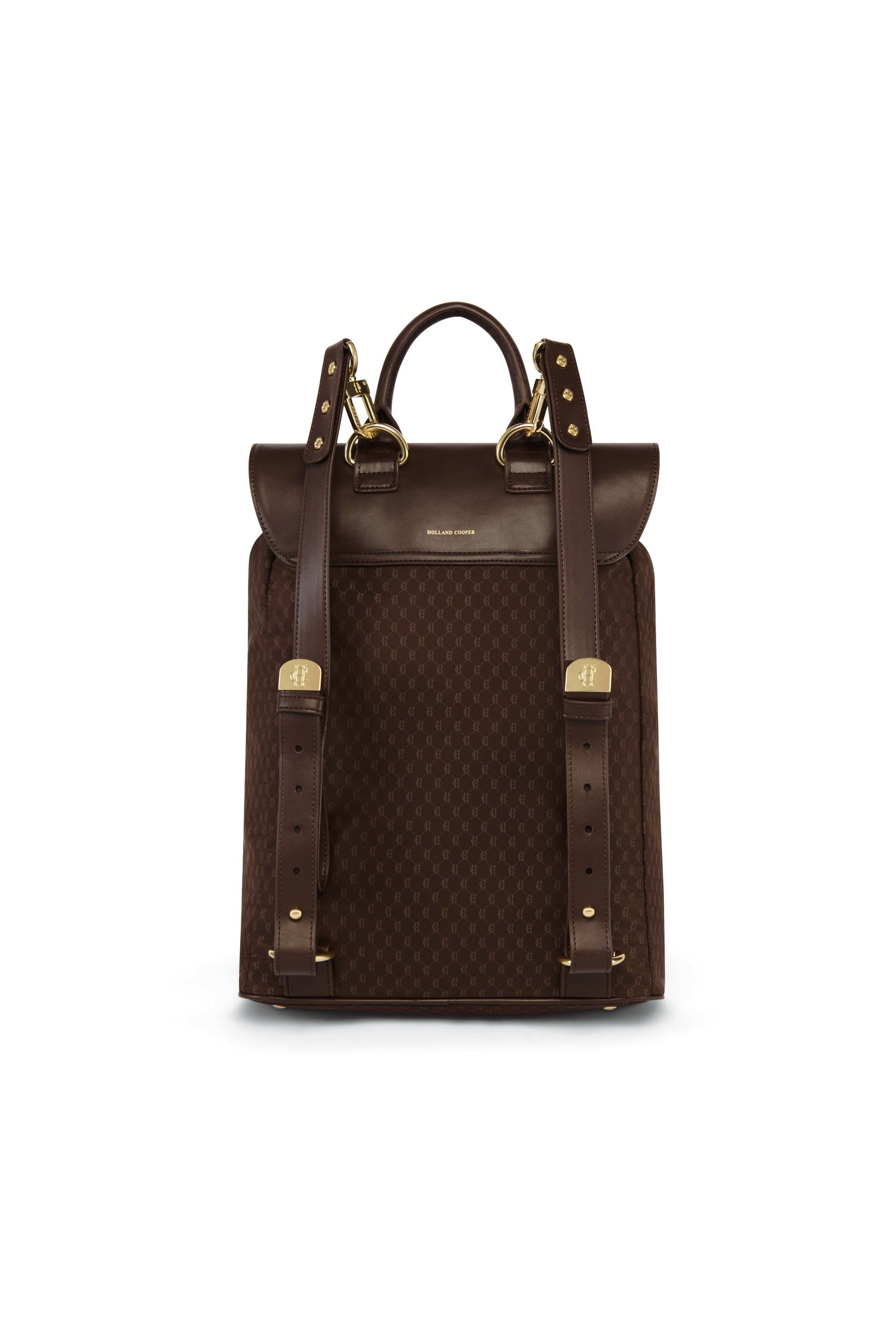 This fully branded. showerproof backpack features our iconic monogrammed upper. making a stylish statement while offering practical protection against the elements. Fully lined to guard against rain. it ensures your belongings stay dry and secure. Crafted with premium recycled PU trims and adorned with our iconic HC hardware. the Burghley Backpack seamlessly combines sustainability with luxury. Perfect for any season. this backpack is the epitome of functional elegance.