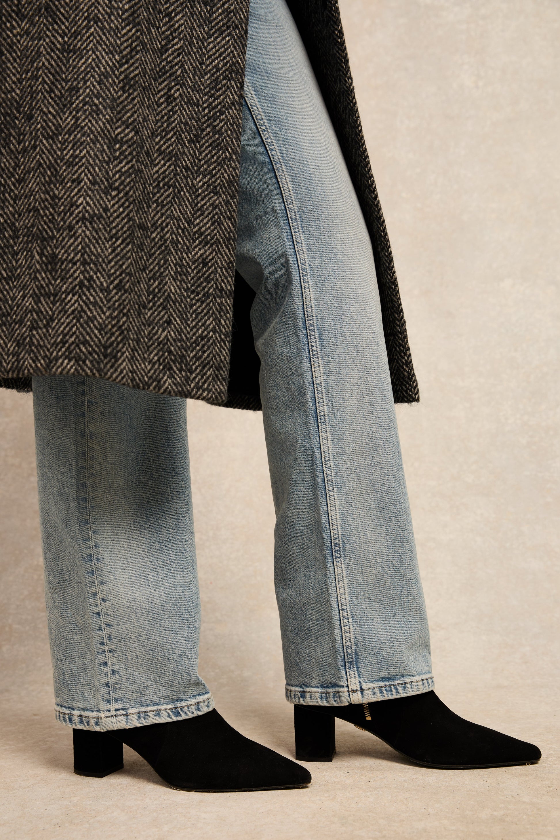 This miracle boot is designed for effortless elegance and all-day wear. Featuring the perfect heel height for both style and comfort. its refined block heel is wrapped in premium suede for a sophisticated finish. The sleek pointed toe enhances its timeless silhouette. adding a touch of sophistication to every step. The luxuriously soft leather lining ensures a plush feel. while the polished gold-tone zip closure adds a refined touch.