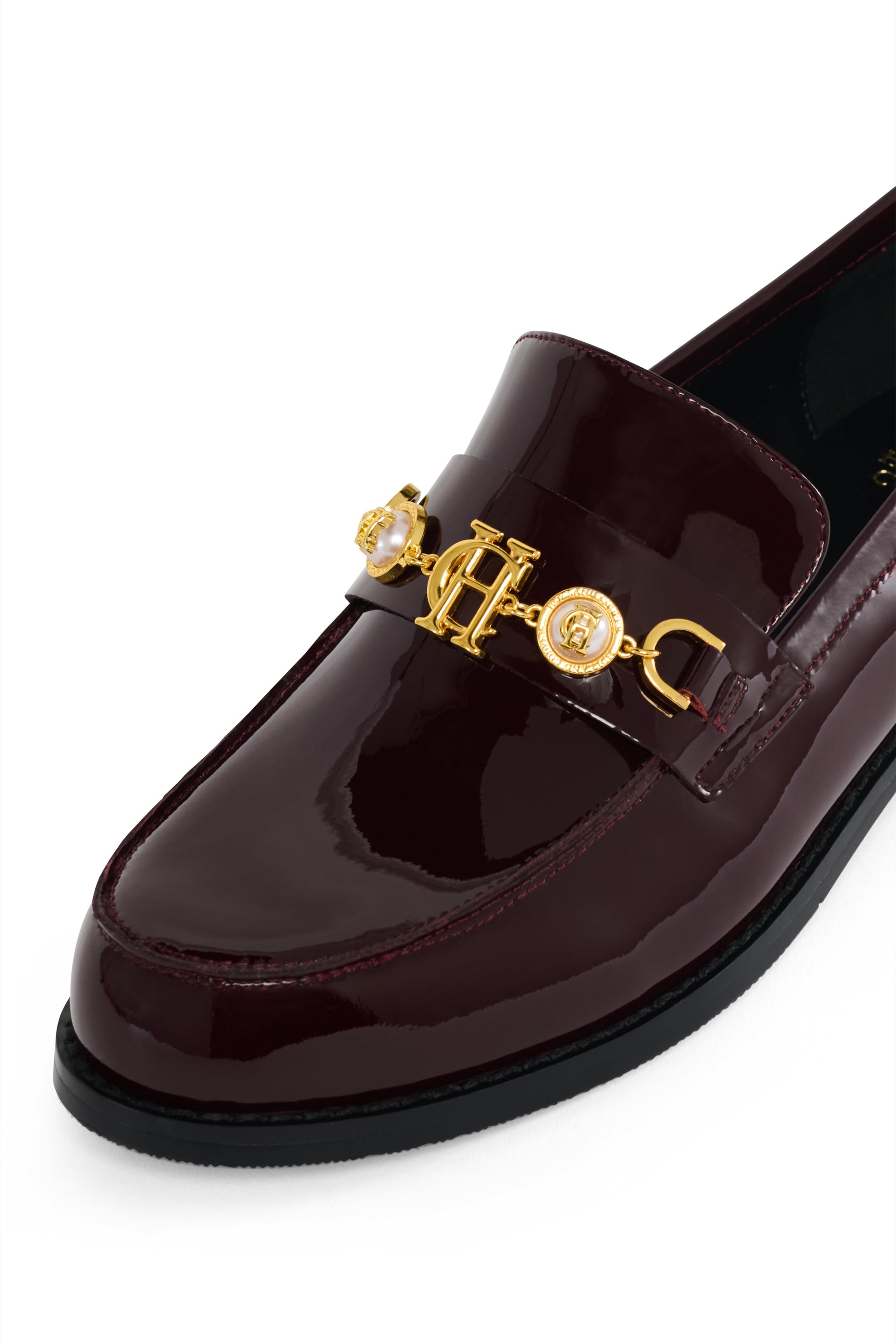 A modern twist on a classic loafer. the Regency Pearl Loafer is crafted in high-shine patent cow leather with a sleek black outsole. The top is adorned with a new signature pearl and logo chain. adding a refined. contemporary touch to this timeless silhouette. Perfect for elevating both smart and casual outfits. it embodies understated elegance with Holland Cooper's iconic detailing.