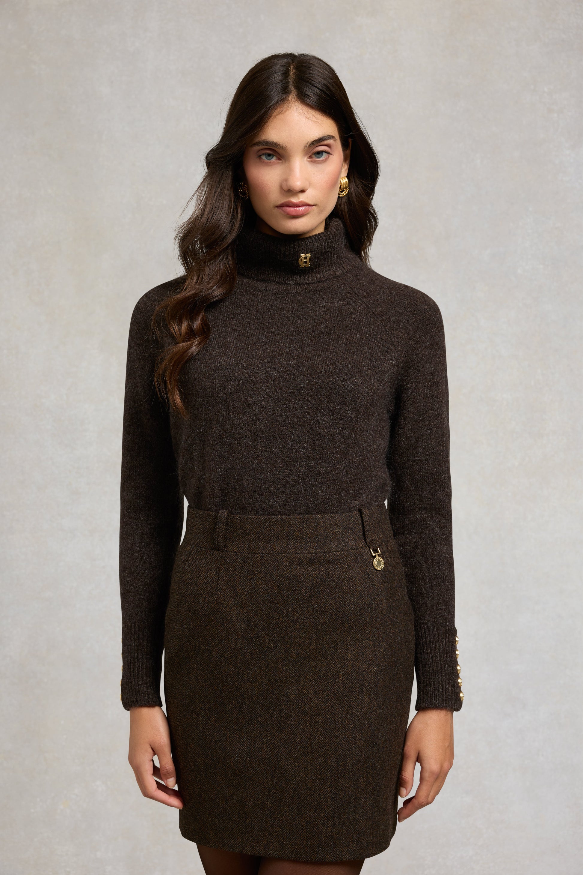 Enhanced by our iconic signature gold medallion. this classic pencil skirt is a timeless staple for your wardrobe. Handmade in the UK from English wools. it has a figure-hugging silhouette that has been designed to sit on the waist. Fully lined for comfort with a concealed zip on the back. this skirt has been created to fit perfectly into your everyday wardrobe.