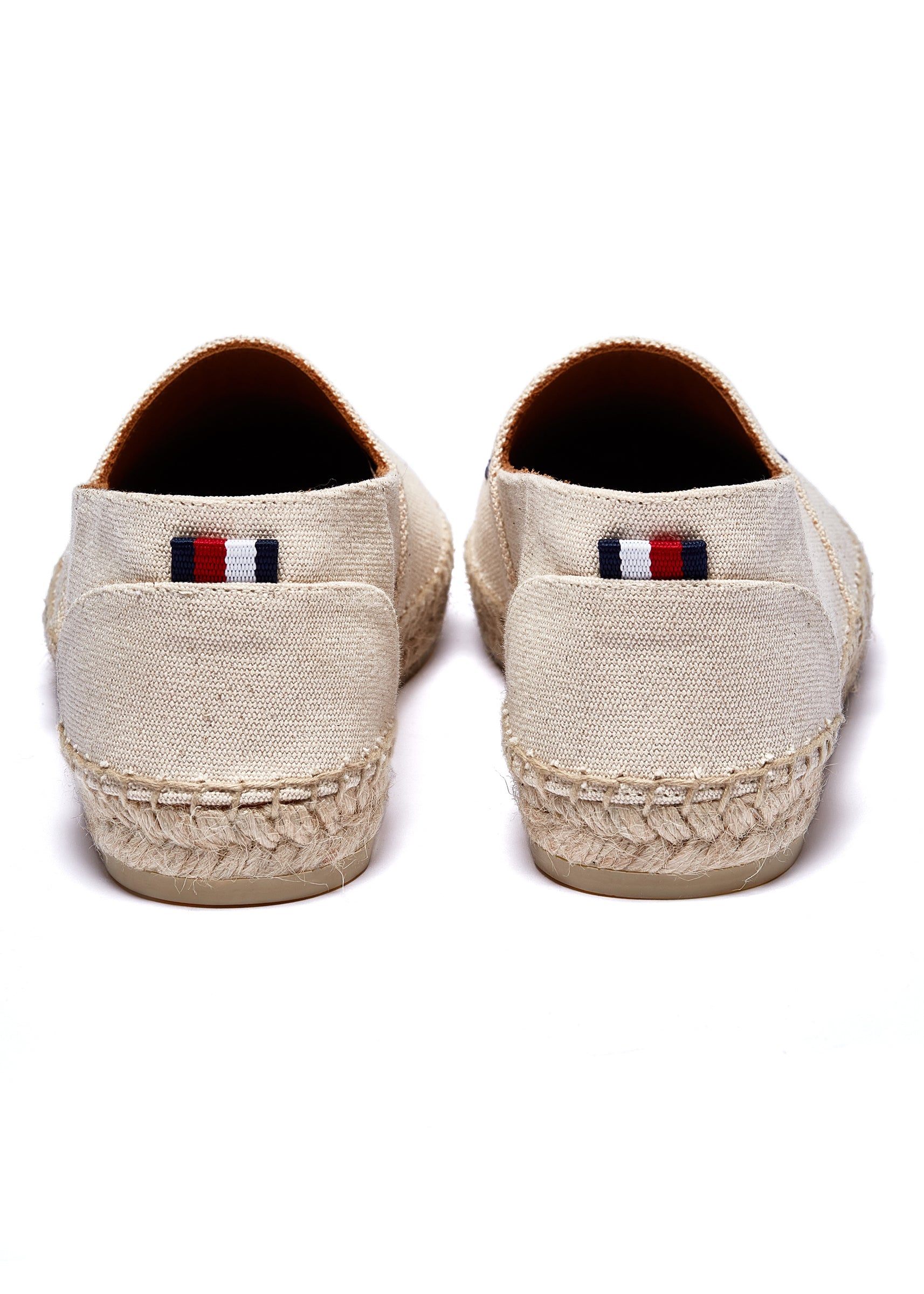 Designed in a traditional espadrille style. these shoes have been beautifully made in Spain. Created from a canvas fabric and set on a braided jute sole with rubber threads. Detailed with high build HC embroidery with a tri-colour tab to the heel.