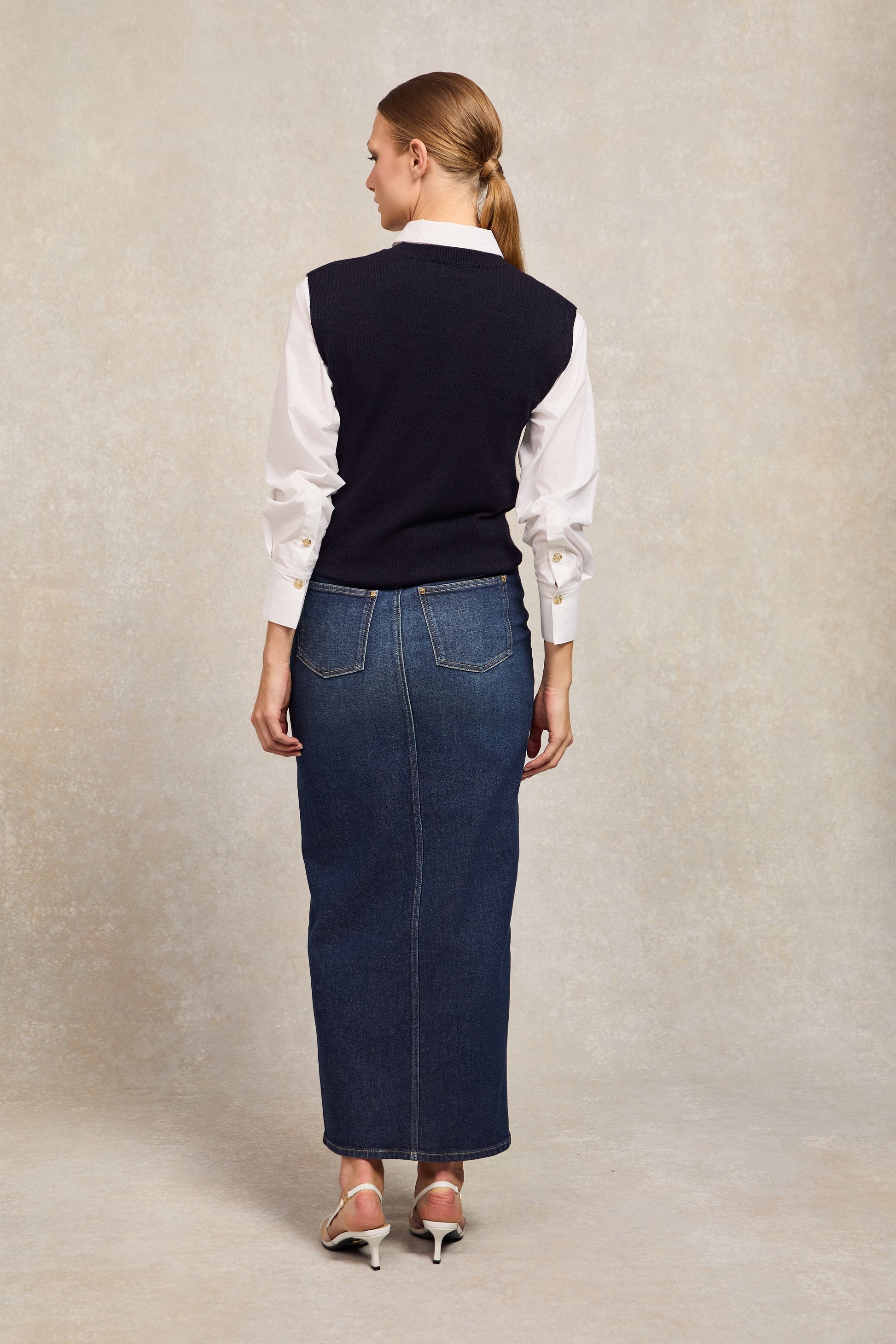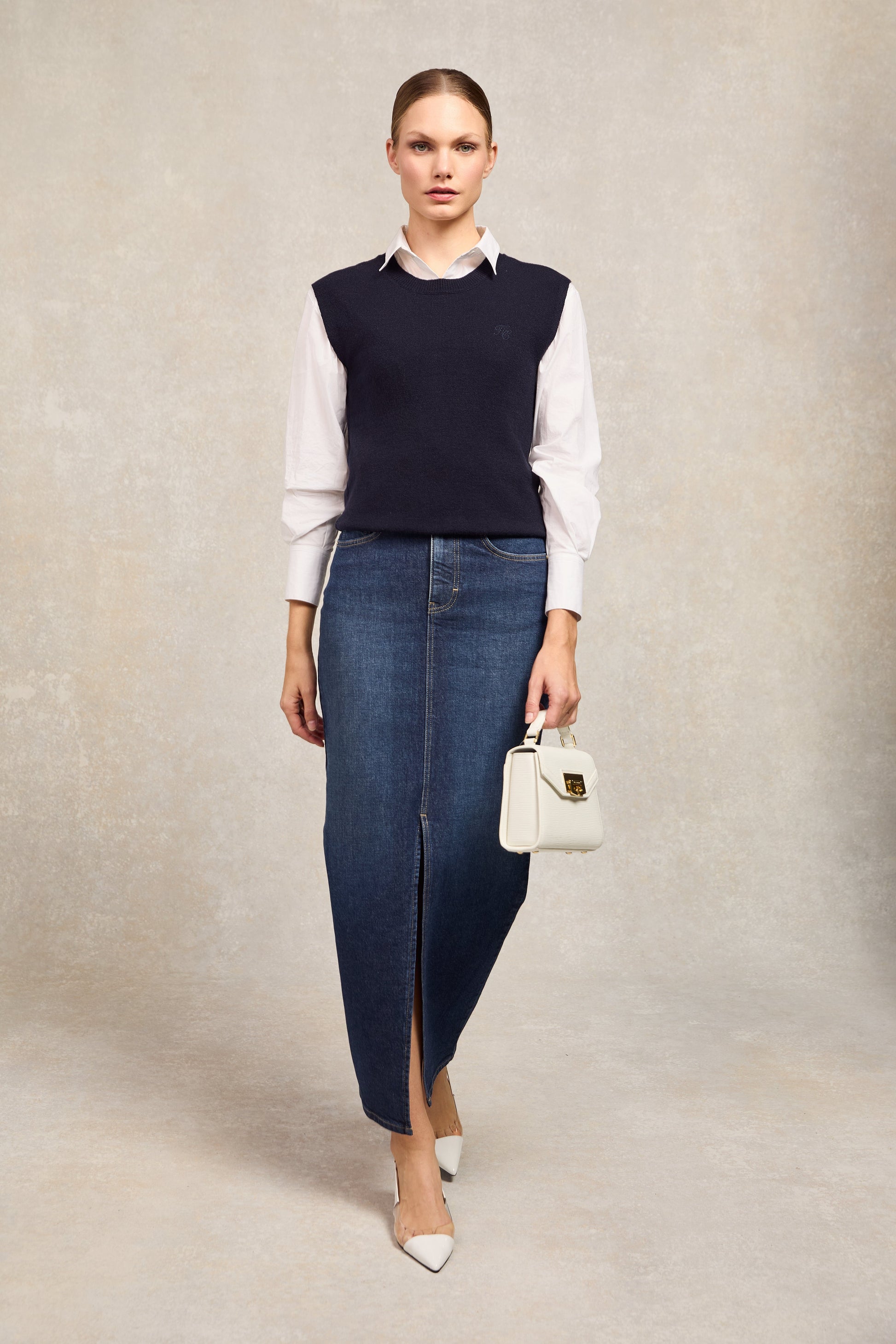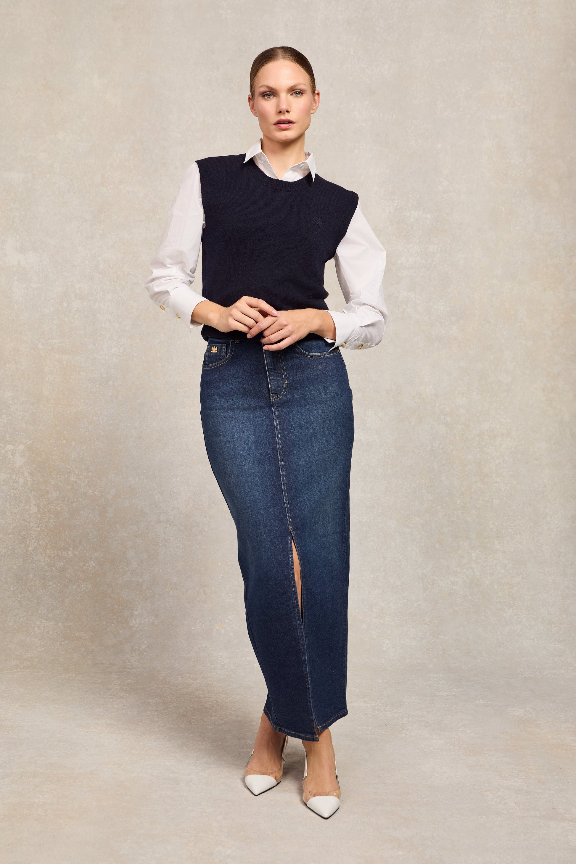 Elevate your wardrobe essentials with the Sarah Knitted Tank. Crafted from a sumptuous blend. this tank top offers a luxurious yet lightweight feel. perfect for layering or wearing solo. Designed with a loose fit and a classic crew neck. it ensures comfort without compromising on style. The tonal script HC embroidery subtly adorns the chest. adding a touch of understated elegance. Ideal for both casual and sophisticated looks. the Sarah Knitted Tank is a versatile addition to any wardrobe.
