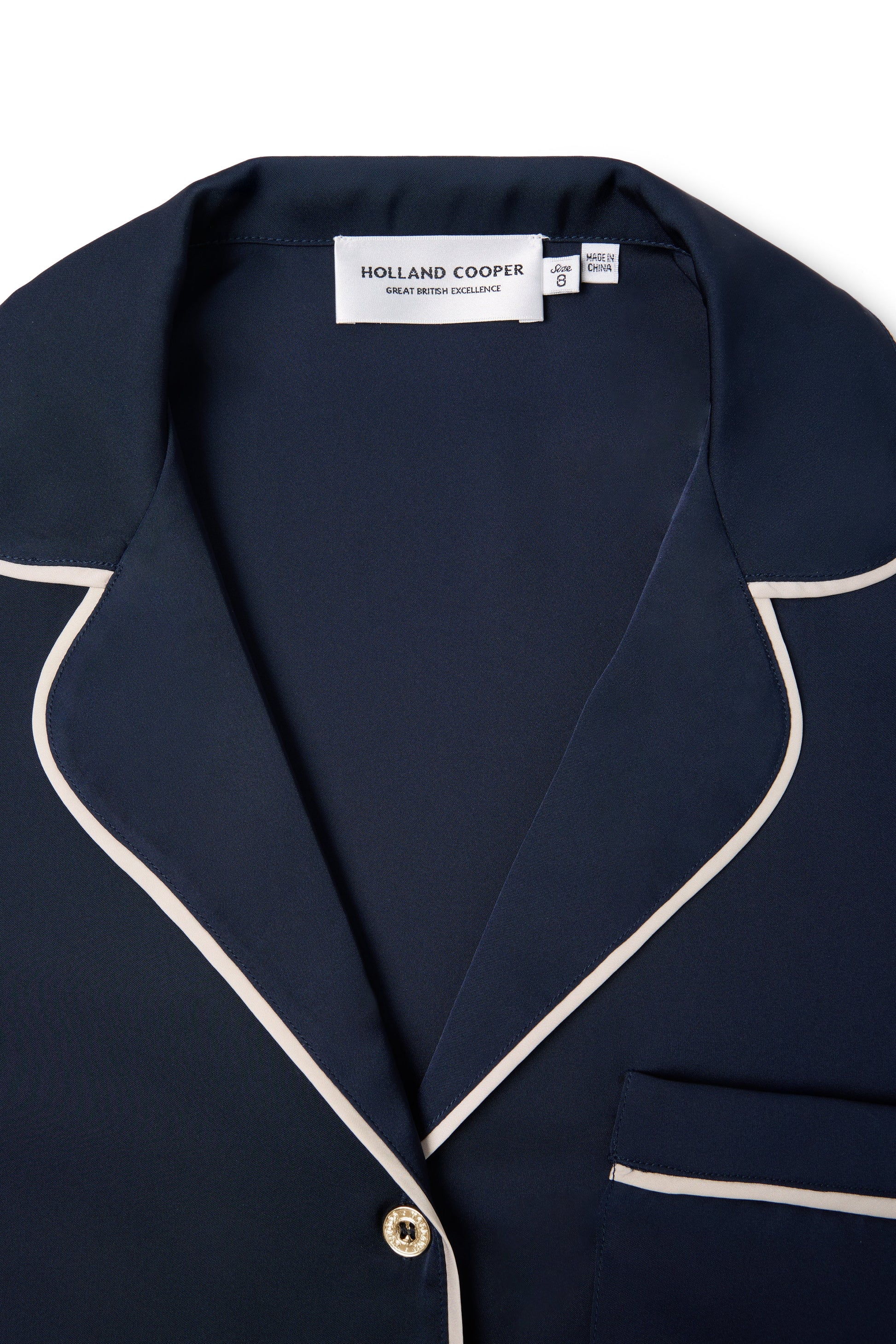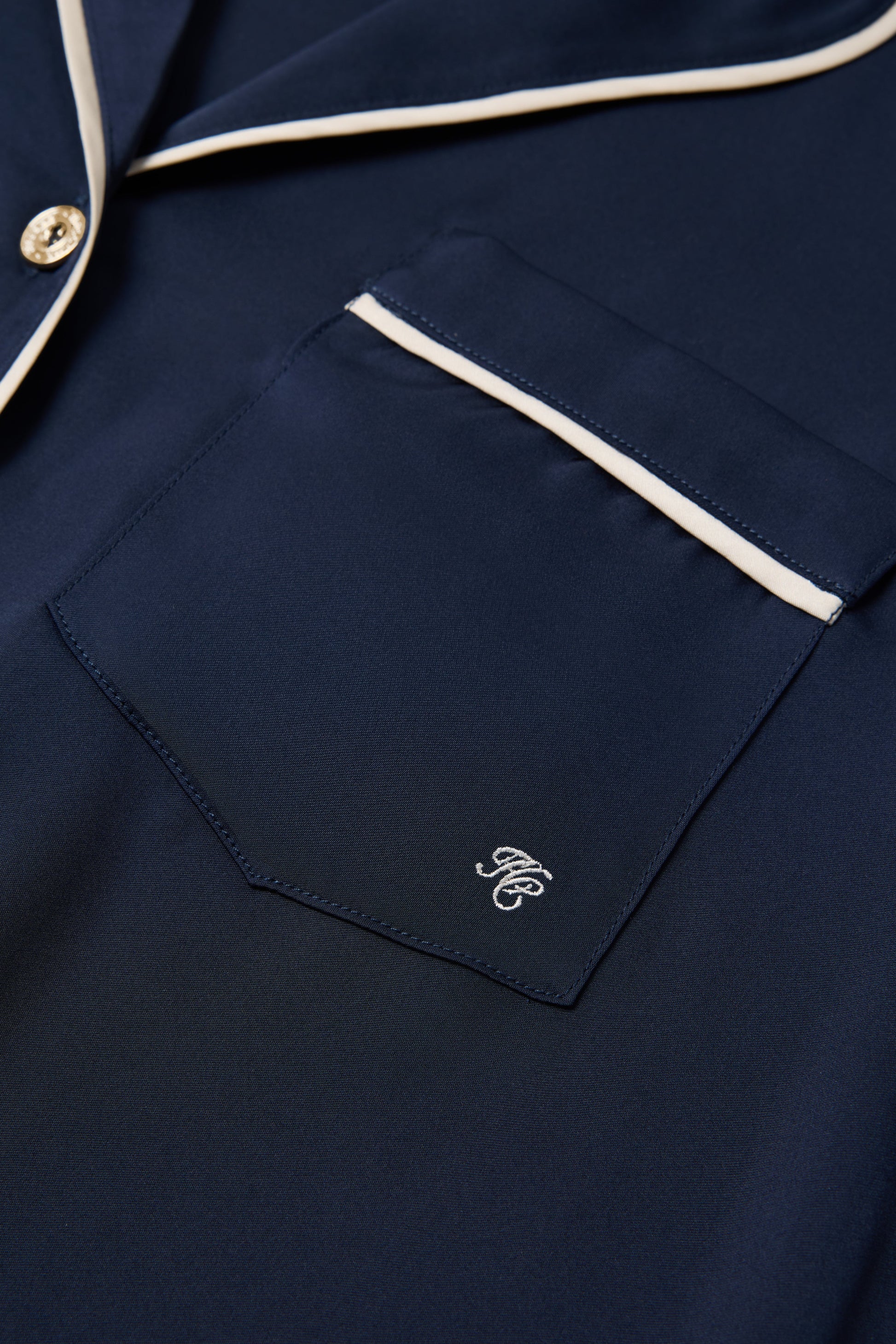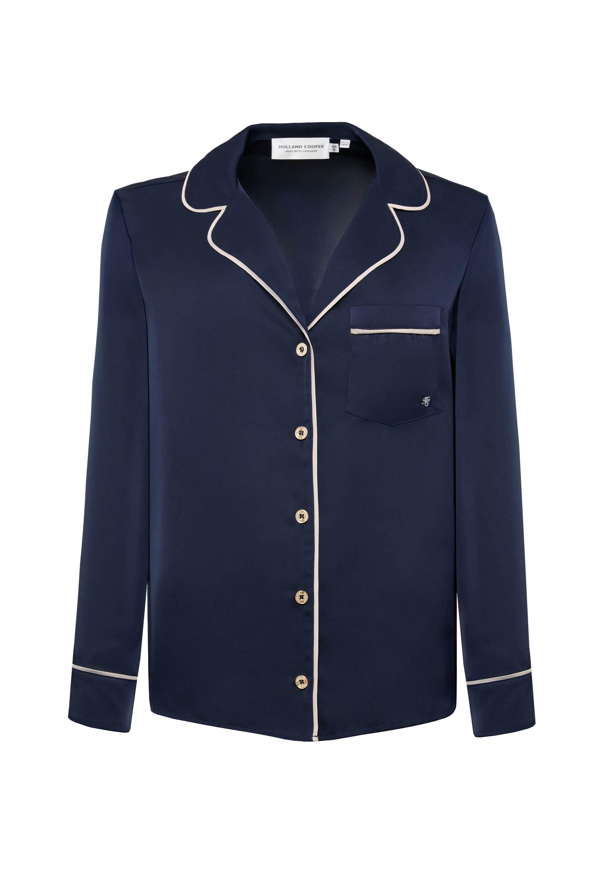 This long-sleeve pyjama set brings effortless elegance to your downtime. The shirt-style top features an open collar and lapel. with contrast satin piping and signature gold HC buttons for a touch of luxury. A patch pocket embroidered with our HC monogram adds a refined detail. while the matching trousers are finished with a contrast half-tie waistband for comfort and style. Perfect for elevating your loungewear or gifting as a timeless set.